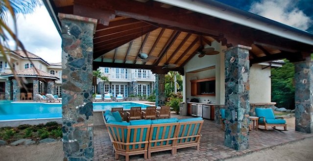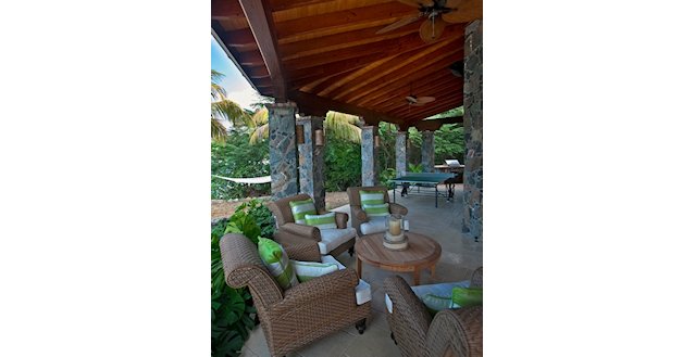 Outside the Main Villa on the Great Cruz Bay side is A La Mer's shaded poolside terrace, furnished with plush upholstered seating for watching the kids in the pool, reading or napping, and a large round table under a roofed pergola for alfresco meals. The pass-through from the kitchen is incorporated into an adjoining counter lined with bar stools. This expansive outdoor living area, where you'll spend most of your time, also has two gas grills, one of them built into a charming garden patio, a Ping-Pong table for family championship competitions, and a deck lined with cushioned chaise lounges for sun worshippers. The pool is absolutely spectacular! It has a four-inch deep shallow shelf, perfect for sun loungers and for small children, a waterfall, and is bordered on the ocean side with a "beach," a strip of white sand set with more chaise lounges and a stone fire pit. The pool also features a swim-up bar with underwater bar stools at the pool cabana, a wonderful poolside entertainment pavilion with large-screen cable TV and DVD player, plus a wet bar with icemaker, beverage cooler and dishwasher. An electronic shutter rolls down at a touch of a button to secure the pool cabana when not being used. The pool cabana also has a handy powder room and outside shower. For experienced divers, there is access from the coral-and-sand waterfront into Great Cruz Bay for snorkeling - and you can also visit The Westin Resort's lovely white sand beach further down the Bay, about a 10-minute walk away.