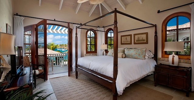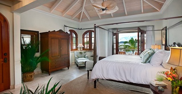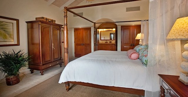 Twin mahogany staircases ascend from either side of the family room to A La Mer's upper floor, where five more air-conditioned bedroom/suites overlook the pool and majestic yachts riding at anchor on sparkling Great Cruz Bay. These suites all enjoy central air-conditioning, large en-suite baths tiled in charming designs, and via screened French doors, each has its own balcony. One of these five upstairs suites is A La Mer's master suite, a larger suite with a king four-poster bed, a private roofed patio with seating, and a spacious bath. The sumptuous master bath features a double vanity, a separate WC with a bidet, and a semi-alfresco double shower clad in glass tile and travertine. The other four suites have romantic four-poster king beds and en-suite baths (the corner suite has a tiled semi-alfresco shower). Two of these suites have a connecting door between them, perfect for parents who wish to be near their children. At the top of one staircase is an alcove with a desk with a printer and a two-twin trundle bed for children under 16 years.