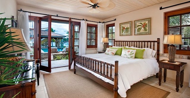A La Mer's Cottage is off to the side of the Main Villa, and on its upper level, offers a secluded fully-air-conditioned apartment suite, complete with a full kitchen, a bedroom with two queen beds and bath, a double-twin trundle bed in the living area for children under 16 years old, and a porch outside covered by latticework. The estate's ninth bedroom is on the ground level; it's a cozy and simple air-conditioned bedroom and bath with two twin beds. The Cottage's garage contains beach chairs, coolers, and a washer and dryer for your convenience.