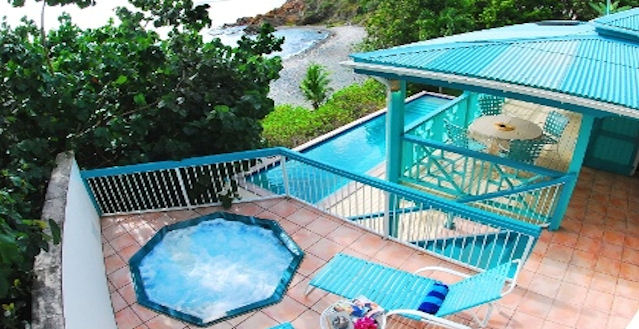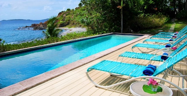 This lovely St. John villa glistens in the afternoon sun. The lush tropical landscaping surrounds you as you sunbathe, beach comb, swim and snorkel in the warm waters of the Caribbean Sea or just lounge around the pool all day long.