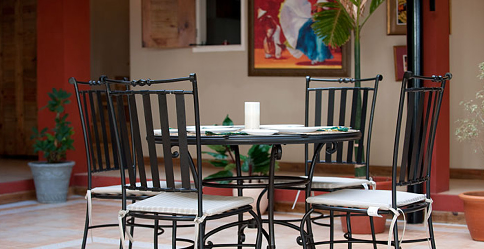 The foyer flows into a mini-cocktail lounge, replete with bar-stools and all necessary accoutrements. The wooden Adirondack chairs in the adjacent courtyard are a popular spot for the ladies to recline with their refreshments. Tasteful comfort and simplicity: a perfect blending of form and function, with none of the excess and exaggeration too often mistaken for elegance.