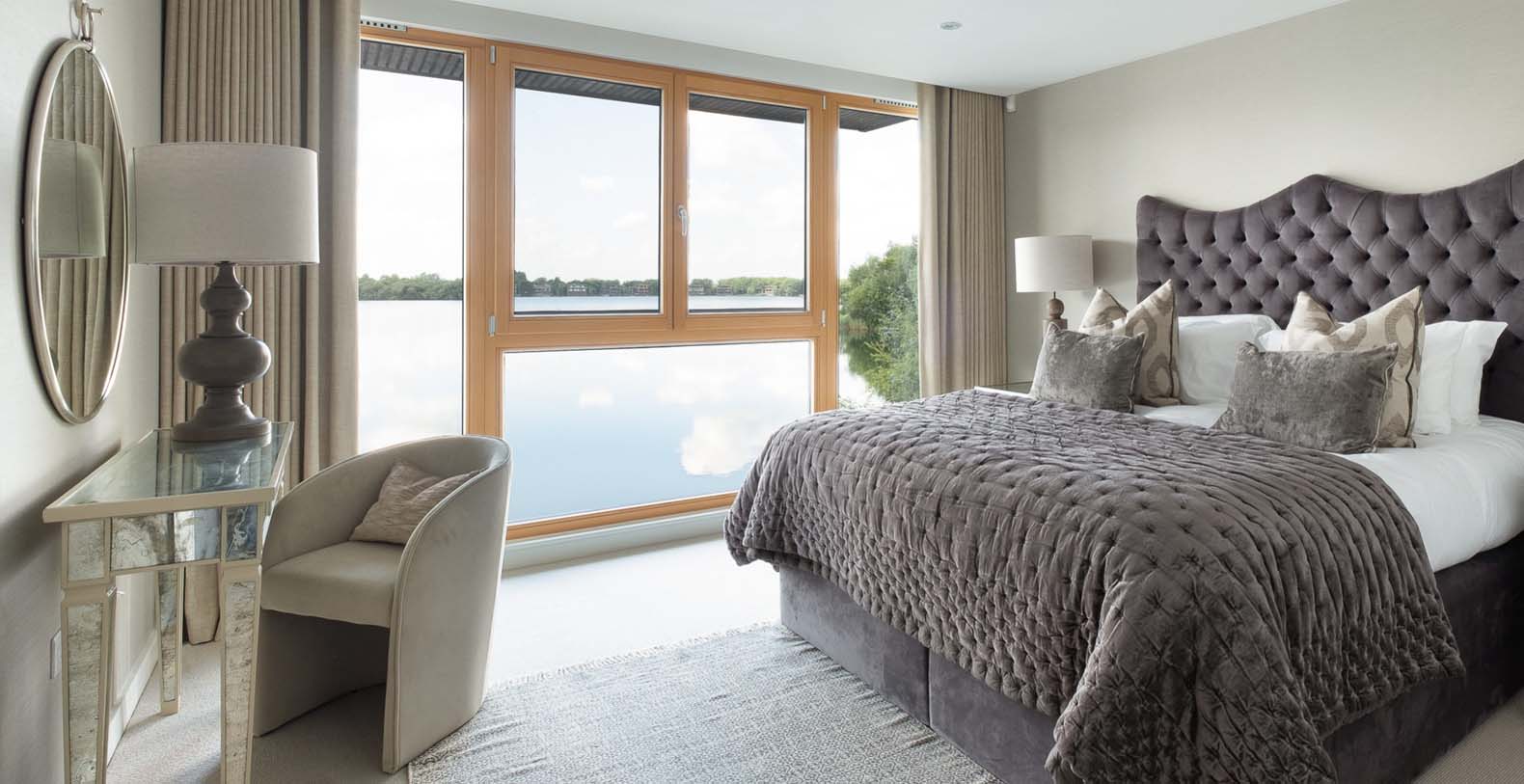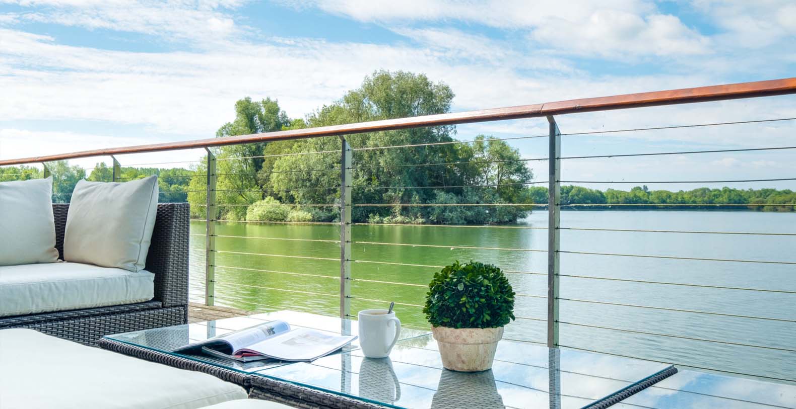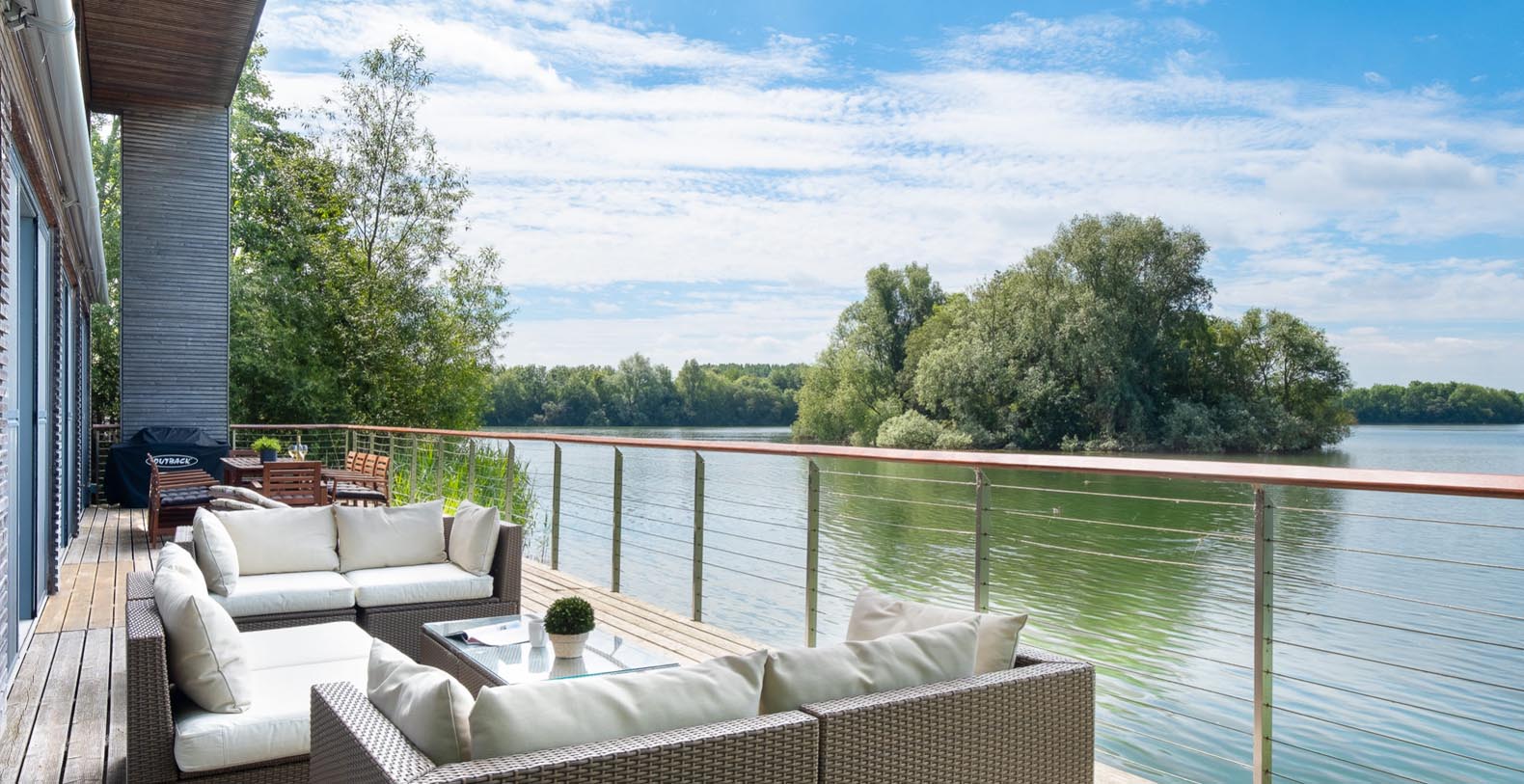 Externally, a 40 metre south facing deck overhangs the lake, which has a dining table and chairs for 10, a casual seating area (including 2 sun loungers), bbq and electrically operated shade awnings.