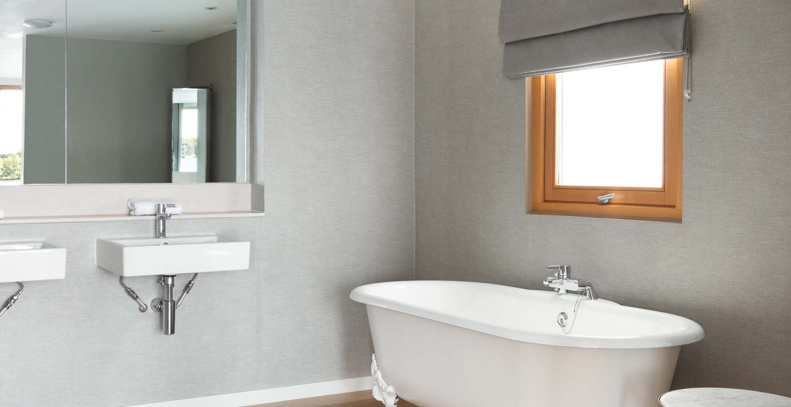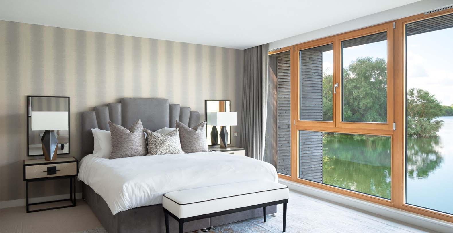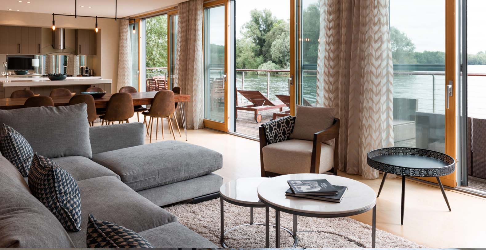 Externally, a 40 metre south facing deck overhangs the lake, which has a dining table and chairs for 10, a casual seating area (including 2 sun loungers), bbq and electrically operated shade awnings.