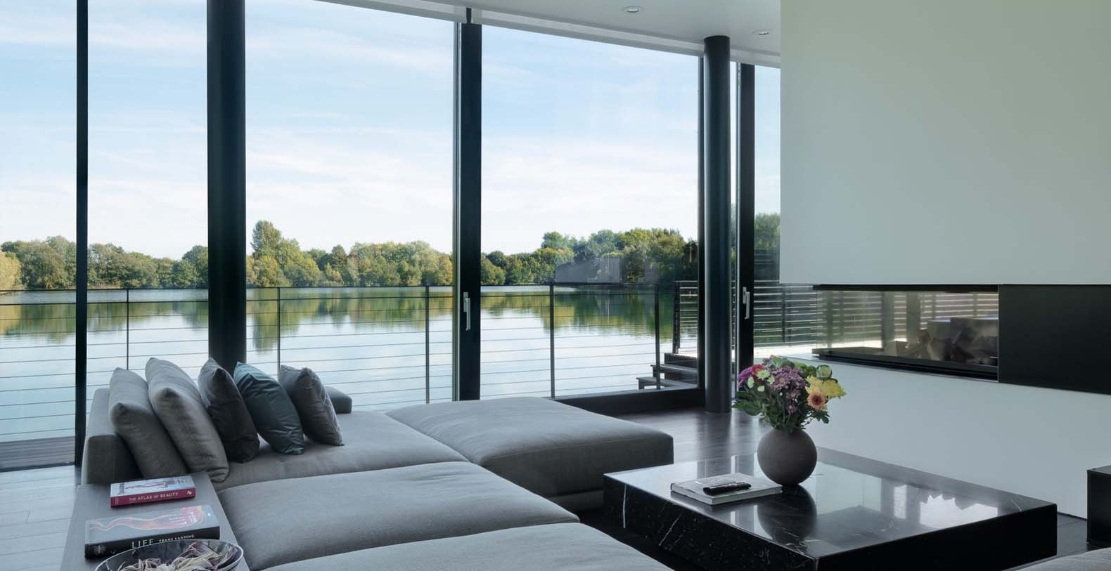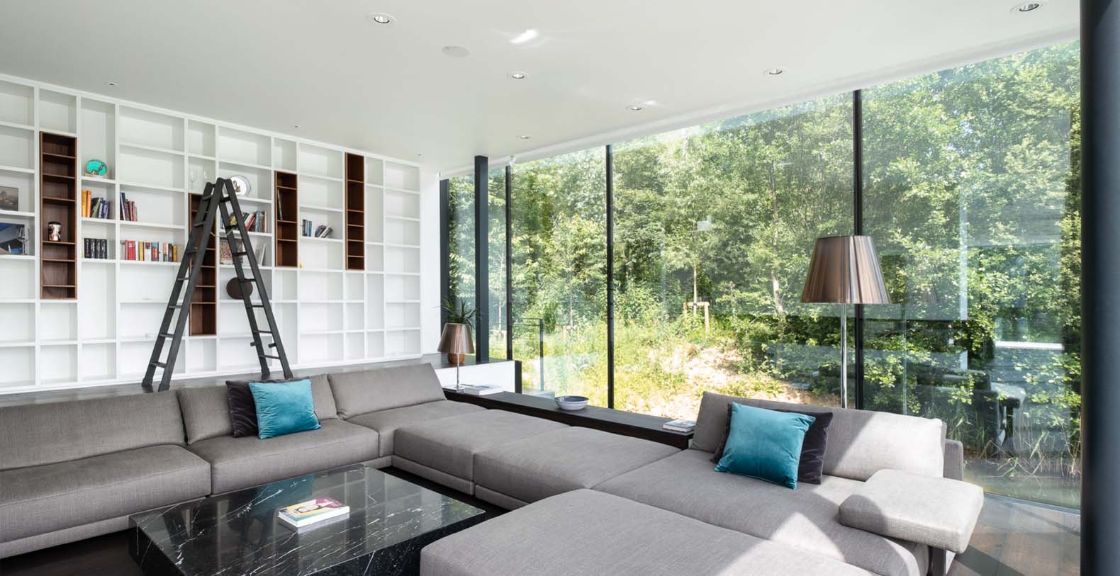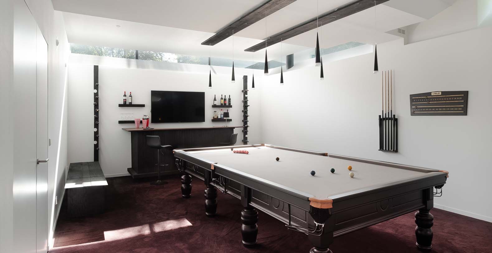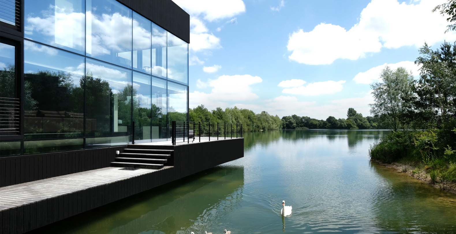 The basement incorporates a relaxation/leisure zone (private cinema, games/bar area, wellness / spa area) and sits in the lake. Despite being underground the basement has a bright and spacious feel from windows at a height of 3 meters, allowing light to flood into the wellness and games rooms. The bright central stairwell provides further natural light all the way from the central glass roof section.
