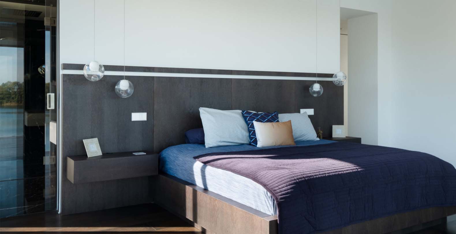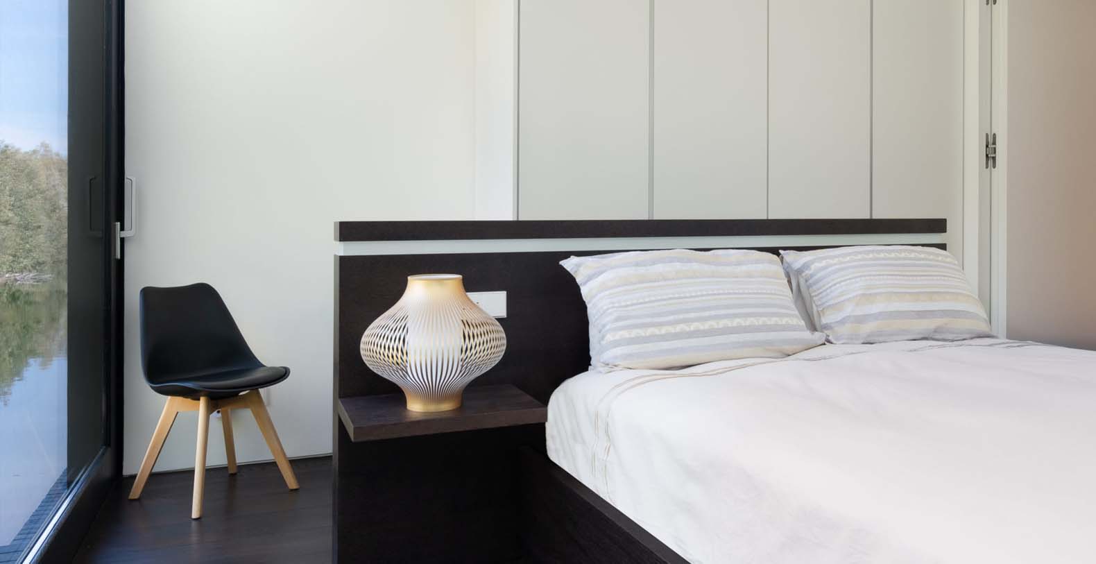 The 1st floor is the sleeping /working zone with 3 more bedrooms including the master bedroom, all en-suite and all providing 2 sided transparent glass walls flooding the rooms with light and offering spectacular lake views. There is also a study looking onto the full panorama of the lake with its own open contemporary wood fired fire place. The 1st floor hall provides a 6 meter window with views of the trees and to the roof skylight window stretching across the width of the house.
