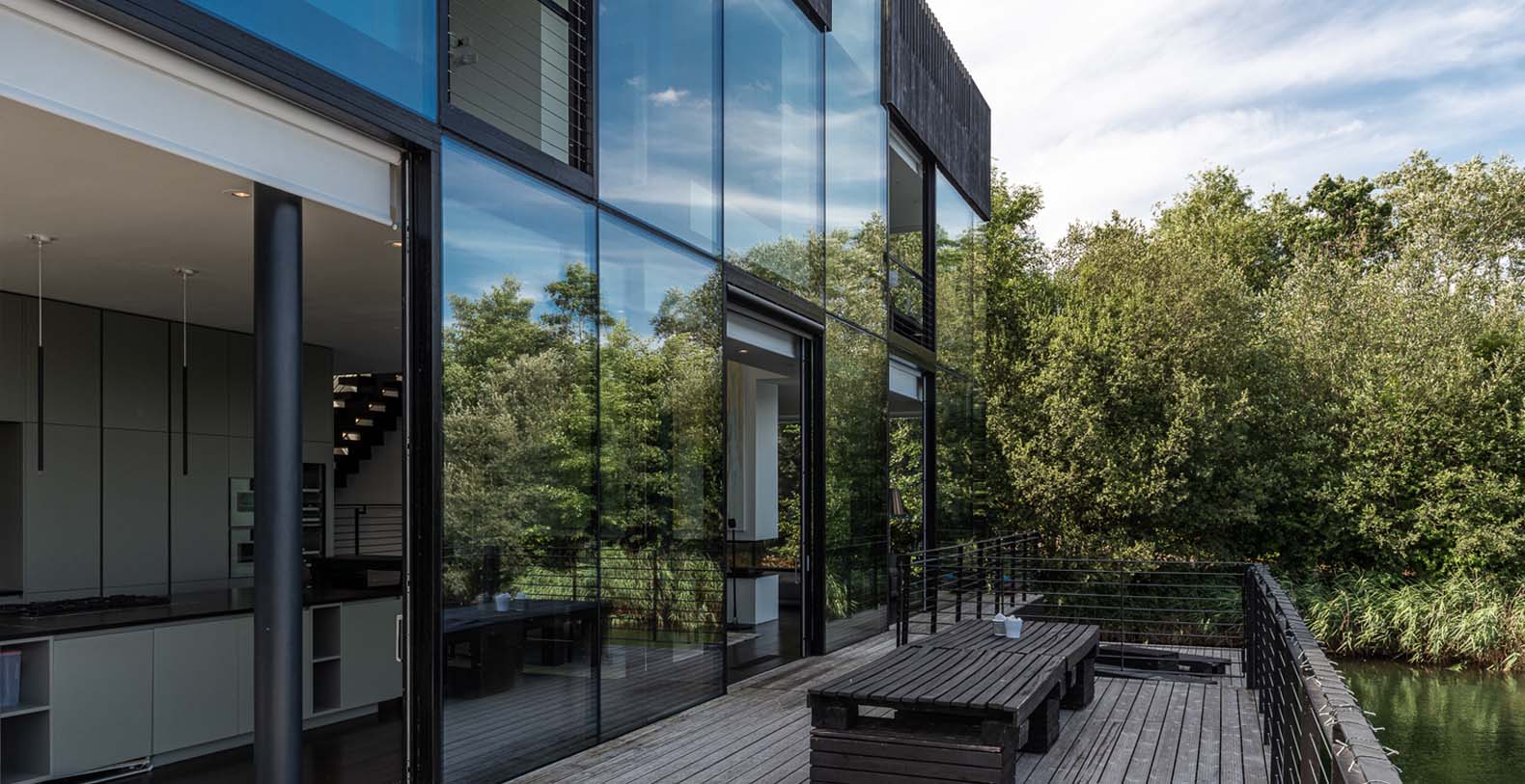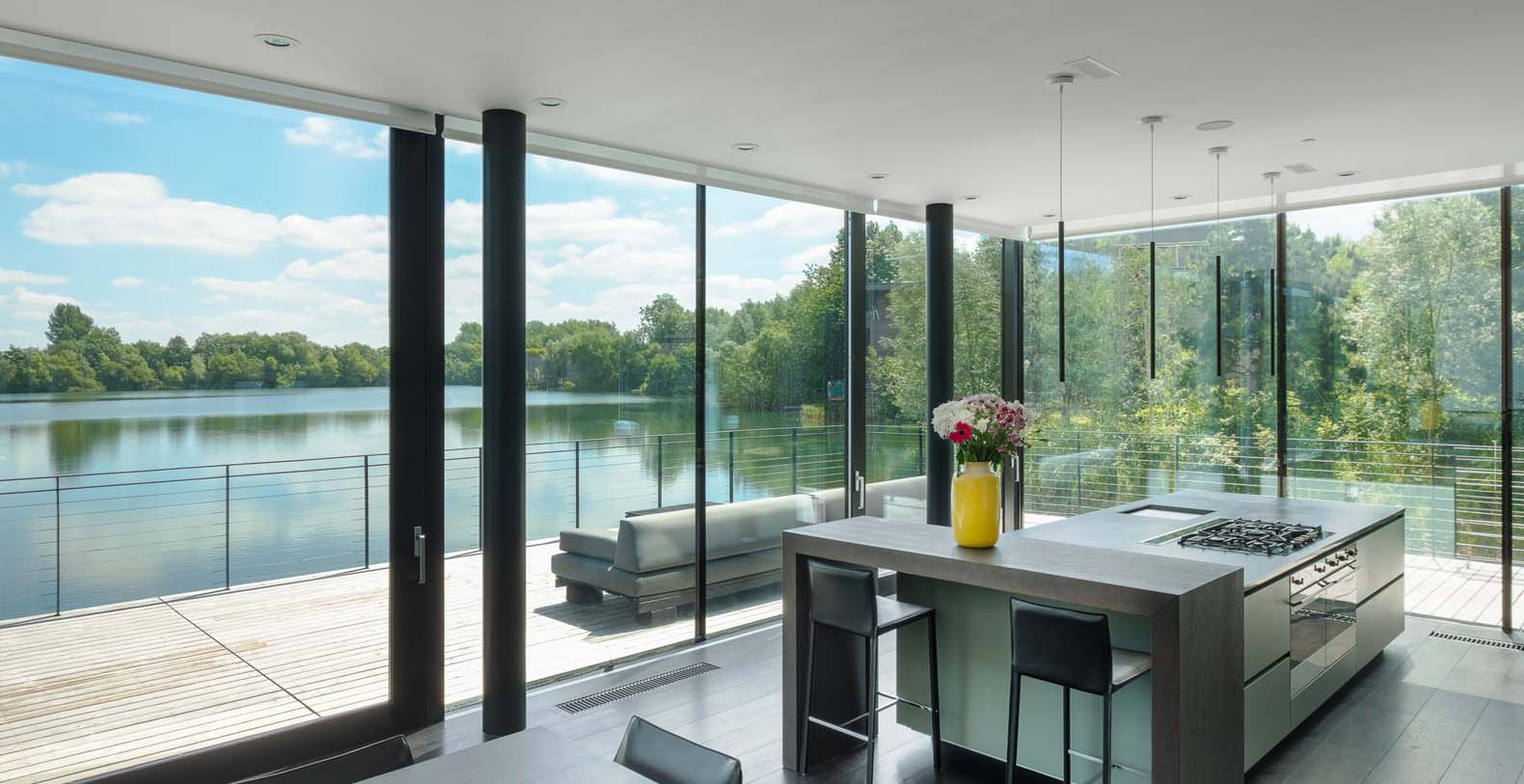 The ground floor lower split level predominantly houses the living space with a huge kitchen / dining area / living room spread across the entire width of the house, offering high lake front views, where 3 huge glass doors can fully open up to the wrap around terrace space. There is a contemporary wood fired fireplace separating the lounge from the dining/kitchen area. There is a TV room and an en-suite large double bedroom on the higher split level of the ground floor, both having 2 sided transparent glass walls to the outside space.