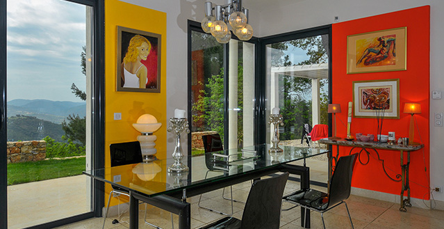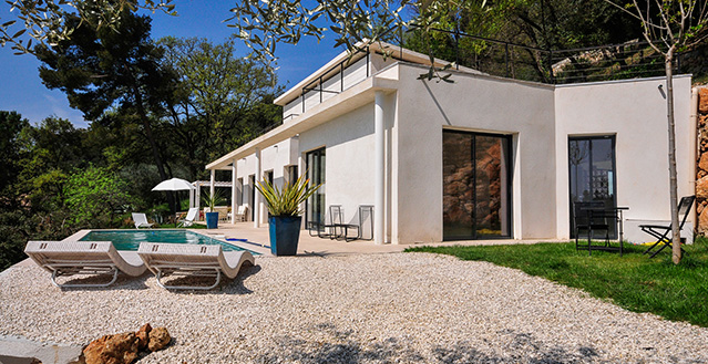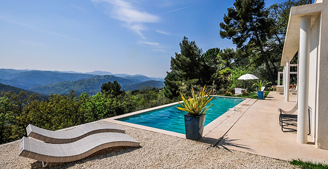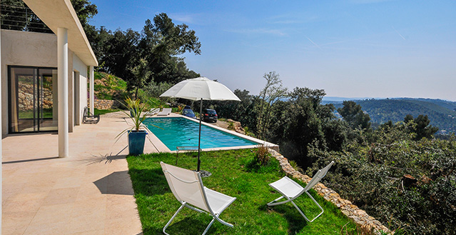 A stunning, modern villa with views near Grasse situated on a hillside with far reaching views across the surrounding hills to Lac de St Cassien and the bay of Mandelieu. Modern design and comtemporary furnishings create a light, airy, comfortable living space with large glass doors making the most of the fabulous views.