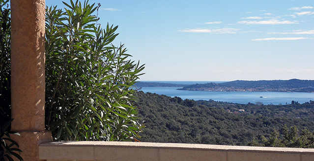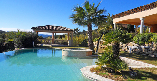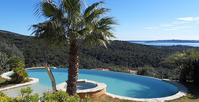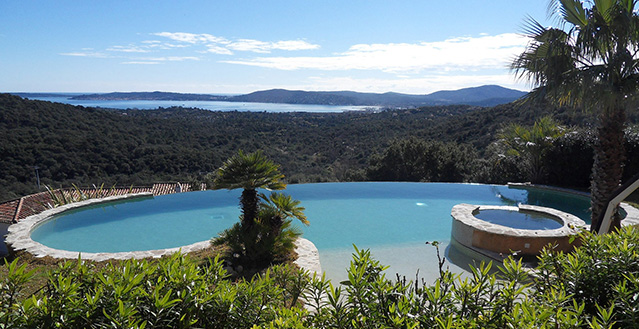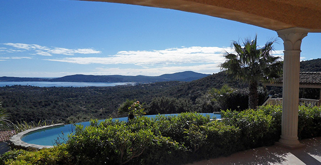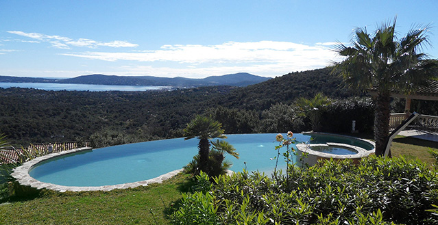 This luxury villa with infinity pool and Jacuzzi hot-tub sits in an elevated position with commanding sea views over the Gulf of St Tropez, set against a backdrop of forested hills on the edge of Port Grimaud.
