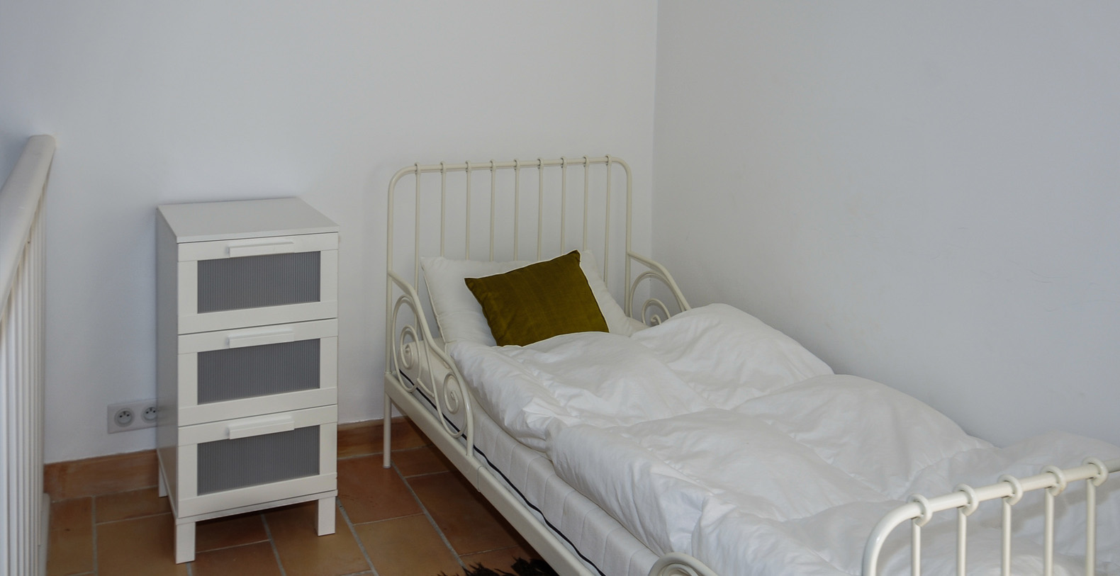 Study with PC/printer and sofa bed: steps lead up to a Mezzanine with a single bed (0.9m), ensuite shower room with WC. A French window opens onto a private terrace with steps down to the swimming pool.