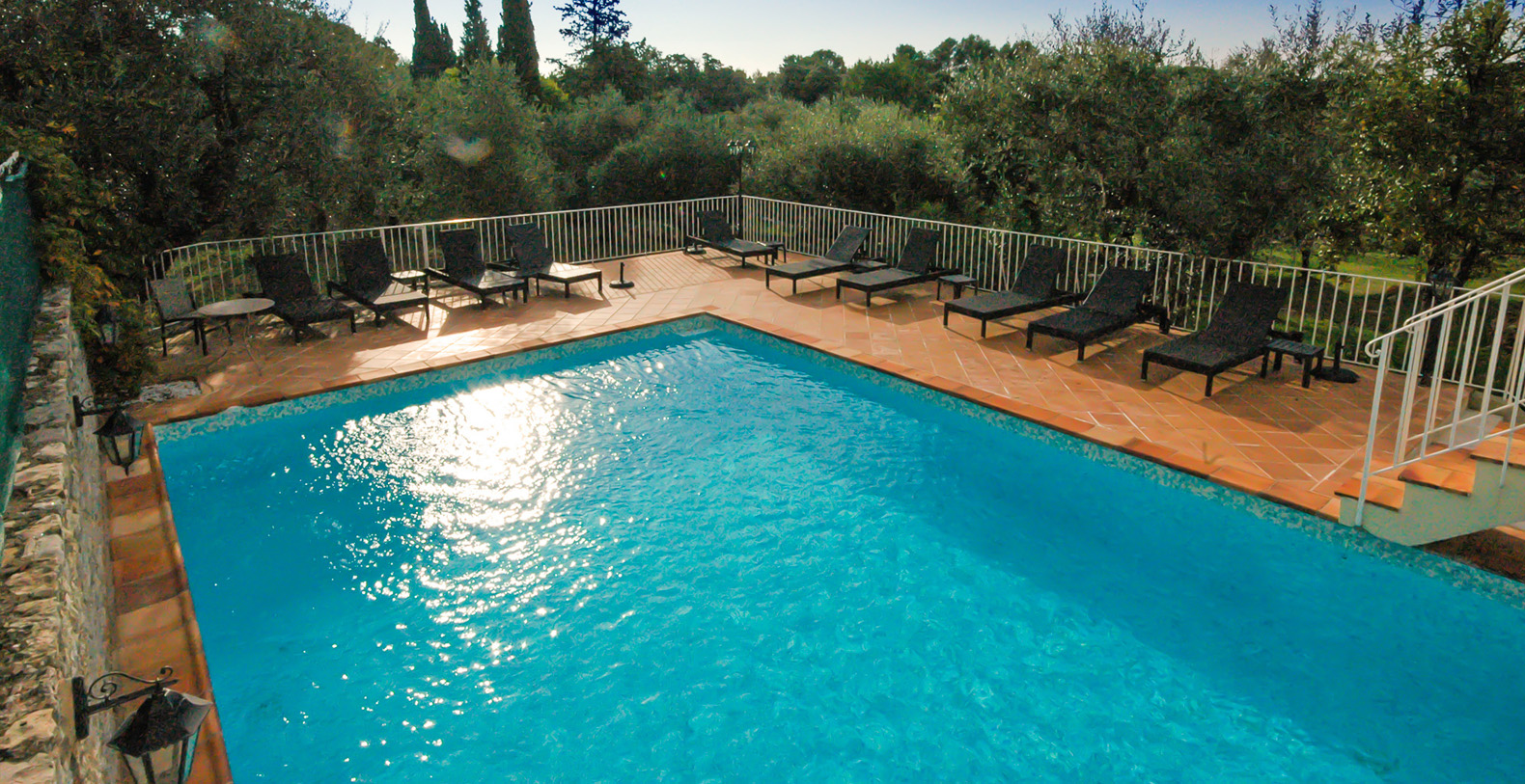 Approximately 7 acres of terraced grounds comprising mature trees (olive, orange, lemon, fig, pine and cypress), shrubs, gardens and lawns. Sun and dining terraces. Gated & heated 8.5m x 6.5m salt water swimming pool (depth 1.8m throughout) with Roman steps entrance. Fenced hard surface tennis court. Table tennis. Two fountains. Portable charcoal barbecue. Parking for 5 cars plus garage space for one car.