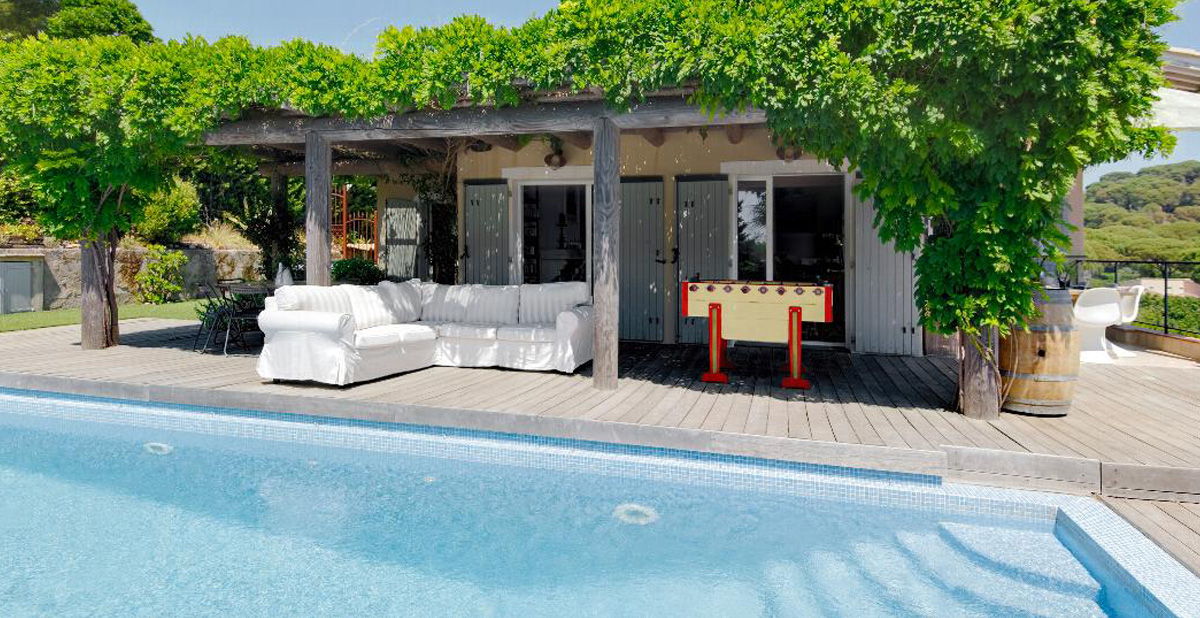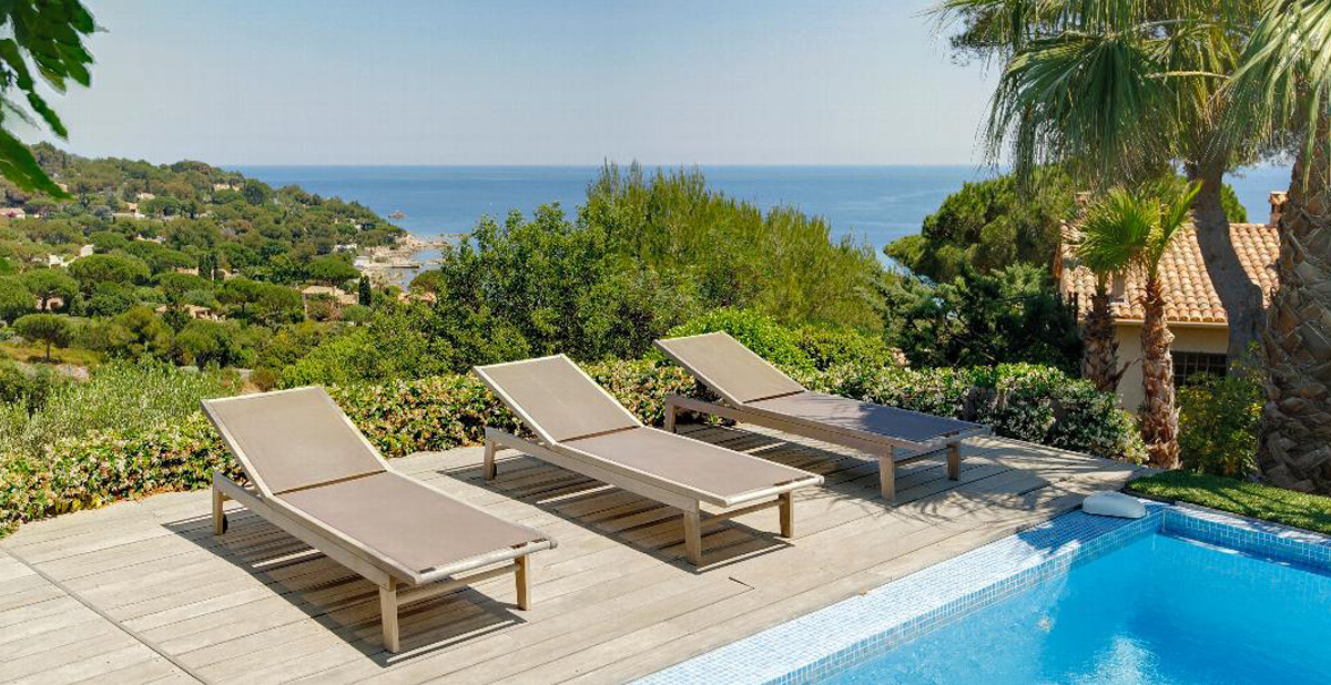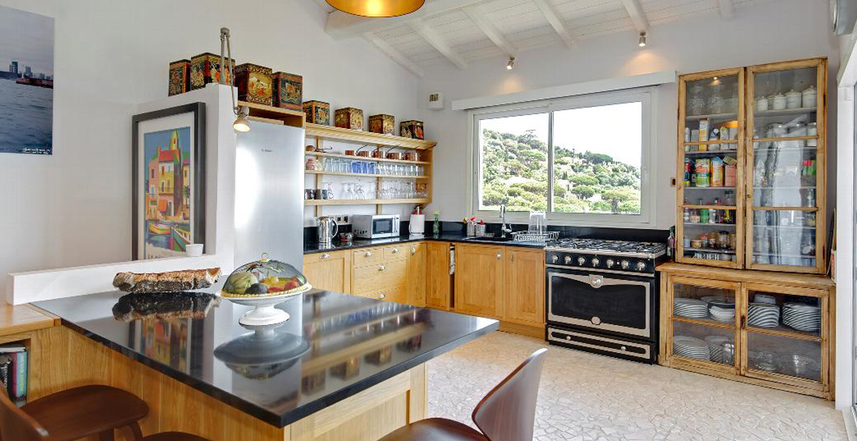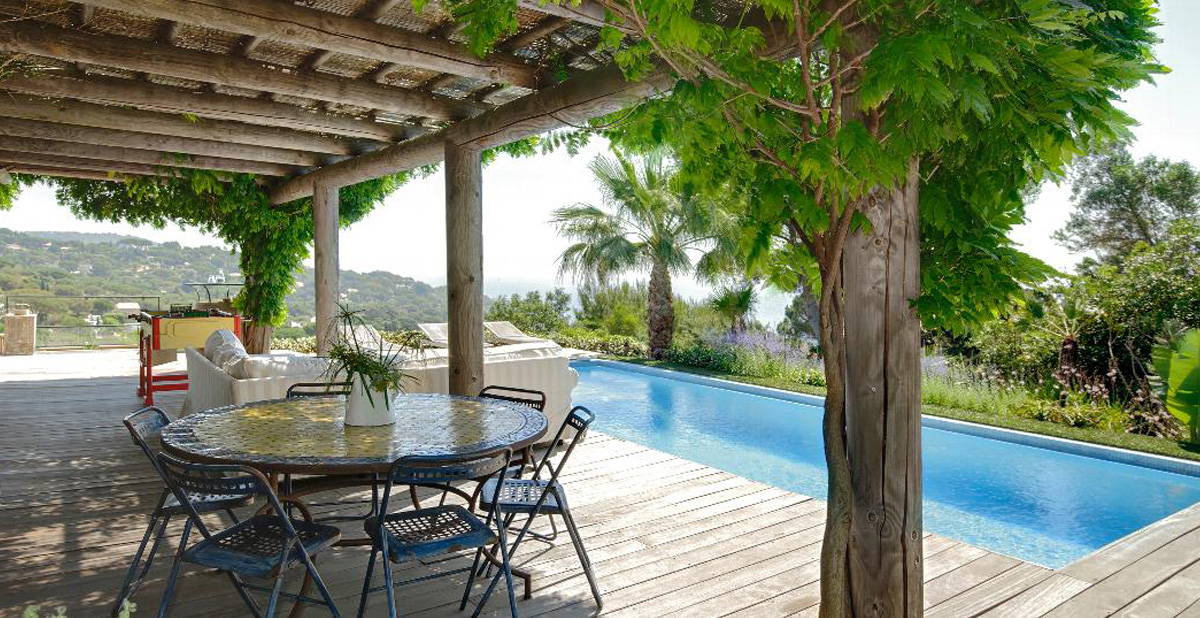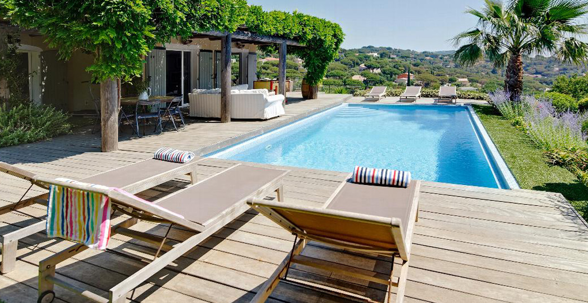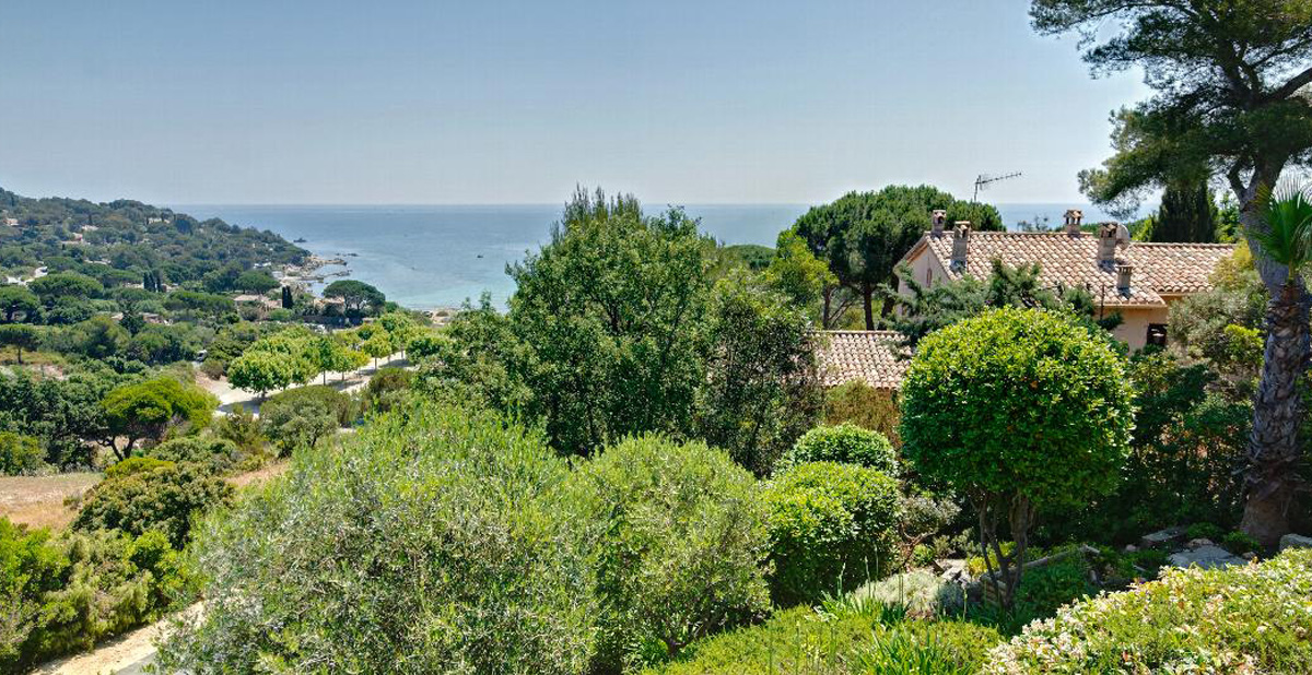 The property , cleverly situated so it is not overlooked, is surrounded by a small and attractive terraced garden with a swimming pool (12 x 6) built into the deck and overlooking the sea. There are two large covered terraces surrounding the house, one with a BBQ, next to the kitchen with dining table; the other, furnished with comfortable sofas, is perfectly placed to enjoy both the sun and the views of the sea, including, to the left, Cap Camarat.