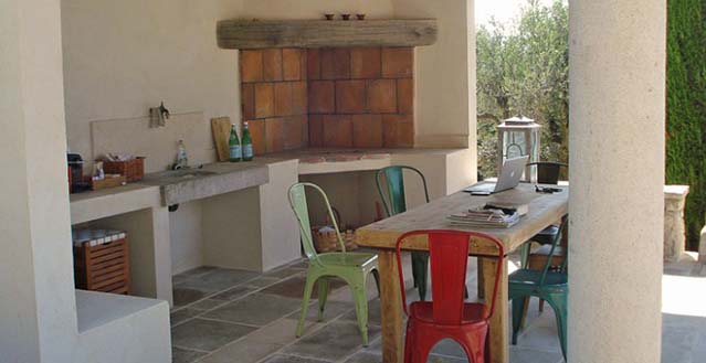 Large, terraced grounds with olive, orange and lemon groves, mature shrubs. Each level is protected by railings but there are stone steps leading down to the pool on a lower terrace; care with young children. 18m x 5m heated pool (depth 20 - 30cm 'beach' ledge entry then 1.20m to 1.80m) with summer kitchen (sink, built-in charcoal barbecue) and covered dining with table for 6. Pathway to private tennis court, boules pitch.