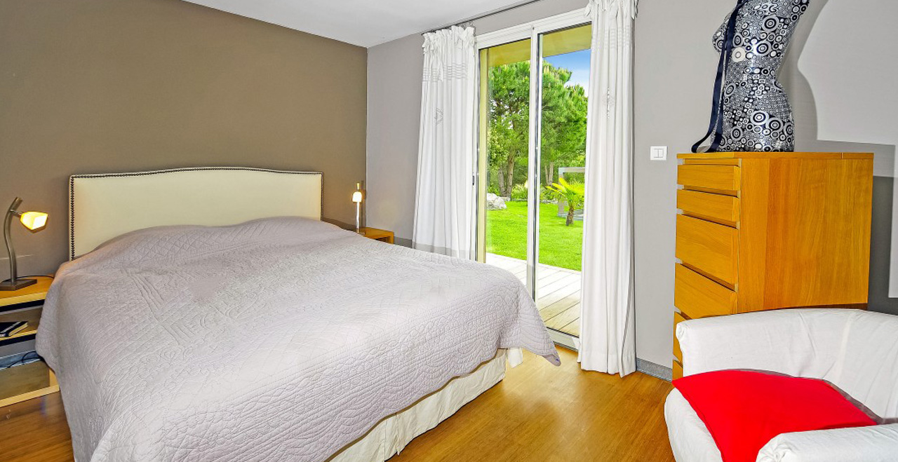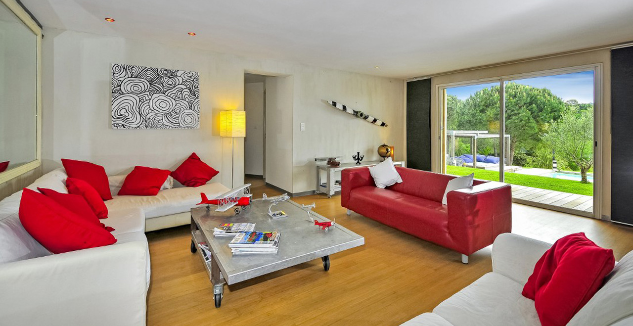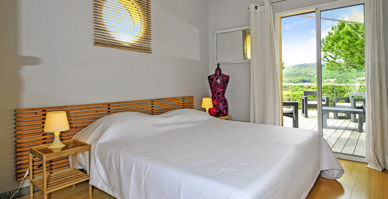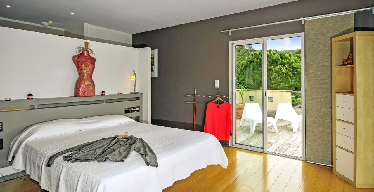 Contemporary vacation villa with pool – This superbly appointed villa is set in a peaceful and secluded area of the countryside between Gassin and La Croix Valmer, a very short distance from the coast. Afine example of modern, streamlined architecture, Les Nénuphars is furnished in stylish cream and white colours with beautiful wooden floors and large windows for maximum exposure to the light and views over the surrounding hills. All bedrooms have sliding doors leading to large decked terraces on both floors.