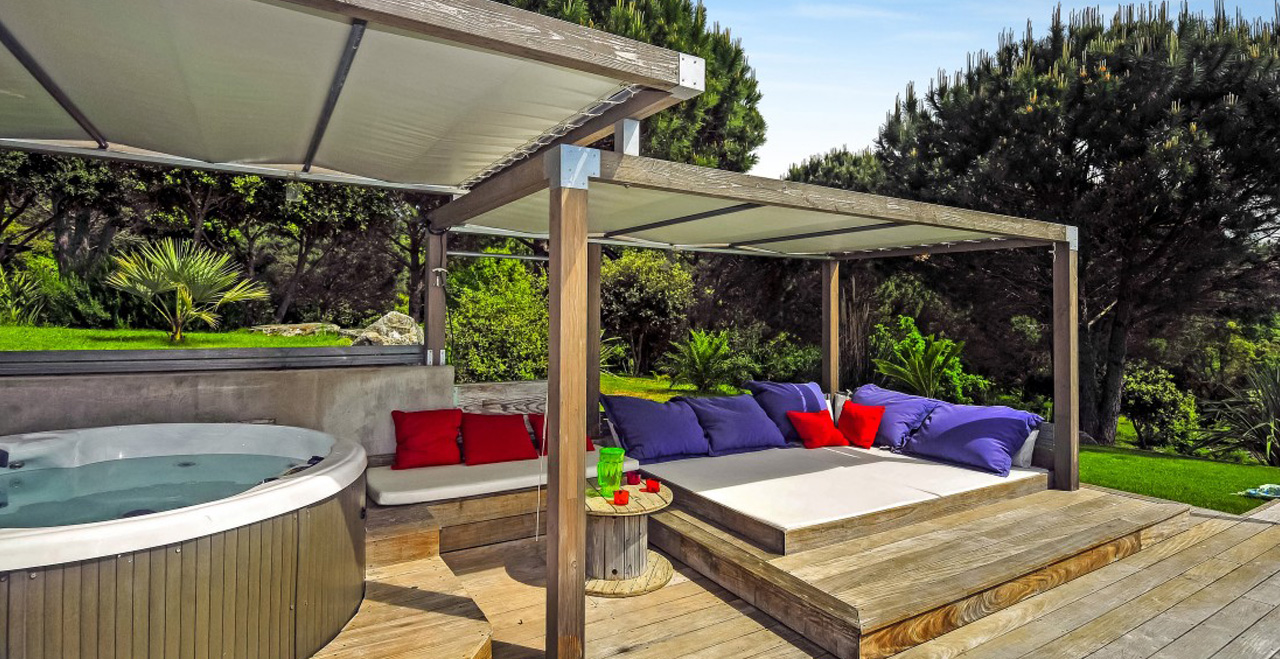 The mature Mediterranean garden provides plenty of space for relaxation to suit every member of your party. The children will have a great time playing on the well maintained lawn or swimming in the large solar-heated infinity pool whilst adults will particularly enjoy soaking up the sun from the Balinese beds, relaxing in the Jacuzzi tub or playing boules.
