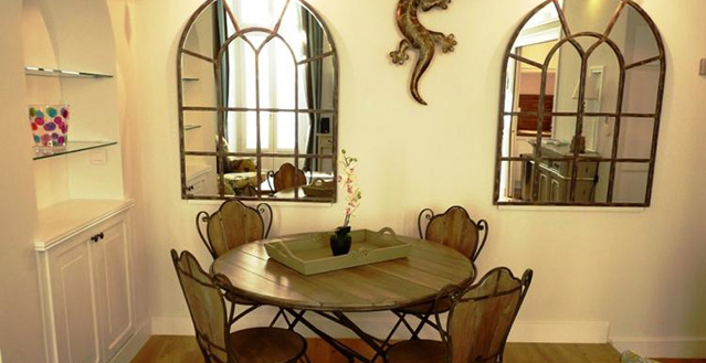 The dining area can seat four people around its antique chairs, accentuated by gilded mirrors and tastefully chosen art pieces.