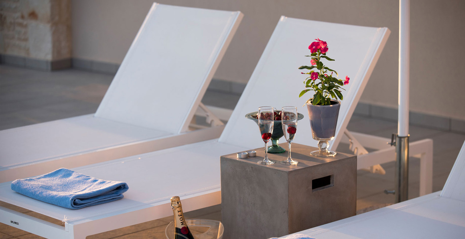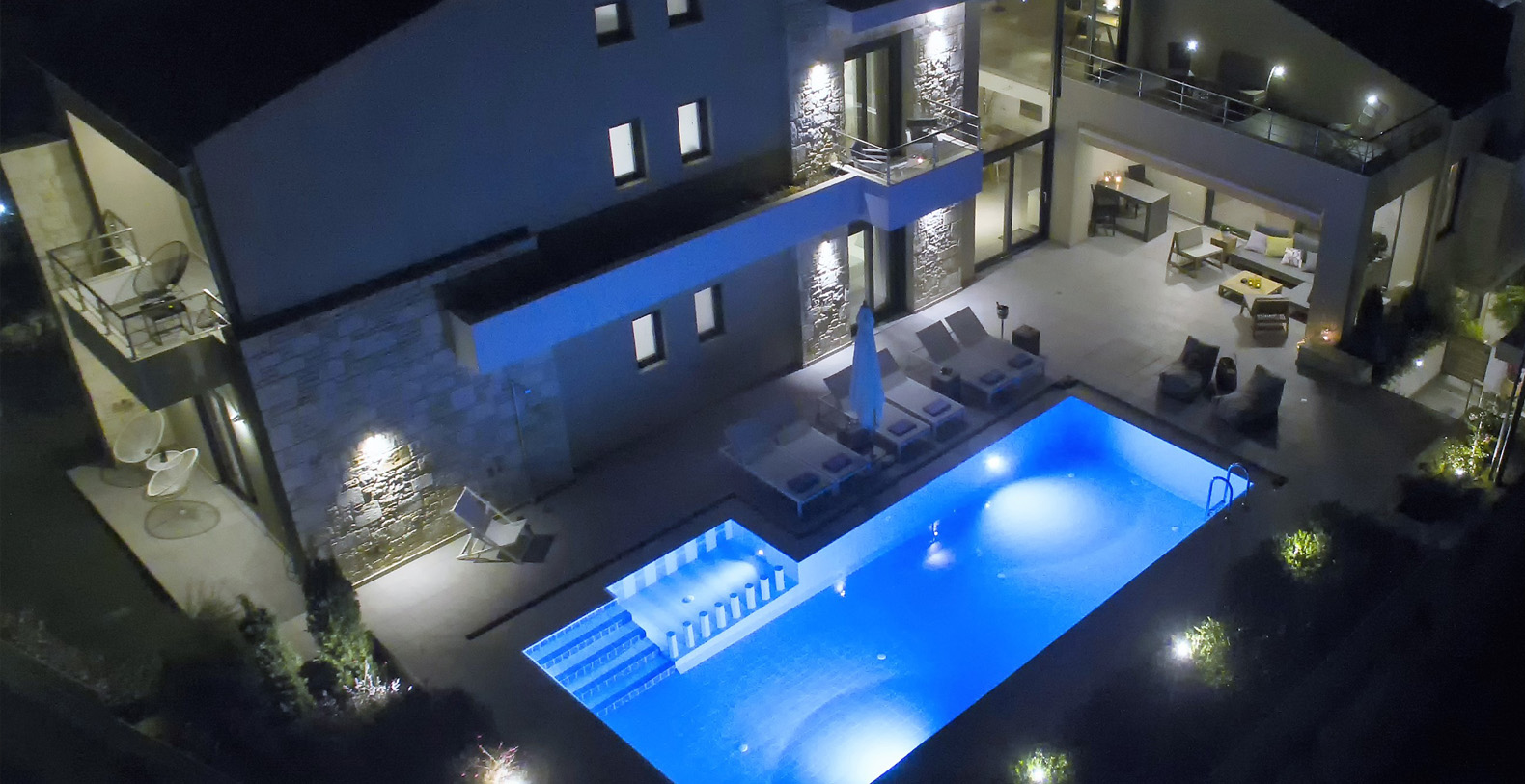 The tiled pool area with sunbeds, umbrella and sitting areas where you can enjoy the view and swim in your private pool (45 m2), is perfectly incorporated with the house.