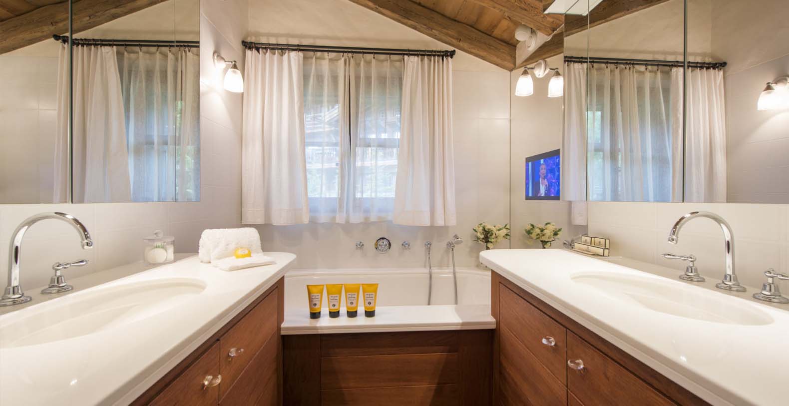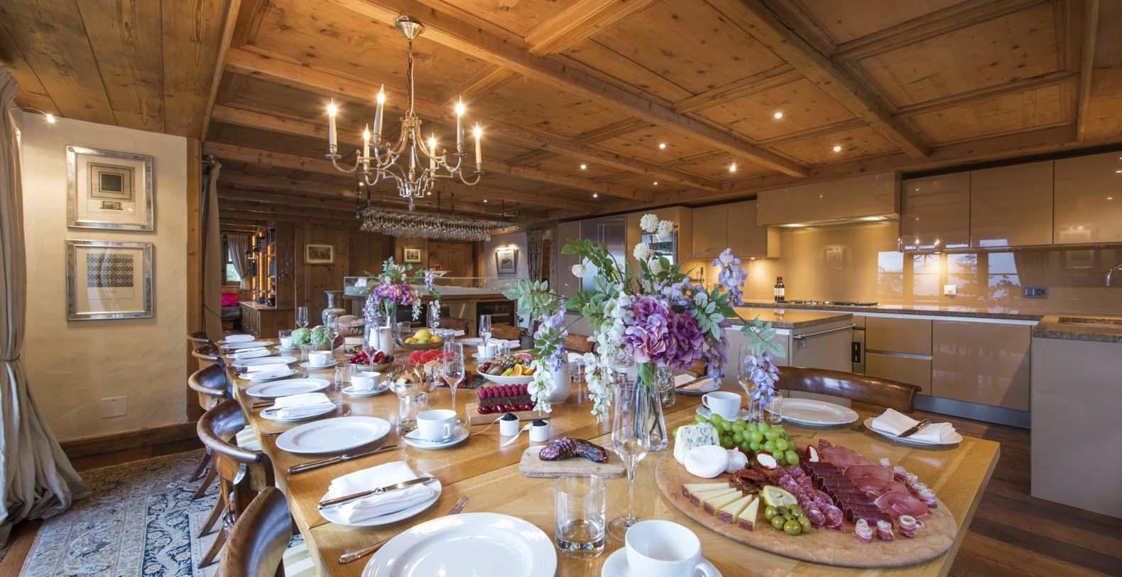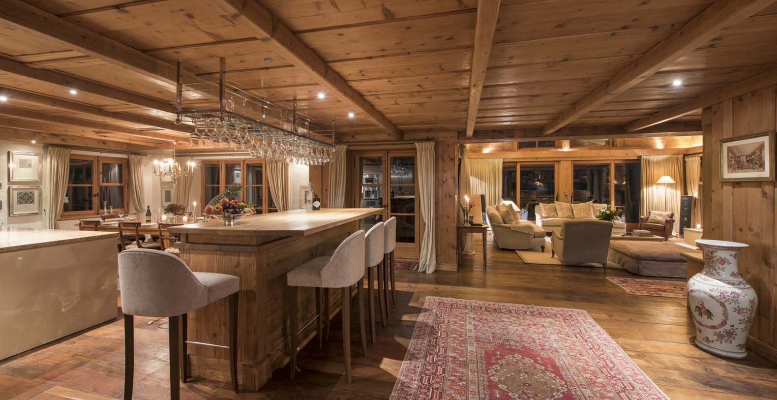 Enjoy a wonderful ambience on the first floor which is dedicated to the living and dining areas. Large sofas and comfy armchairs surround the central fireplace and there is an additional TV snug area adorned with furs and cushions. The double height sliding doors open out onto a spacious terrace where you can take in wonderful views of the Petit Combin mountain range. In the early evening as the last rays dip behind the tips of the trees, the living area provides the perfect retreat for a warm, cosy aperitif in front of the fire. A central bar area separates the living area from the grand dining table and open plan kitchen. There is also a guest restroom on this floor as well as another entrance to the chalet.