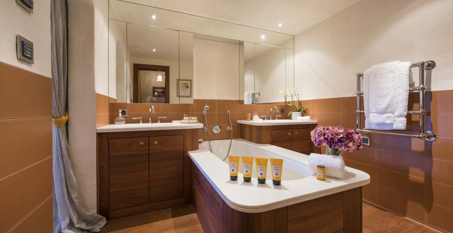There are two double bedrooms with French windows looking out onto the terrace, allowing the light to flood in. Both rooms boast en-suite bathrooms with separate showers. One of these bedrooms can be split into a twin room. Also on this floor is a further twin/double bedroom with en-suite bathroom. Across the corridor lies a further double bedroom with a separate entrance if required as well as a separate kitchenette and en-suite shower room. This bedroom can be made into a twin bedroom if required, and there would be a small gap between the beds.