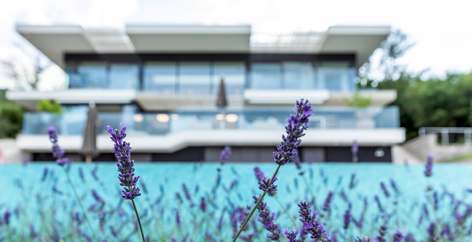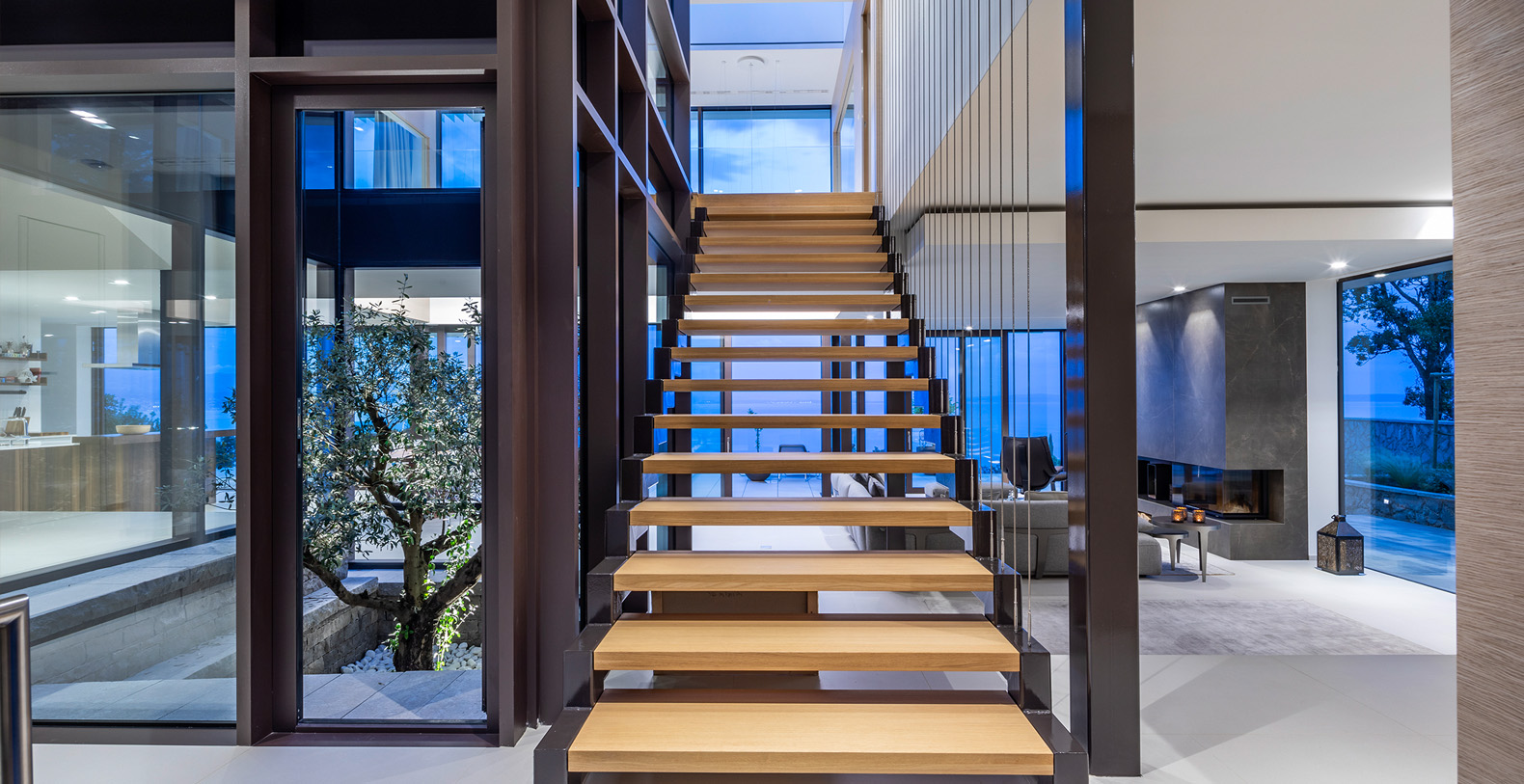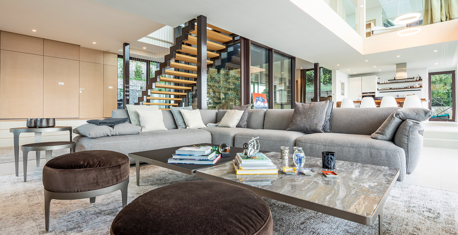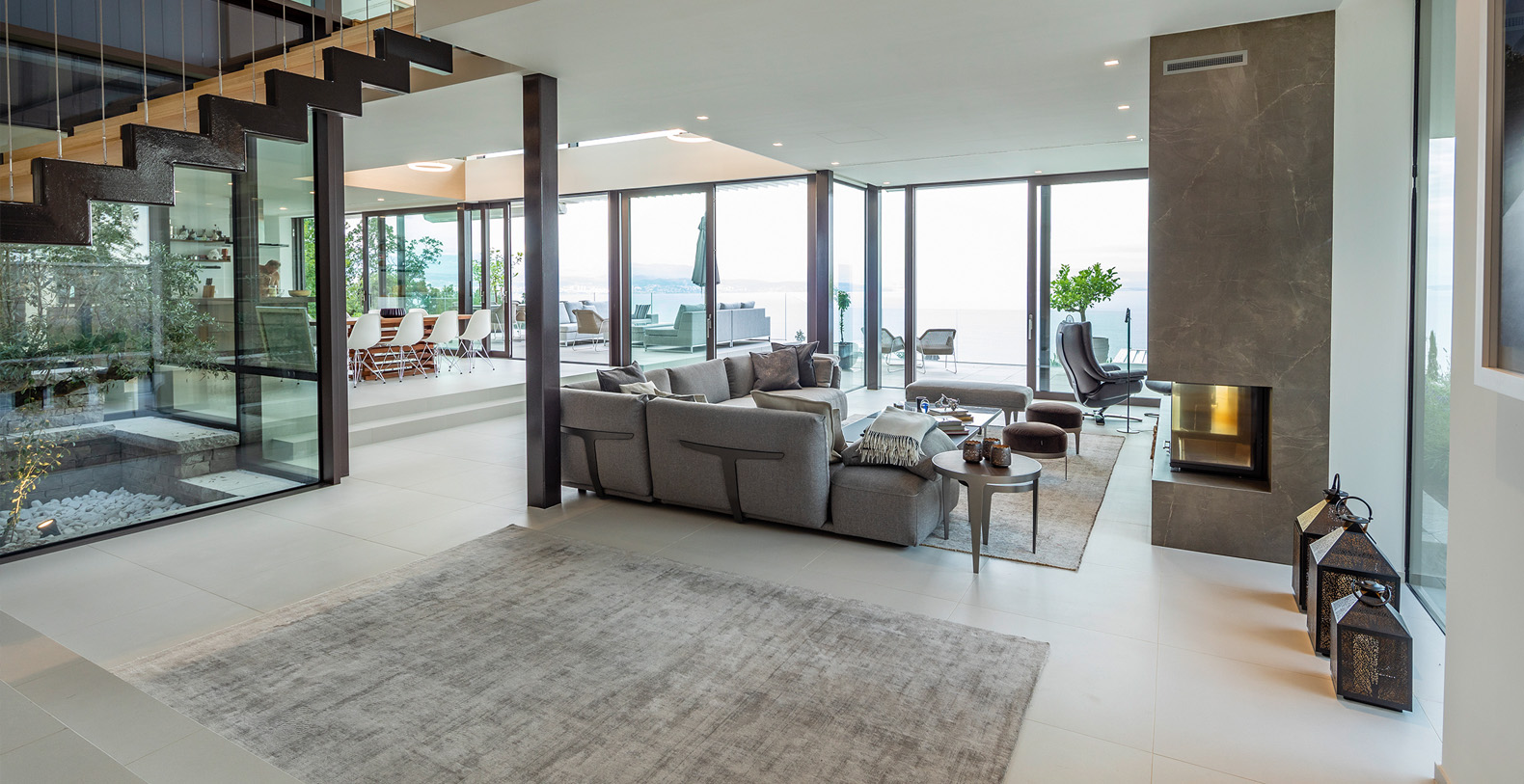 In the middle of a beautiful landscape, in hillside location, Villa Aura guarantees ultimate privacy and a fantastic view over the sea and the coast. The luxury mansion integrates perfectly into the landscape and has been built over several terraced floors. On the ground floor there’s an entrance with wardrobe, a spacious living area with a fire place, the dining area, a fully equipped kitchen, a library and TV room, a guest bathroom, a gym with a sauna and a shower as well as a bedroom with an ensuite bathroom. The stairs around the atrium lead up to the upper floor with four bedrooms. Every rooms has an ensuite bathroom and access to one of the balconies. The living area leads out onto the large terrace, which invites to linger with its cozy lounge and an eating area. Via two outdoor stairs you can reach the pool area with an infinity pool, a separate bathroom, an outdoor kitchen, deckchairs and parasols.