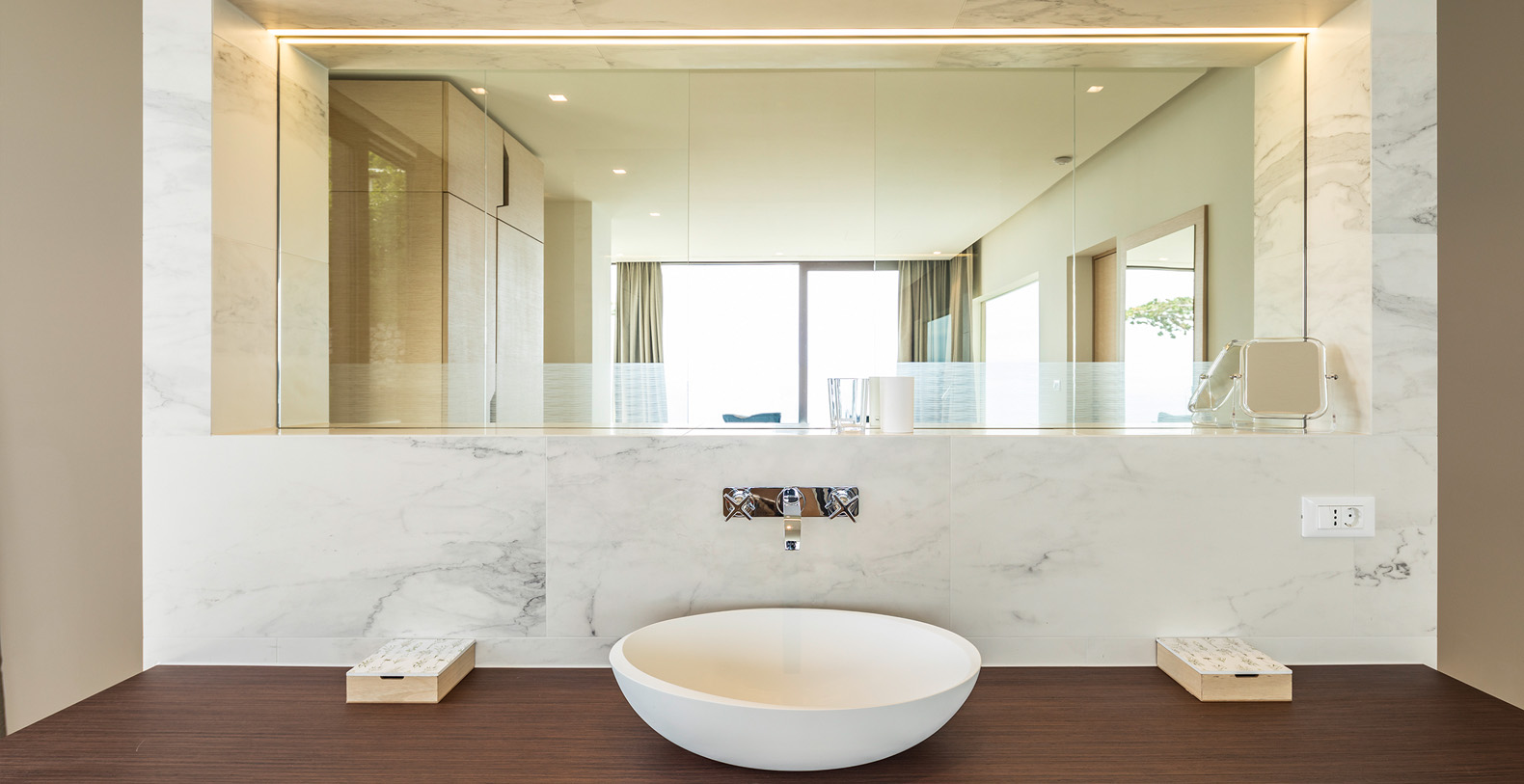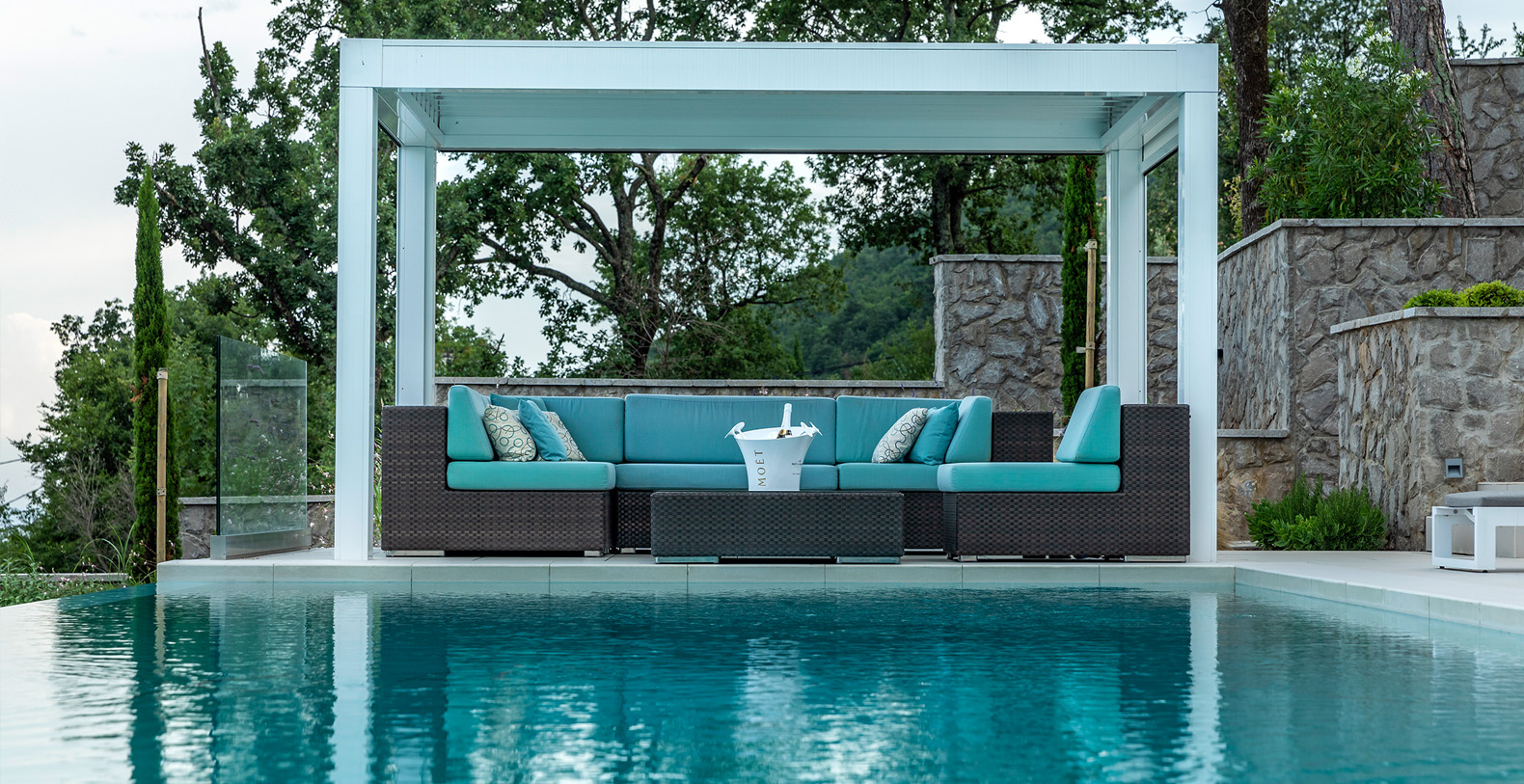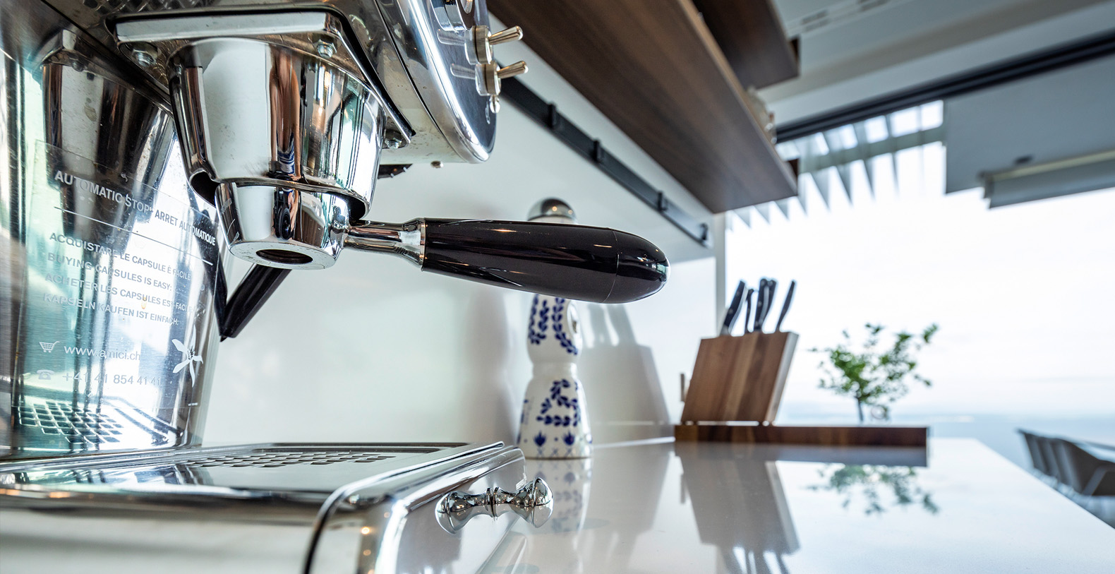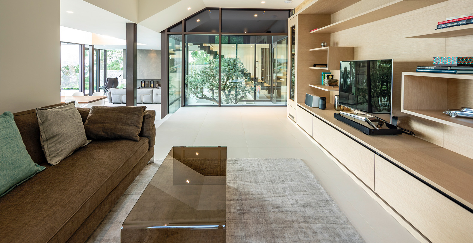 In the middle of a beautiful landscape, in hillside location, Villa Aura guarantees ultimate privacy and a fantastic view over the sea and the coast. The luxury mansion integrates perfectly into the landscape and has been built over several terraced floors. On the ground floor there’s an entrance with wardrobe, a spacious living area with a fire place, the dining area, a fully equipped kitchen, a library and TV room, a guest bathroom, a gym with a sauna and a shower as well as a bedroom with an ensuite bathroom. The stairs around the atrium lead up to the upper floor with four bedrooms. Every rooms has an ensuite bathroom and access to one of the balconies. The living area leads out onto the large terrace, which invites to linger with its cozy lounge and an eating area. Via two outdoor stairs you can reach the pool area with an infinity pool, a separate bathroom, an outdoor kitchen, deckchairs and parasols.