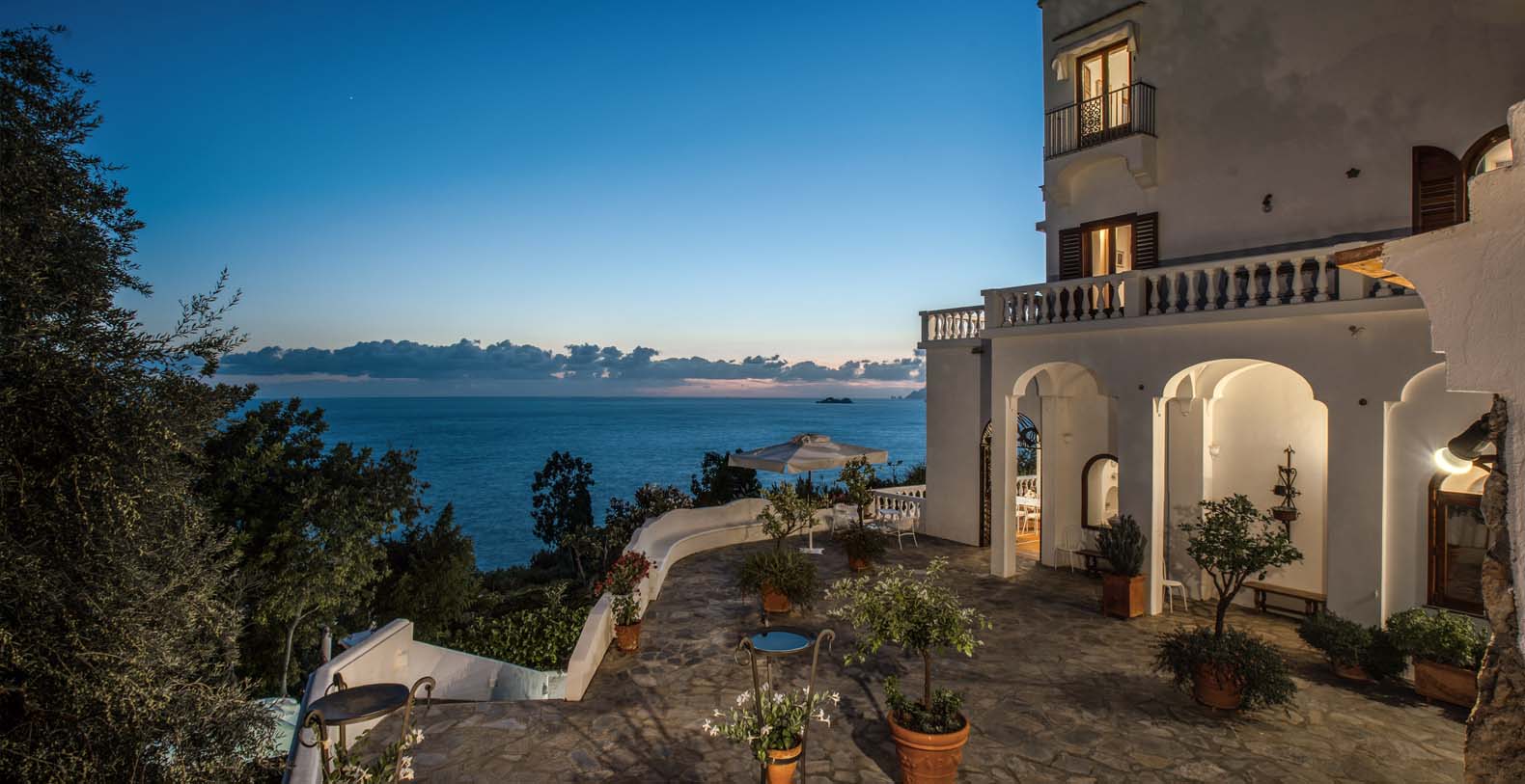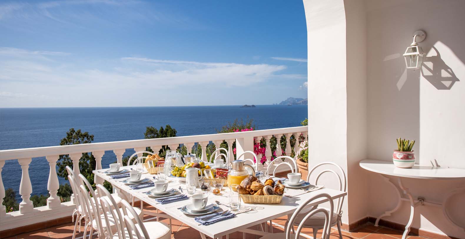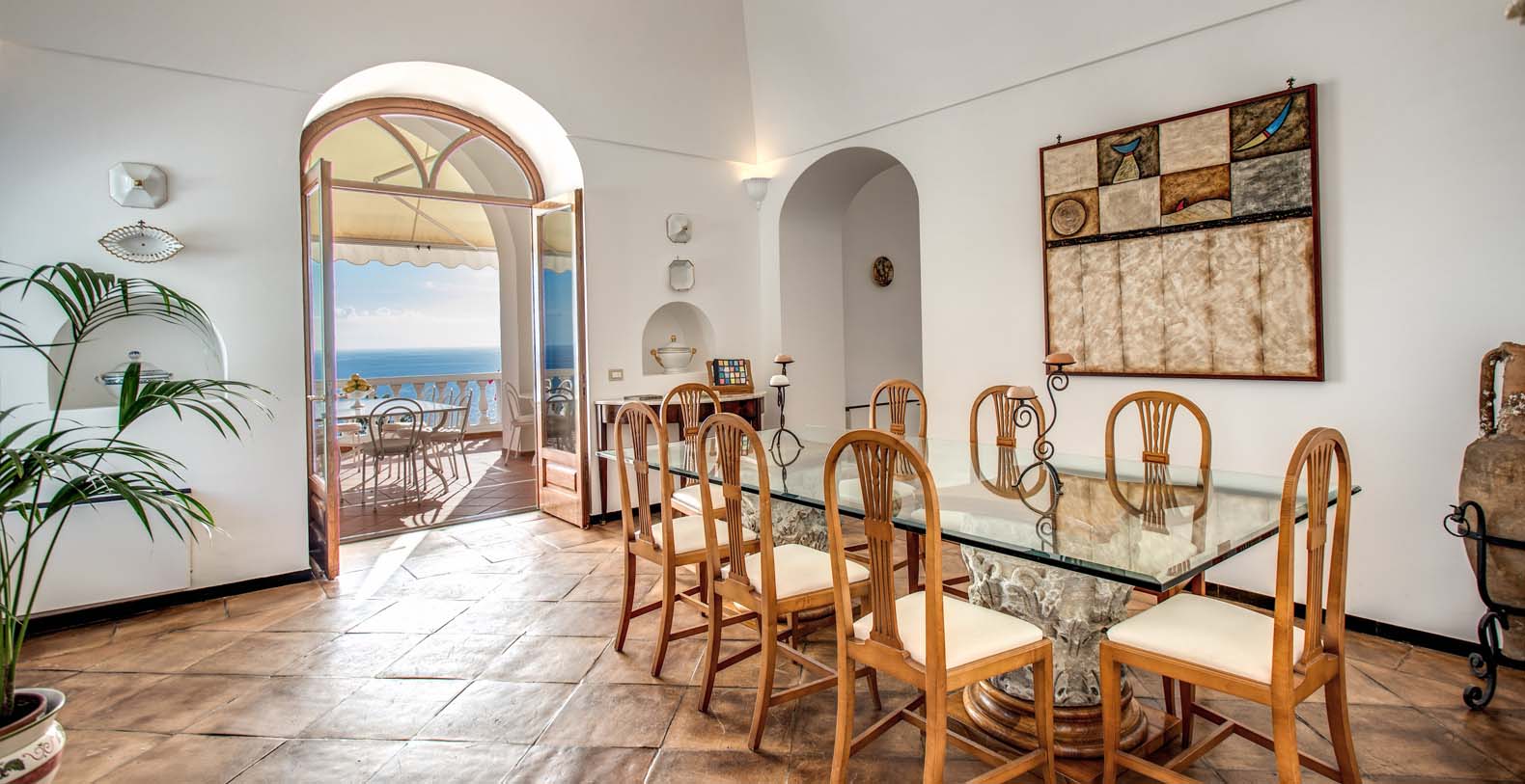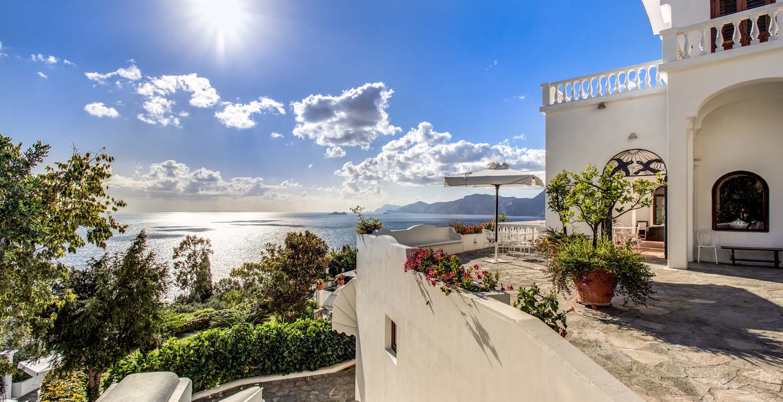 The Villa is located in a perfect location to explore the Amalfi area: 6,5 km to Positano, 8 km to Amalfi, 30 km to Pompei and 70 km to the Naples Airport. Villa Bideri is located just a few steps from the restaurants, bars and main shops. You will find the nearest restaurant 50 mts away, the SITA bus stop for the Amalfi Coast – Sorrento line – is a few meters away and the nearest beach is within easy walking distance. Surrounded by large terraces with Mediterranean plants and flowers, the villa boasts impressive views of the sea from Salerno bay to Capri, and Positano to Amalfi.