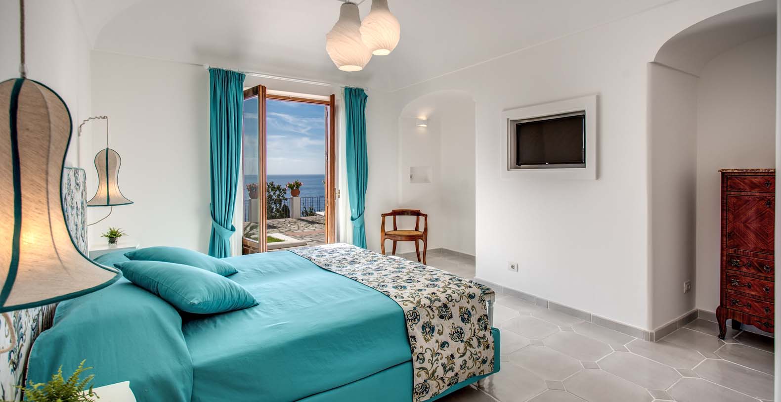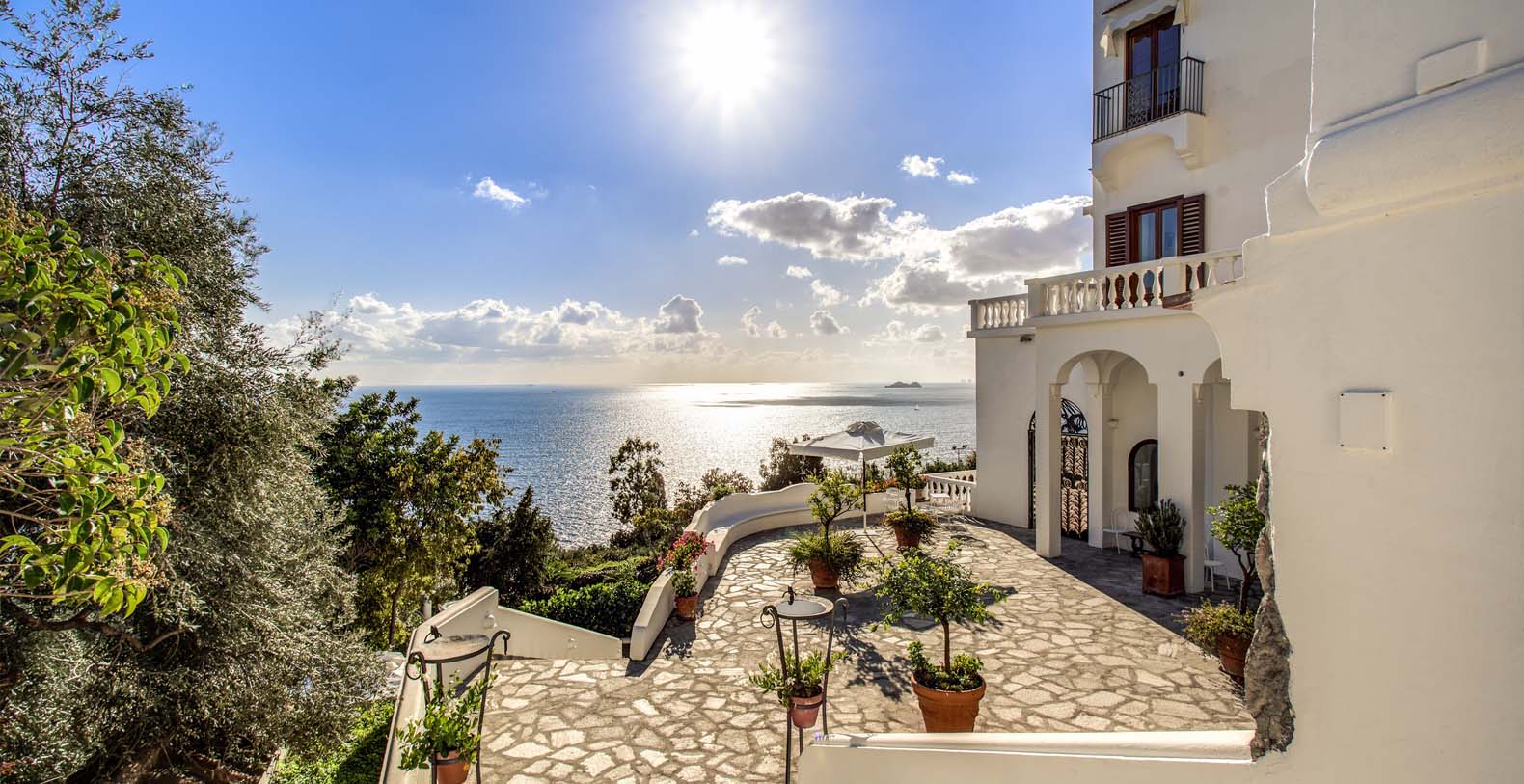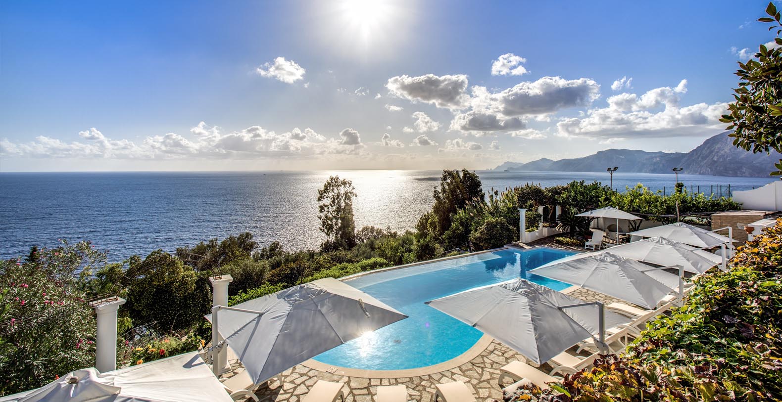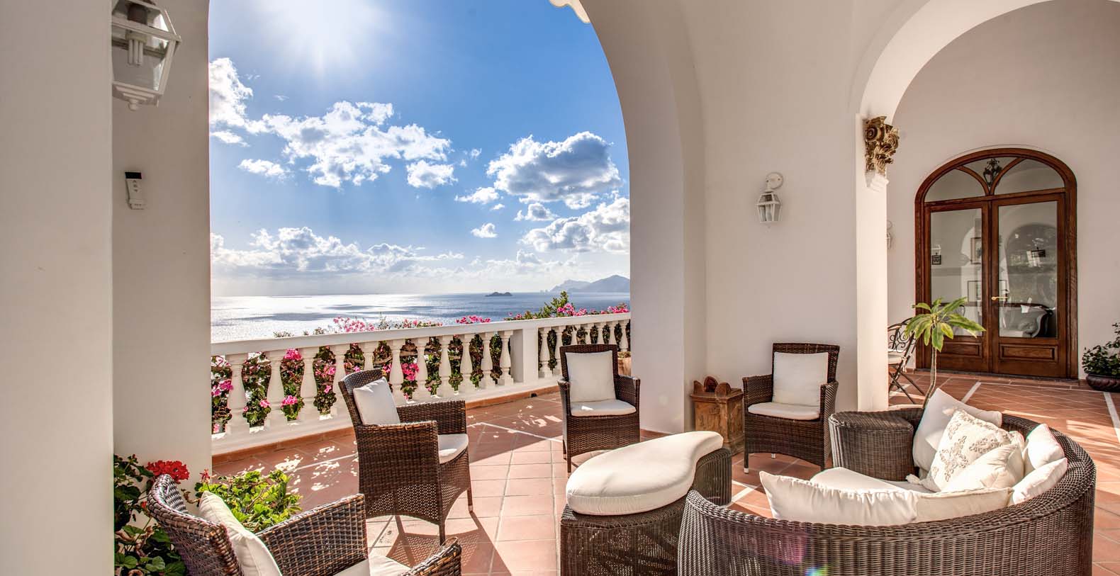 The Villa is located in a perfect location to explore the Amalfi area: 6,5 km to Positano, 8 km to Amalfi, 30 km to Pompei and 70 km to the Naples Airport. Villa Bideri is located just a few steps from the restaurants, bars and main shops. You will find the nearest restaurant 50 mts away, the SITA bus stop for the Amalfi Coast – Sorrento line – is a few meters away and the nearest beach is within easy walking distance. Surrounded by large terraces with Mediterranean plants and flowers, the villa boasts impressive views of the sea from Salerno bay to Capri, and Positano to Amalfi.