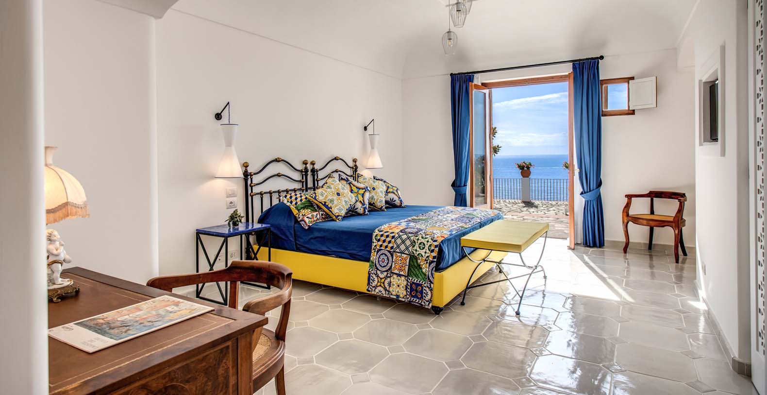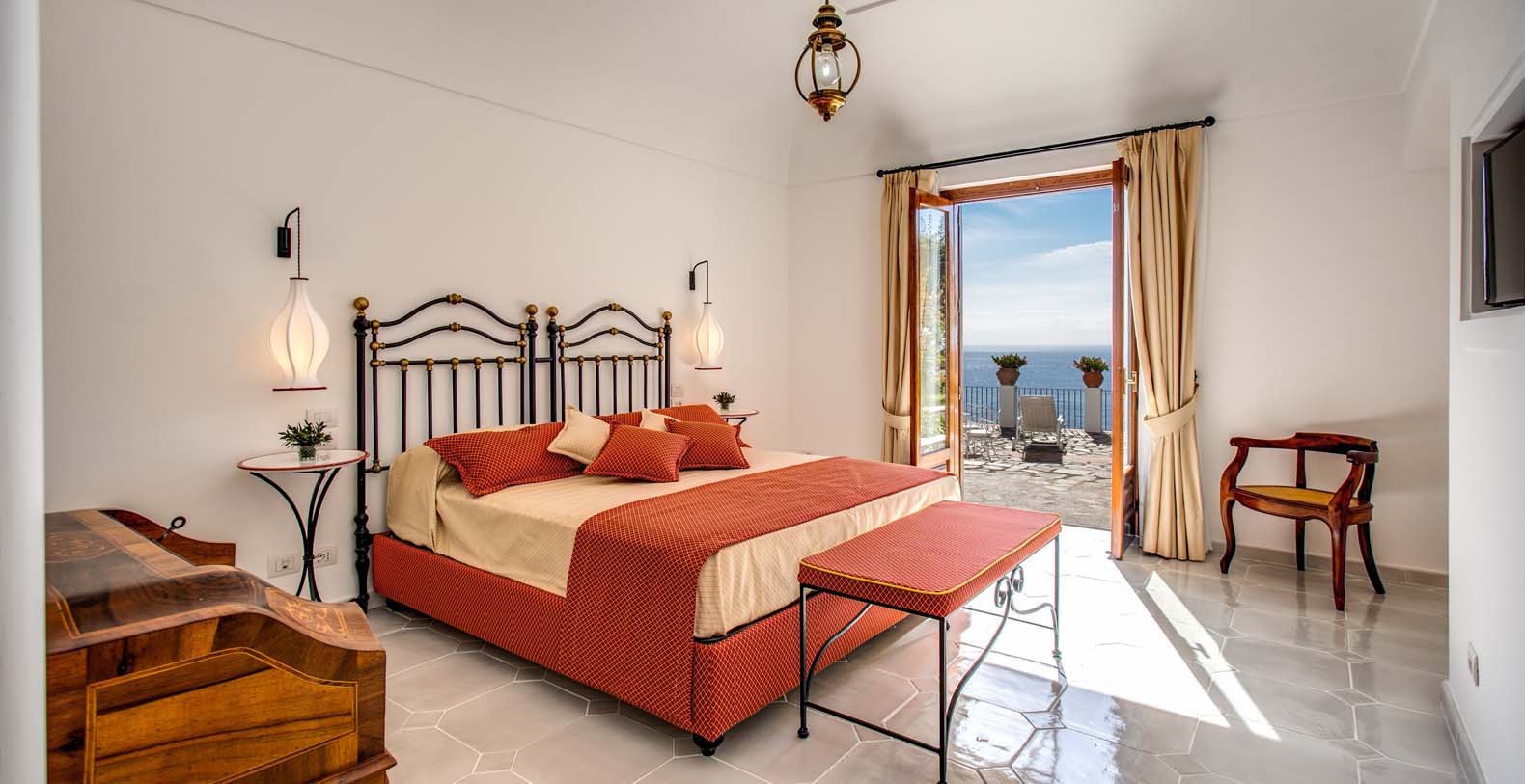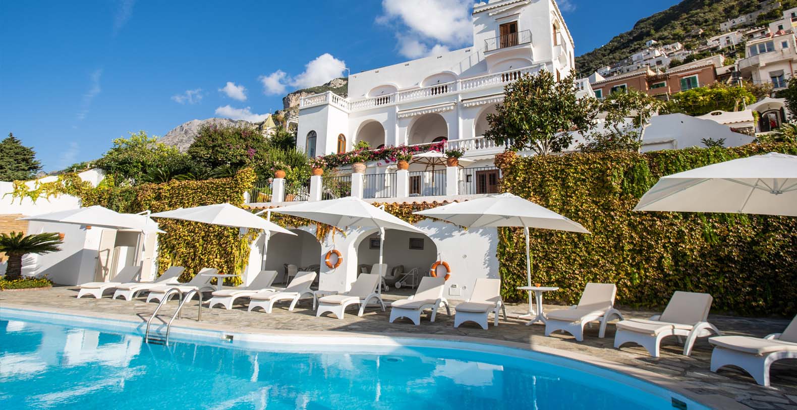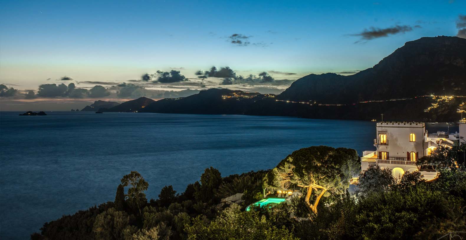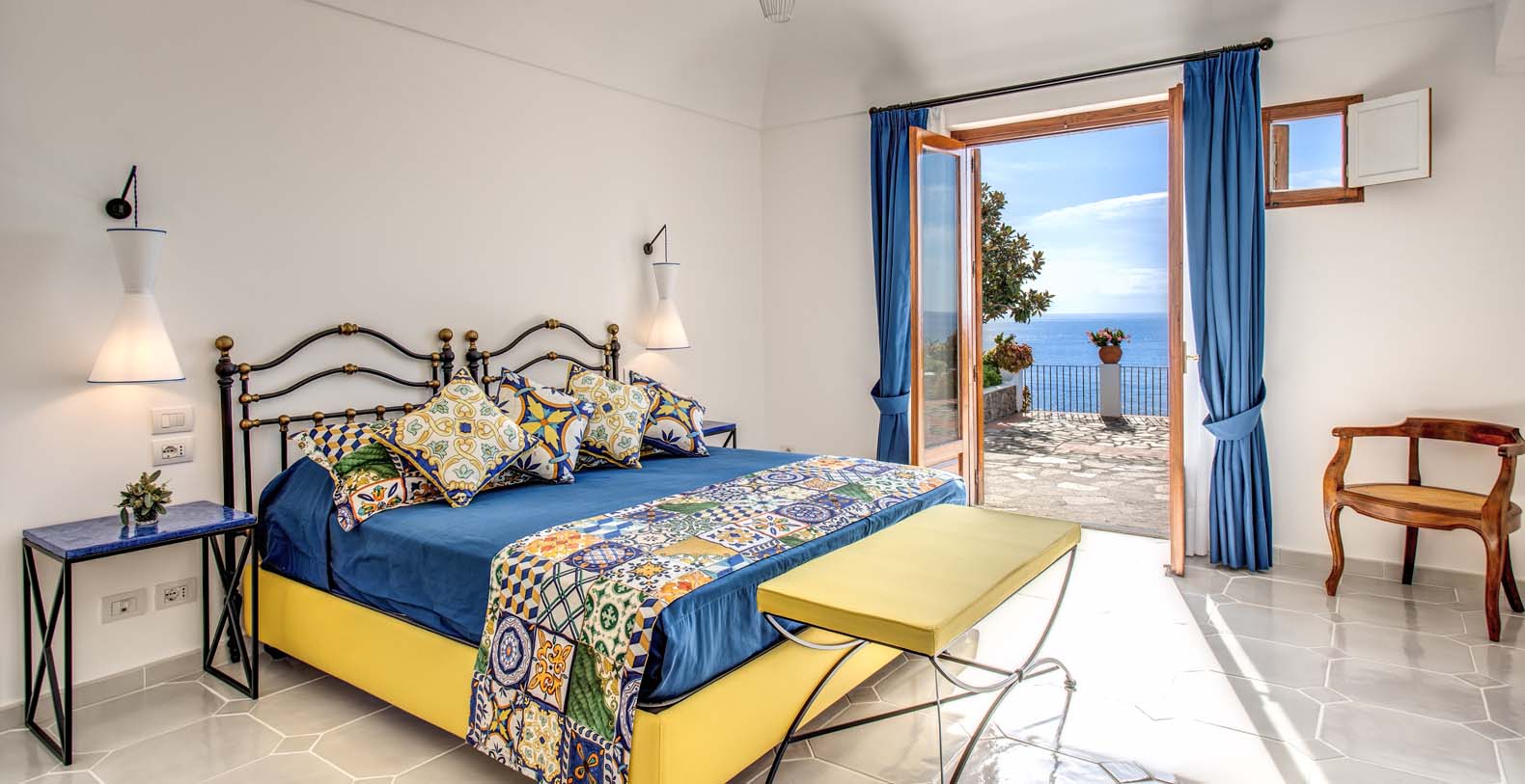 The Villa is located in a perfect location to explore the Amalfi area: 6,5 km to Positano, 8 km to Amalfi, 30 km to Pompei and 70 km to the Naples Airport. Villa Bideri is located just a few steps from the restaurants, bars and main shops. You will find the nearest restaurant 50 mts away, the SITA bus stop for the Amalfi Coast – Sorrento line – is a few meters away and the nearest beach is within easy walking distance. Surrounded by large terraces with Mediterranean plants and flowers, the villa boasts impressive views of the sea from Salerno bay to Capri, and Positano to Amalfi.