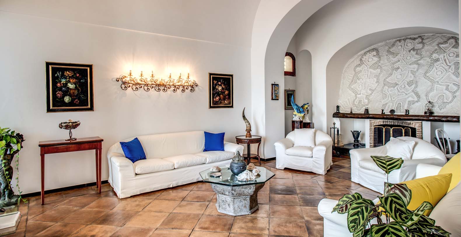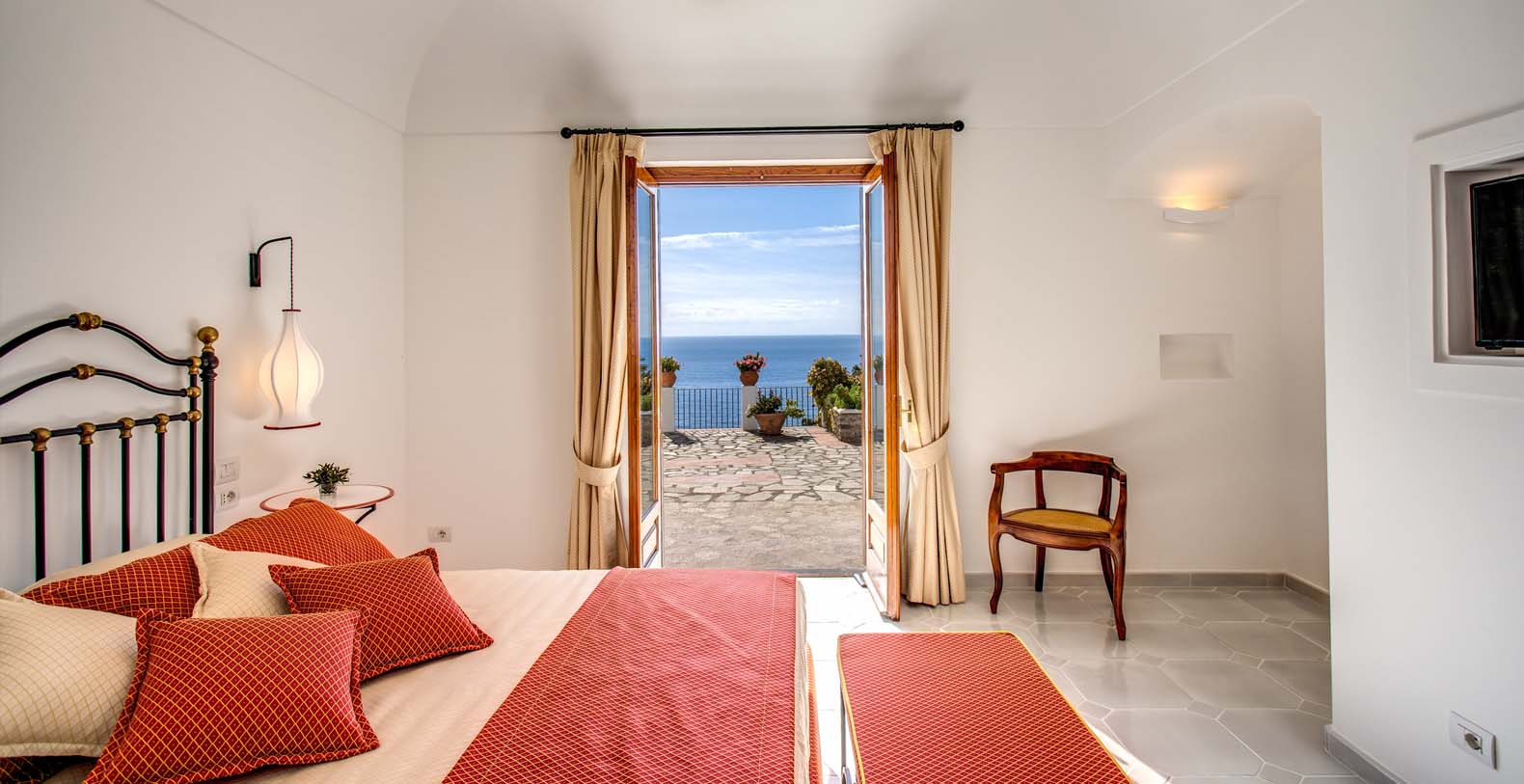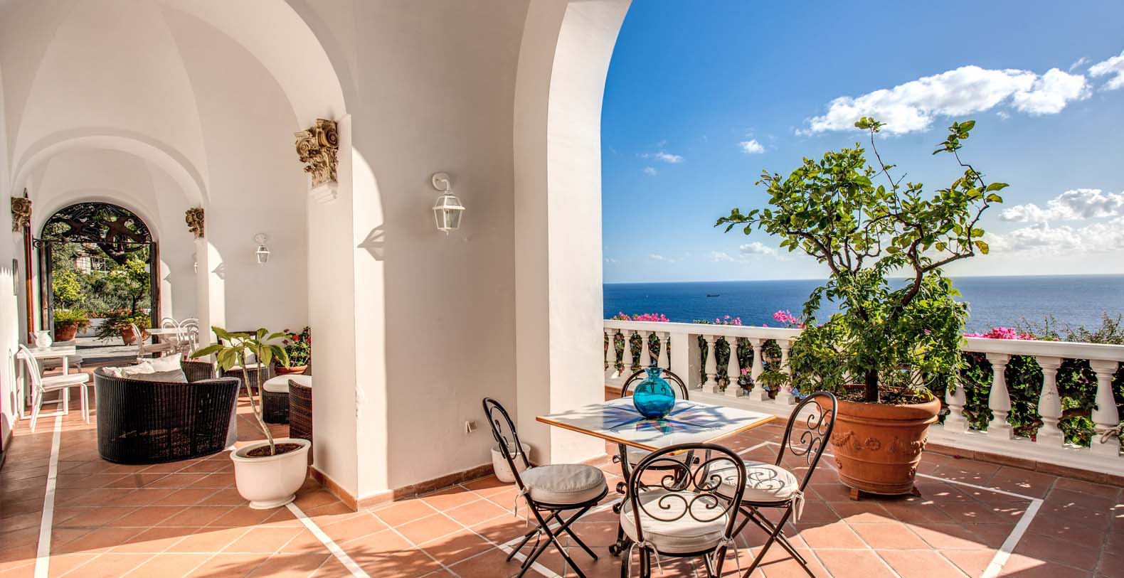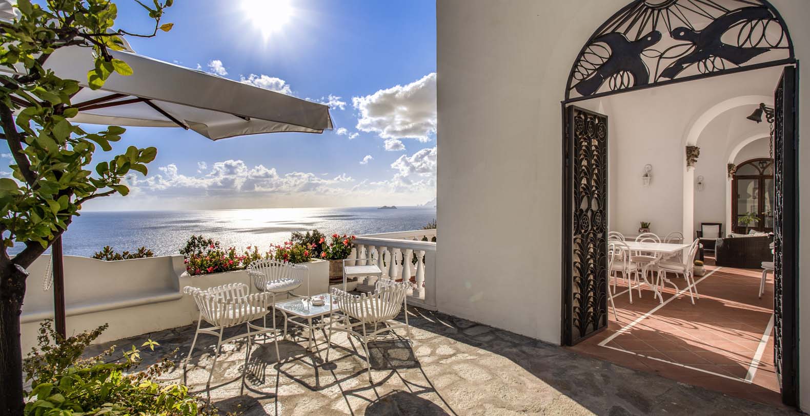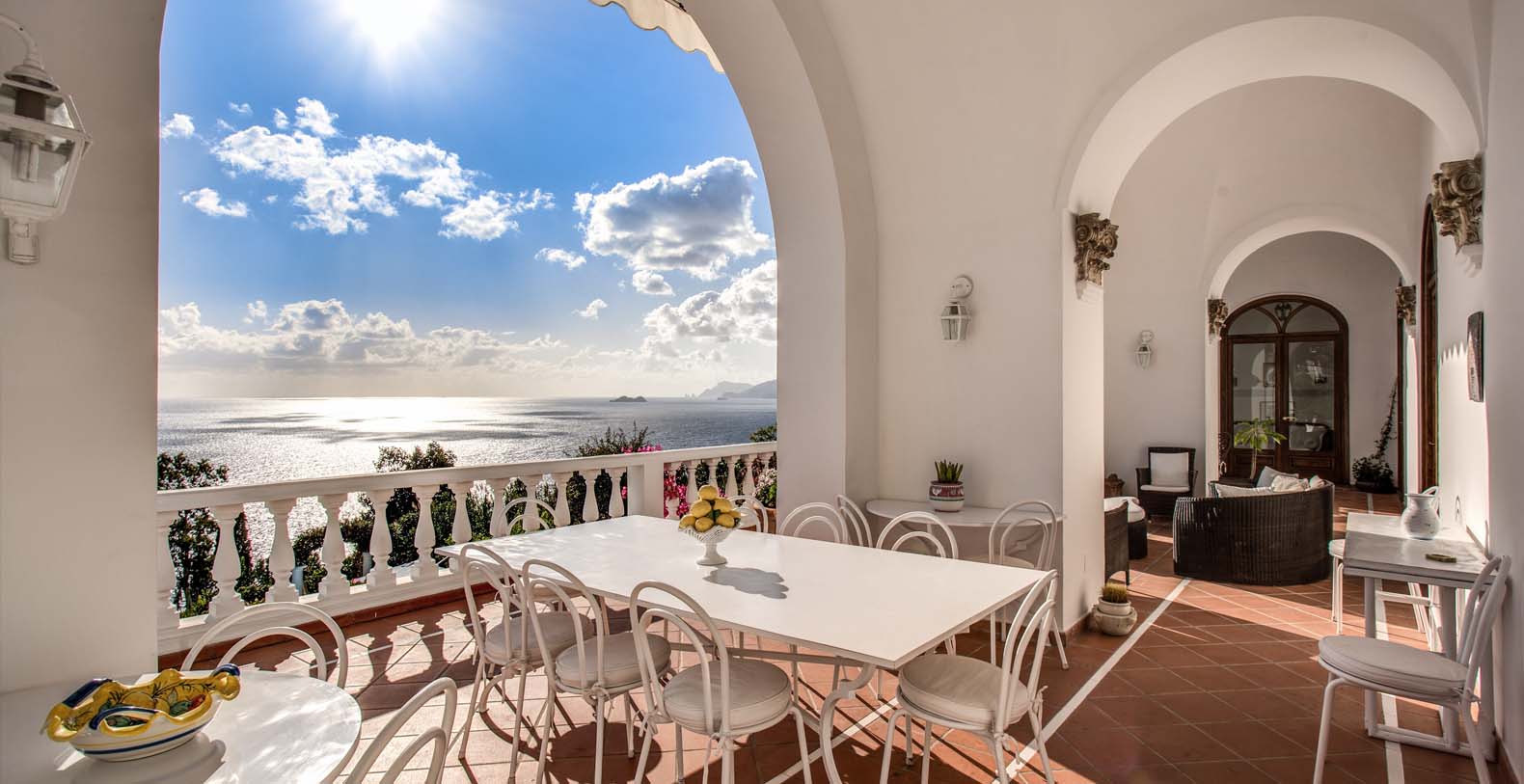 The entrance is only few steps from the main road (67). A beautiful white staircase brings you inside the property. you’ll access a large terrace with lemon trees and take in a first impressive panoramic view of the coast. The terrace is equipped with chairs, a stone barbecue and a pizza oven at the guest’s disposal. Lunch and dinner can be taken overlooking the incredible vista of the Amalfi Coast, in the next terrace adjacent to the main living room.