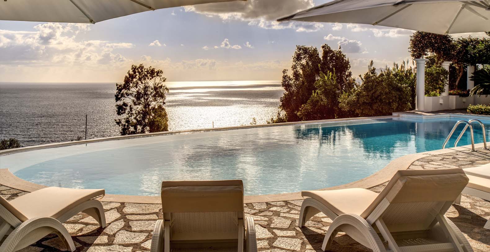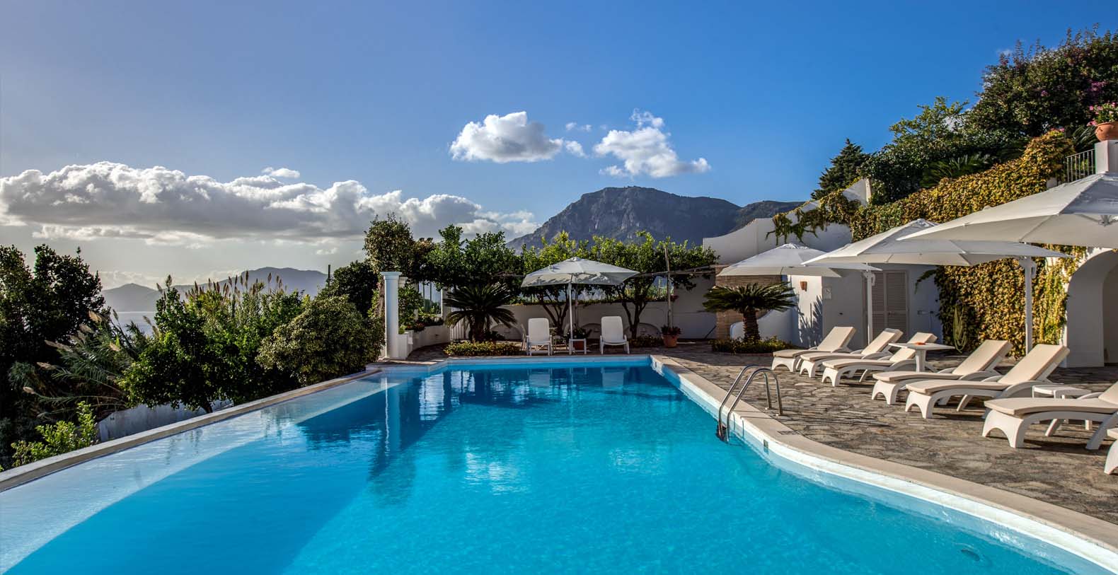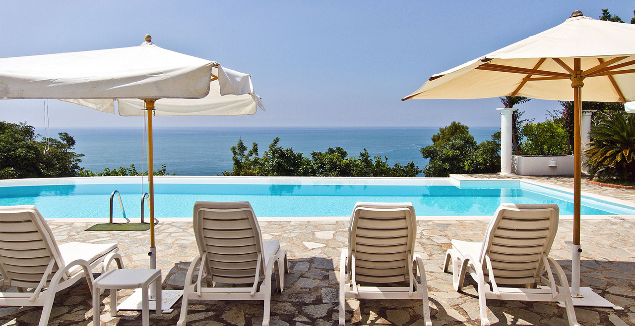 A staircase leads to a second terrace where you can find another set of table and chairs and a beautiful bed of roses. The same staircase leads to the amazing sea water pool (18 x 5 mt) set on a large terrace paved with natural stone and lined with white columns. There is also a shower, toilet and a mini-bar at this level. The pool can be heated on request.
