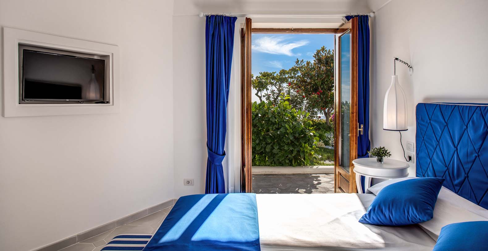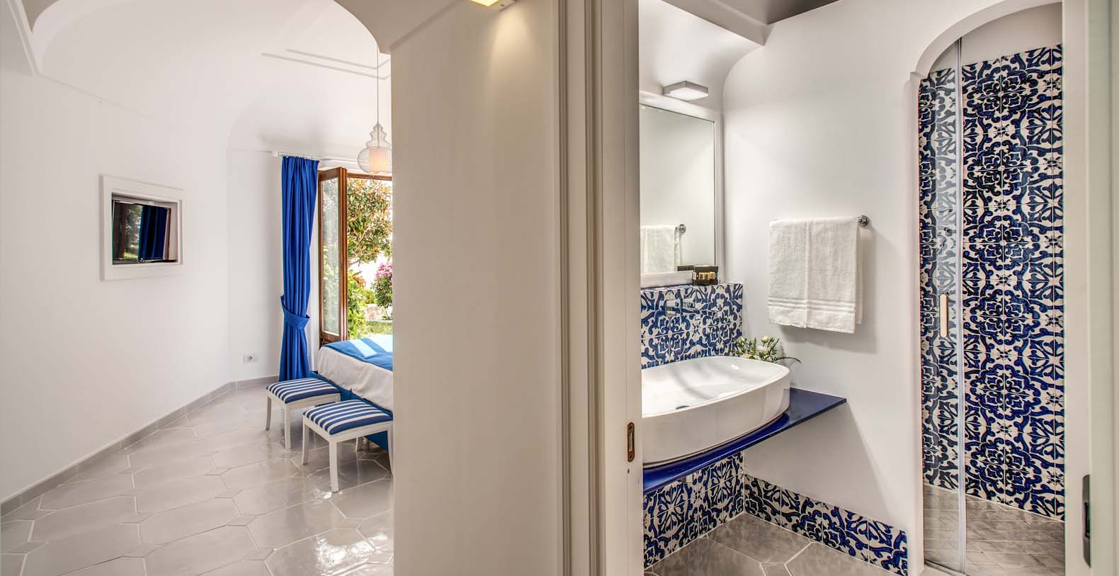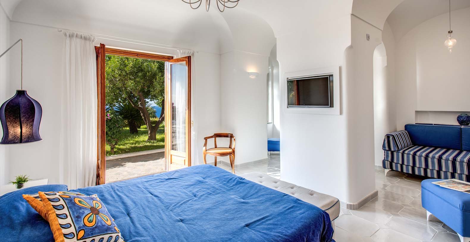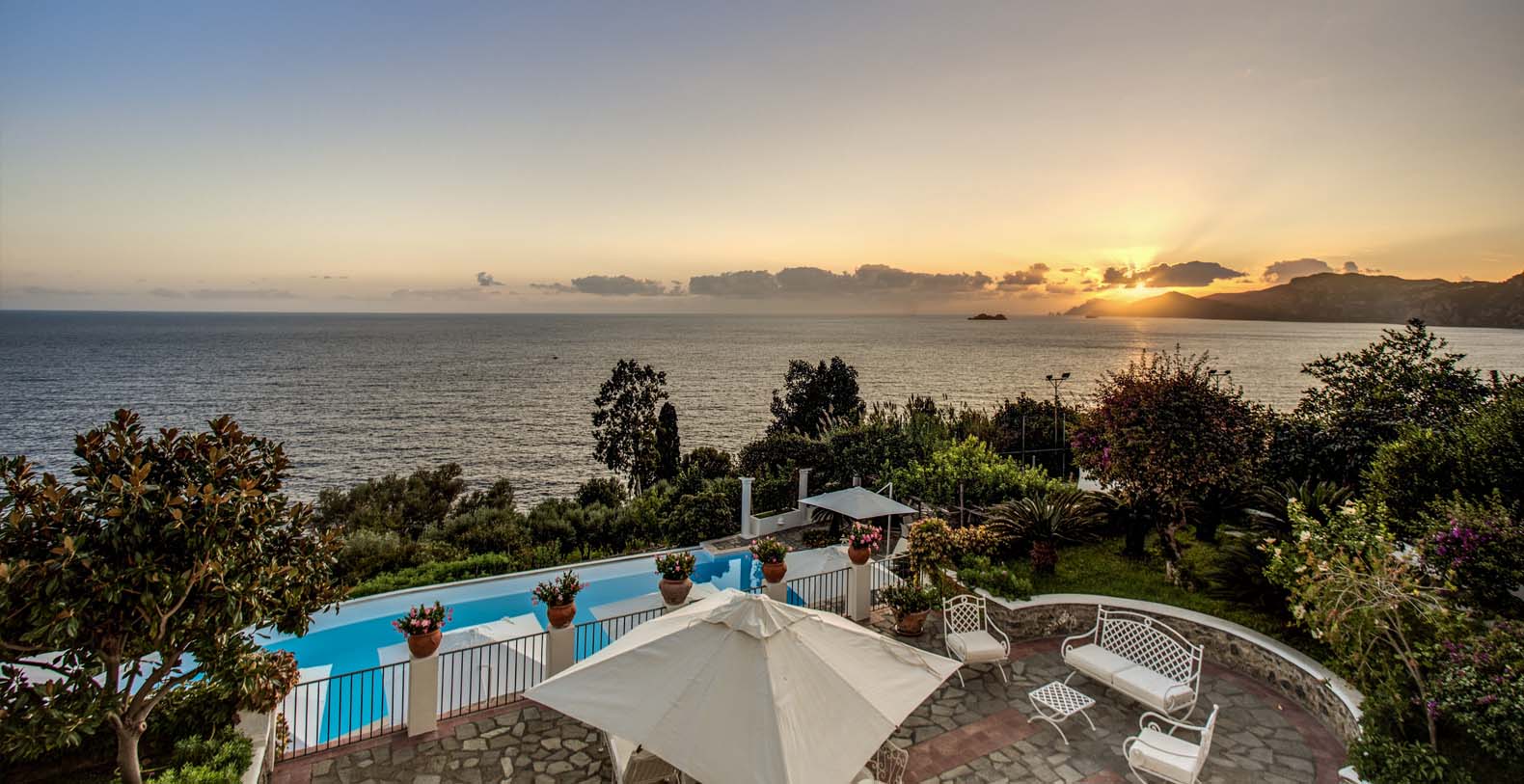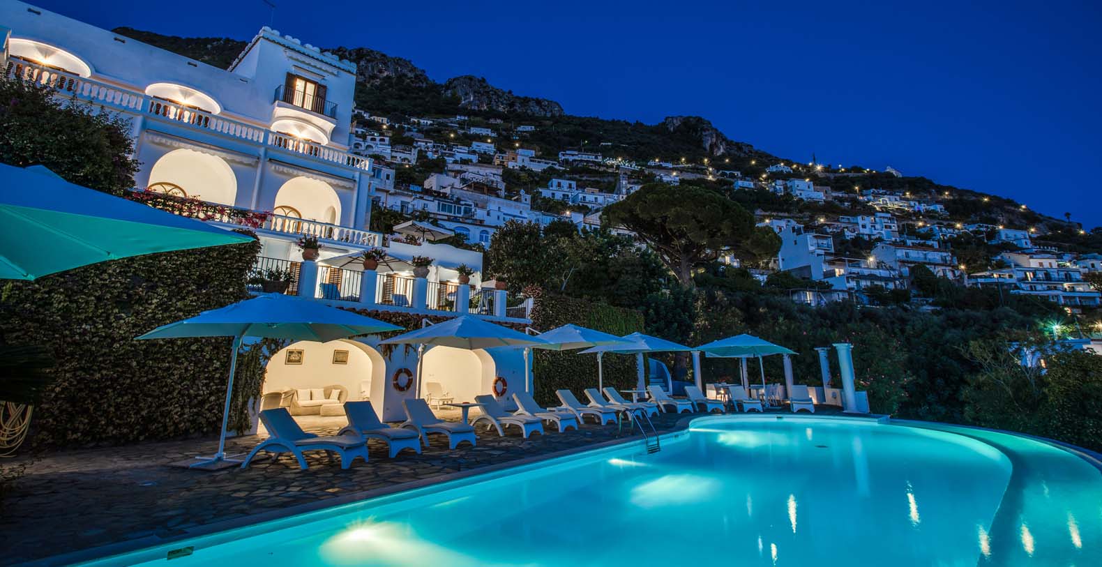 From the pool terrace there are incredible views of the sea, the coast and the islands of Li Galli. Furnished with sun loungers and large umbrellas, the area is also equipped with an outdoor shower, and shade is provided by orange and lemon trees. The terrace and pool are lit up at night. Next to the pool area you’ll find also a shaded area furnished with a comfortable sofa and equipped with a fridge.