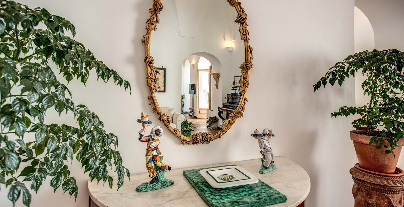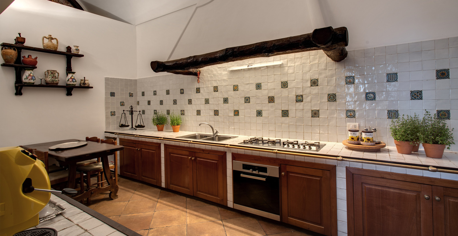 the ground floor consists of: a shady terrace runs all along the floor, a fully equipped kitchen with fridge, freezer with ice maker, large oven, microwave and dishwasher, laundry (washing machine can be used only by the staff); a powder room; a large living room with sofa and a cozy study area facing on the terrace; a dining room opening on the terrace. The dining room has a large table with glass top, seats 12, the room is decorated with original fragments of columns and Roman remains. The main floor is furnished with antique furniture, a marble table, a grand piano, sofas and a fireplace.