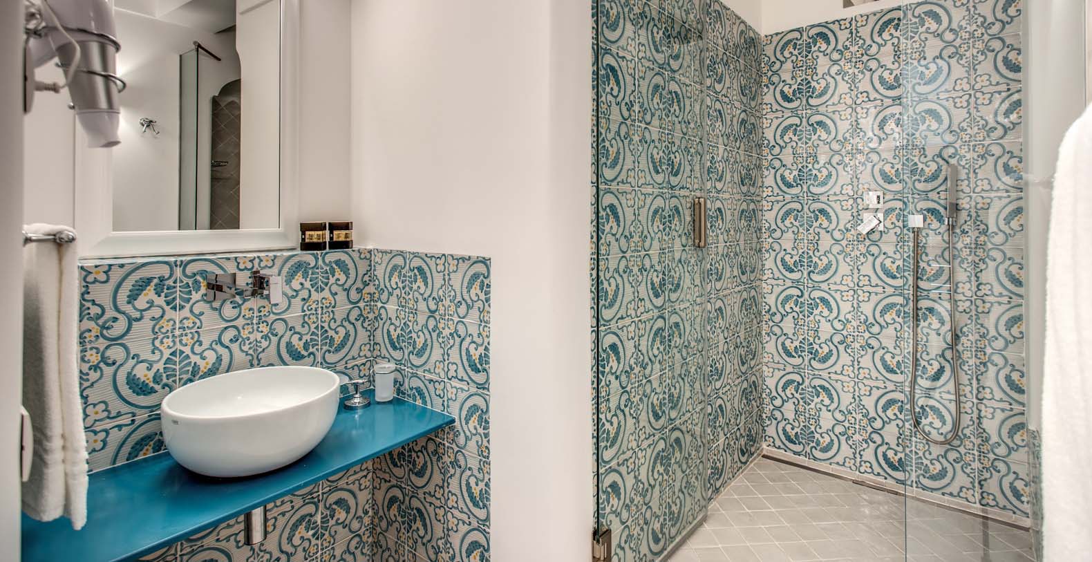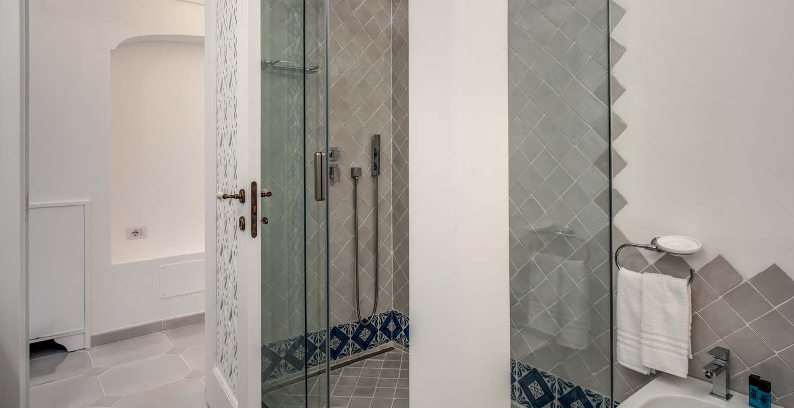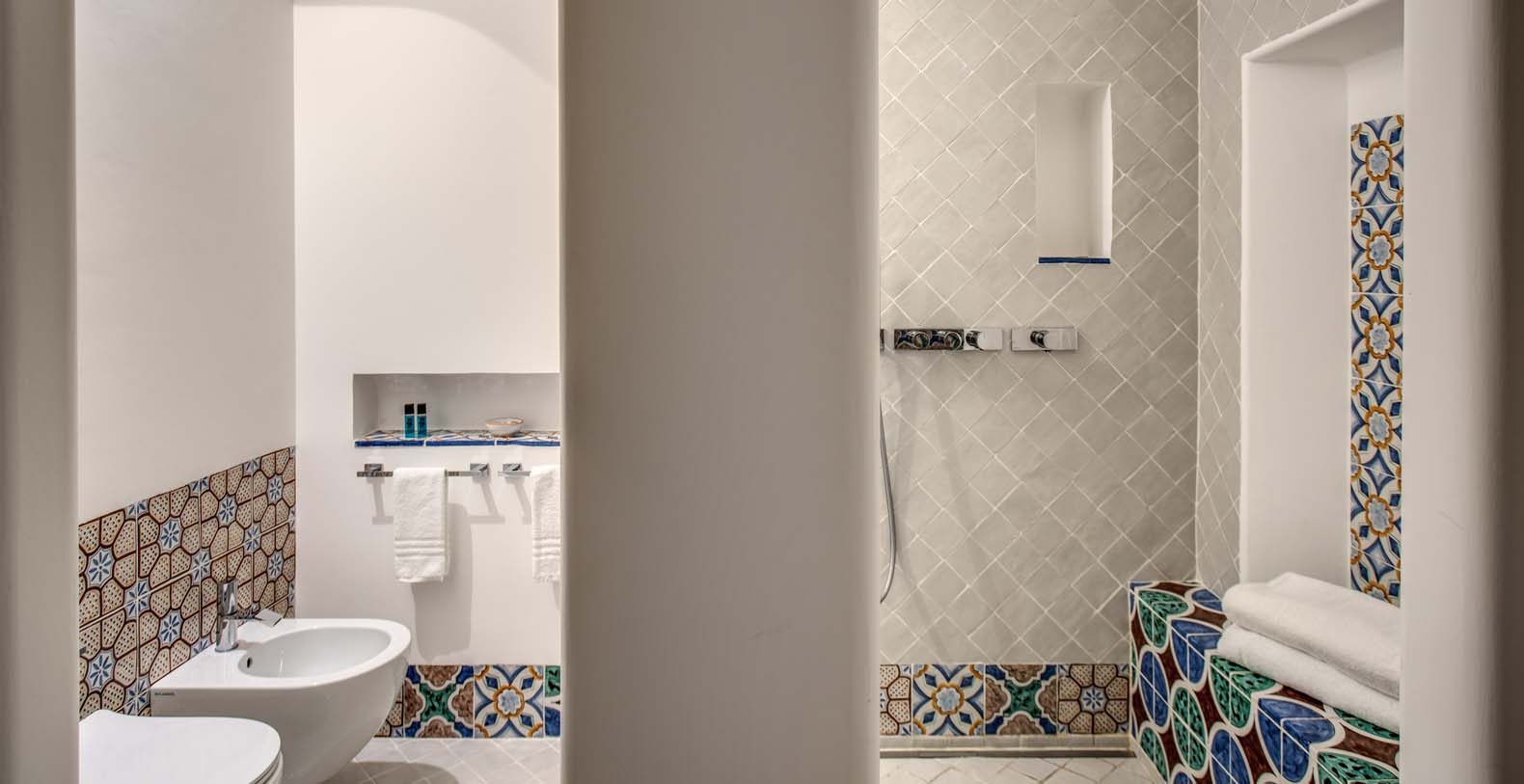 Tower: The access to this annex is through a 25 steps staircase from the entrance. The apartment consists of 2 double bedrooms. Both share a small bathroom with a shower. French doors open to a small balcony with a stunning view on the Coast and the Town of Praiano. The Tower is available on request with an extra cost (only for the guest of the main villa).