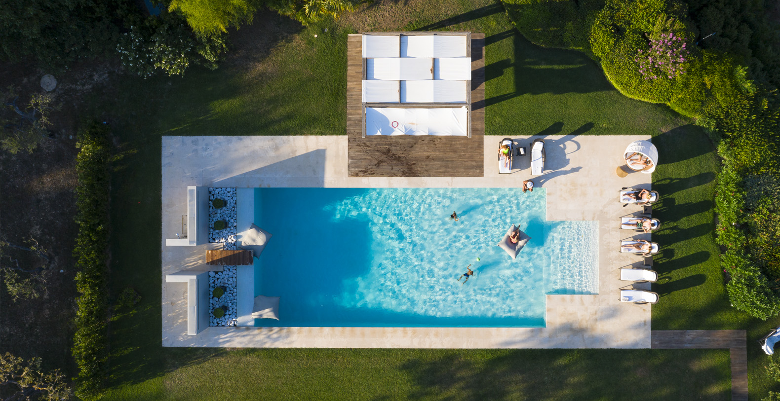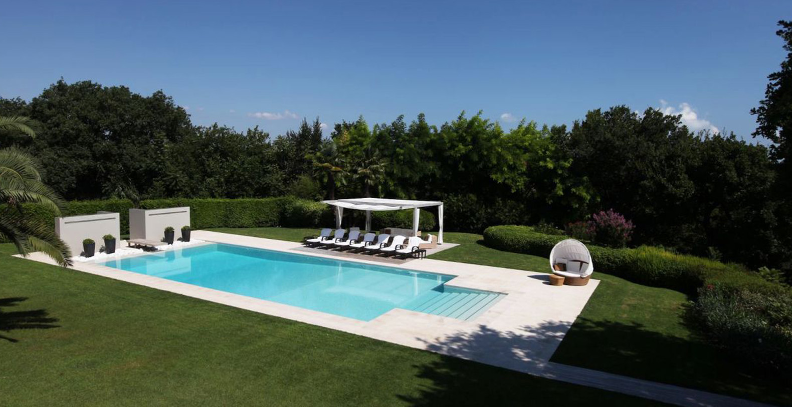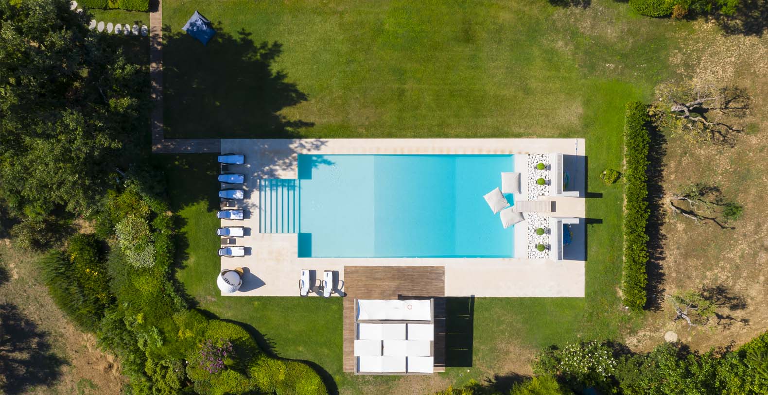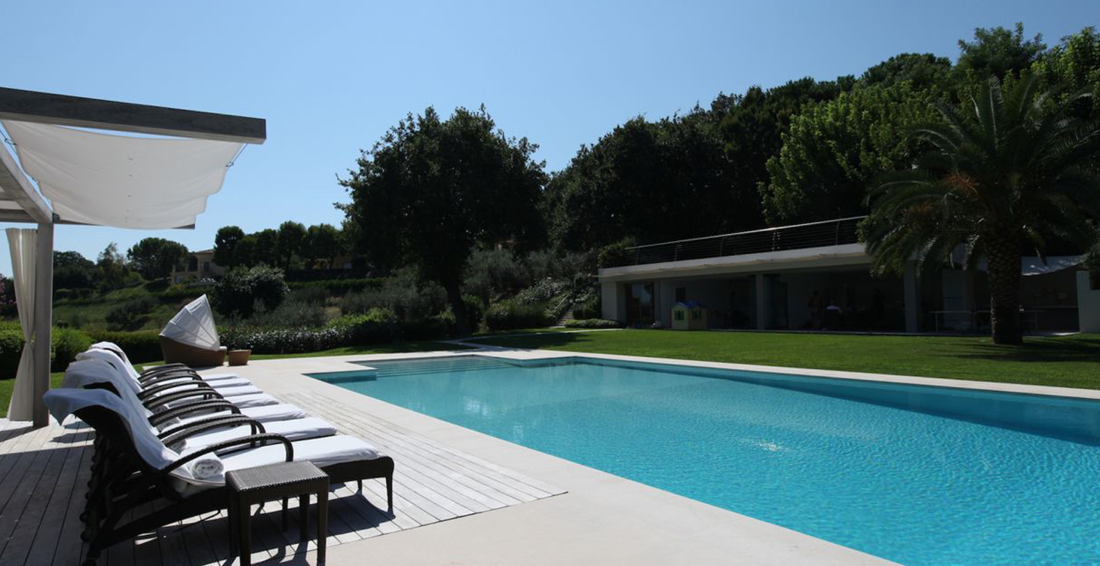On the sweeping grounds, there are two swimming pools; the one at the main building is heated on request and has an infinity edge Hidden away, yet very close to the local town center, this estate includes ten bedrooms decorated in elegant style with color-washed walls in pale shades, contemporary fabrics, and several bespoke furnishing by local Italian artisans. Its current owners redesigned and restored the property over 2 years to let the guests enjoy the quality of all the features of the house.