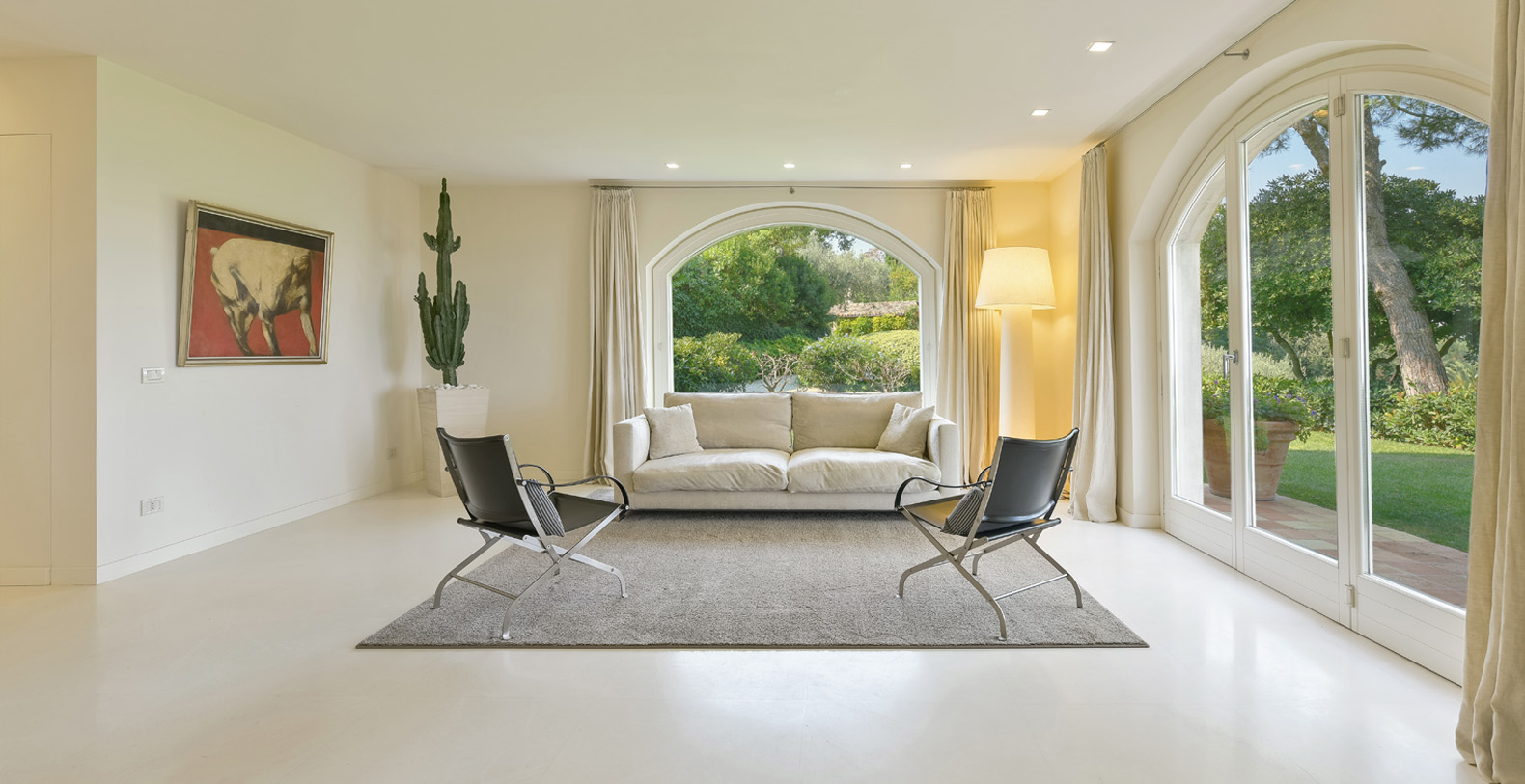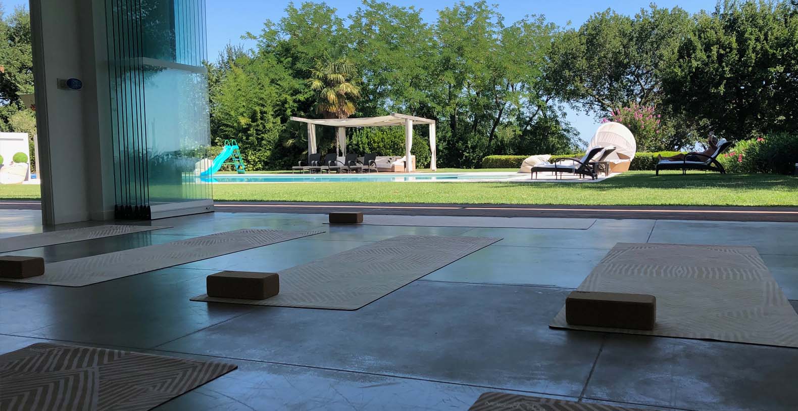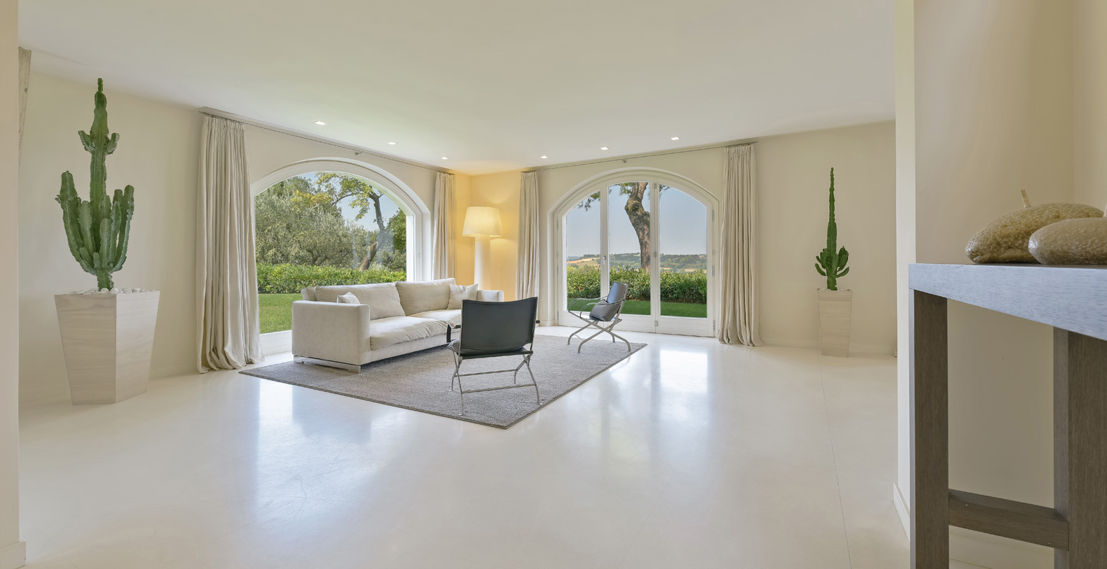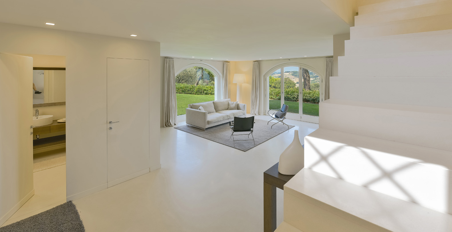 The home design, approached with research in the historical context, results in a modern style with natural stone, polished sleek concrete, brushed steel fittings. Modern yet very comfortable, this is a retreat full of light and a welcoming vibe. The main building interior measures 600 square meters, while the dépendance building measures 220 square meters. Altogether, it is possible to accommodate a total of 20 adults, and 2 extra friends or staff. The estate includes more than 3 hectares of private grounds, an olive grove and a tennis court. This is an environment especially designed for yoga enthusiasts.
