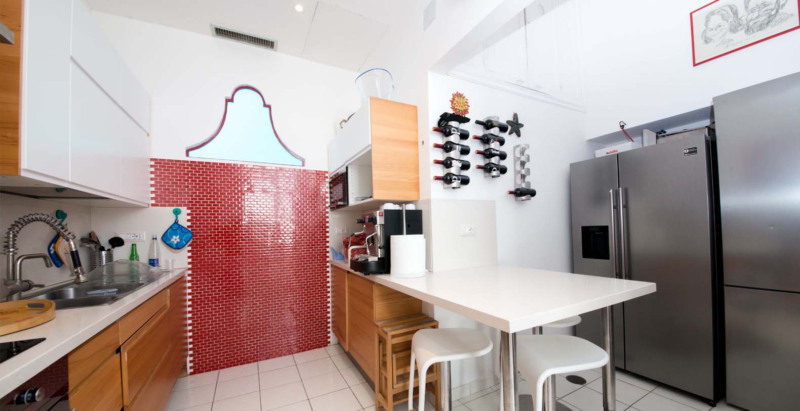 A kitchen equipped with industrial fridge with an ice machine; Italian/American coffee makers; oven; microwave; induction hob; dishwasher; and table seating complete this floor.
