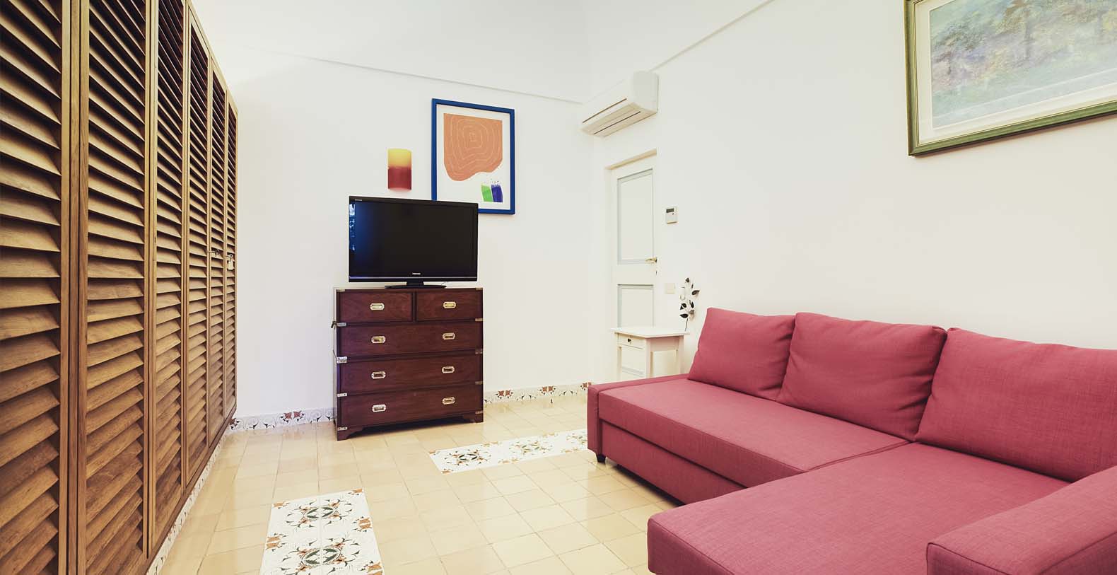 Upon entry there is a hall equipped with antique furniture. The left staircase leads down to the mid-level floor. The ground floor offers a master bedroom with queen size bed (1.6x2.00m) with en-suite bathroom with a bathtub. There is also a small balcony. The bedroom provides access to the sitting room that can become either totally private or be reached from the main living area through a door. This room leads to a spacious panoramic terrace through its two French doors.