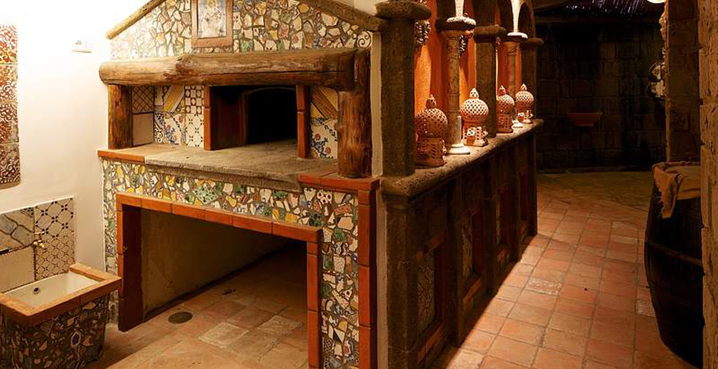 The pool area is also equipped with an outdoor patio, decorated in tufo stone and antique majolica tiles. Here, you and your group can pass the summer evenings, using the professional kitchen, wood-fired oven, and barbecue to prepare delicious dinners with the fresh and local ingredients for which the Amalfi Coast is famous.