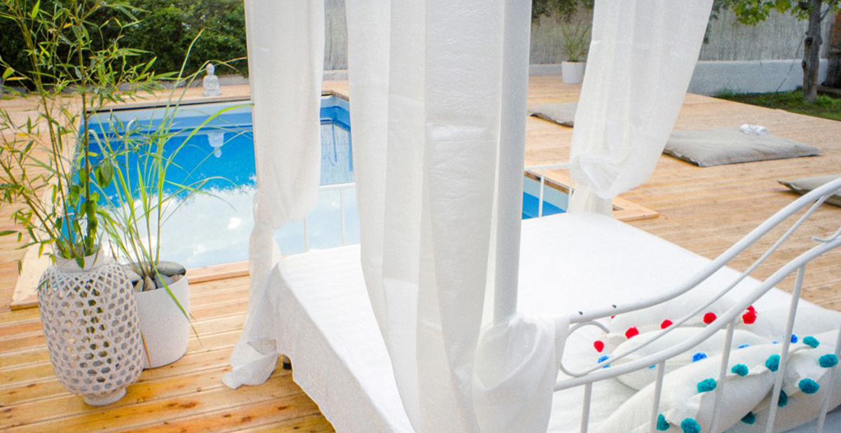 There is an covered living area near the pool which offers a sofa and armchairs, perfect spot for relaxing. There is a separate laundry room in the garden with a washing machine and an additional full-sized fridge/freezer