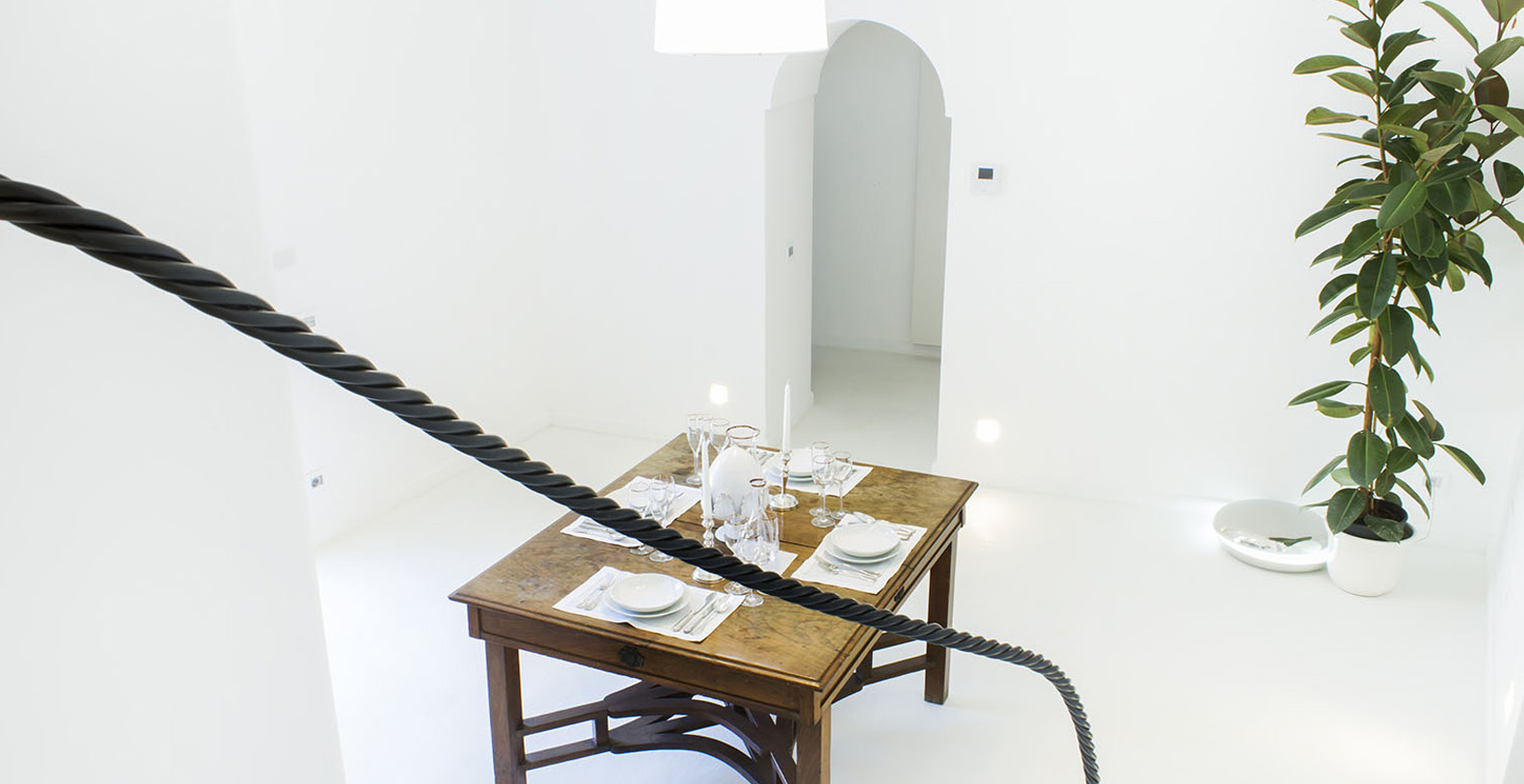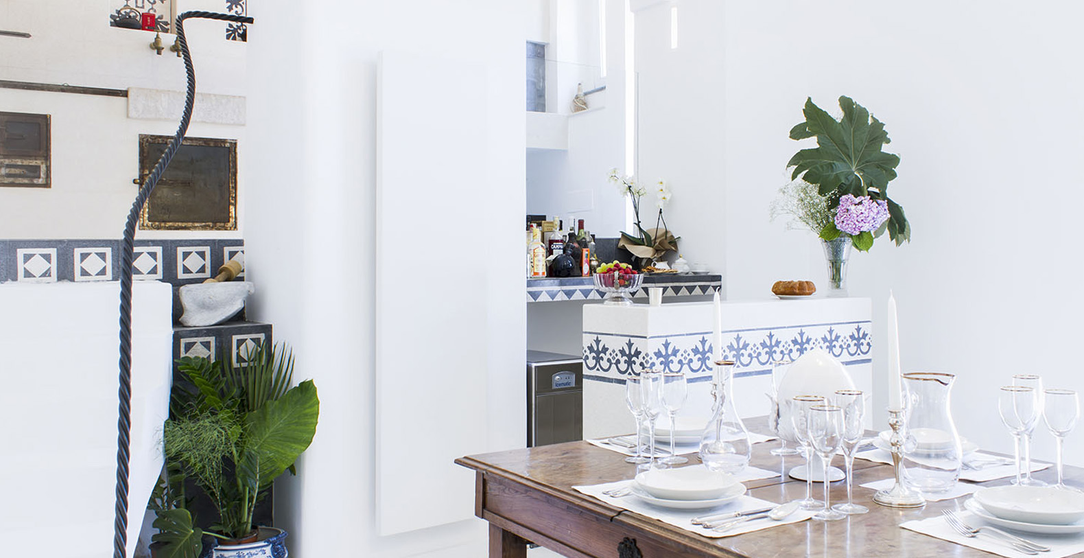 In the living area there is a large antique dining table, lamps with a modern design, a bouvette with an ice machine, a Nespresso machine for coffee, ceramic services for milk and tea, a marble bathroom.