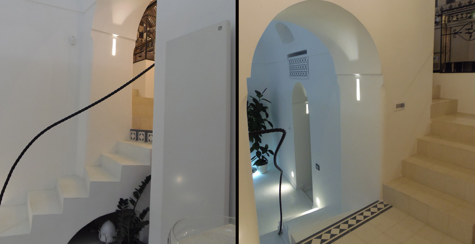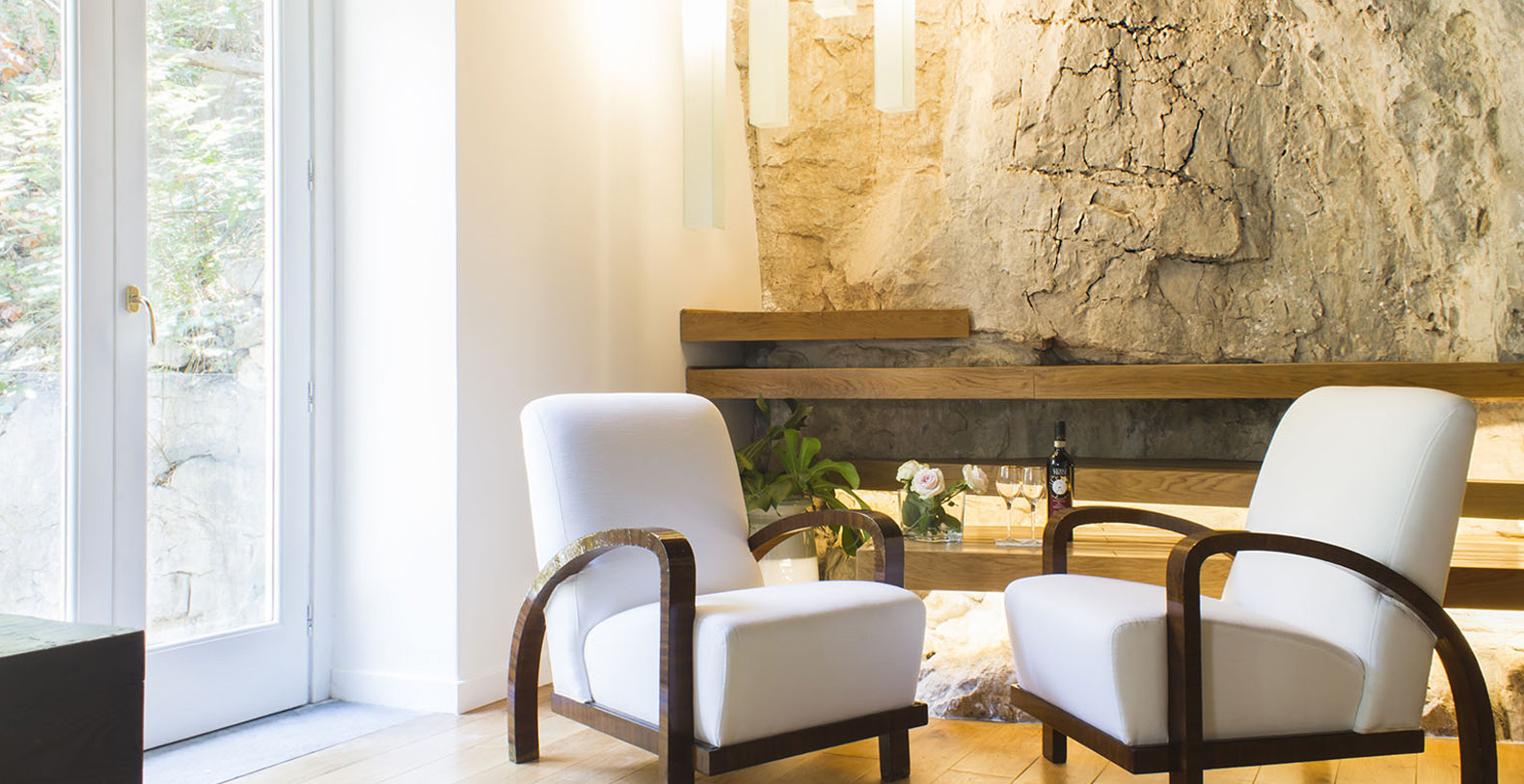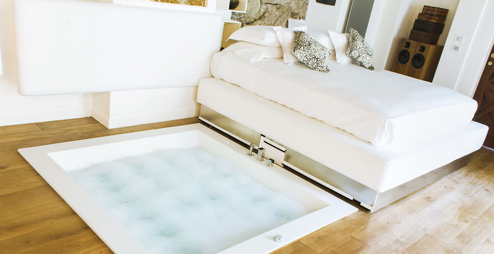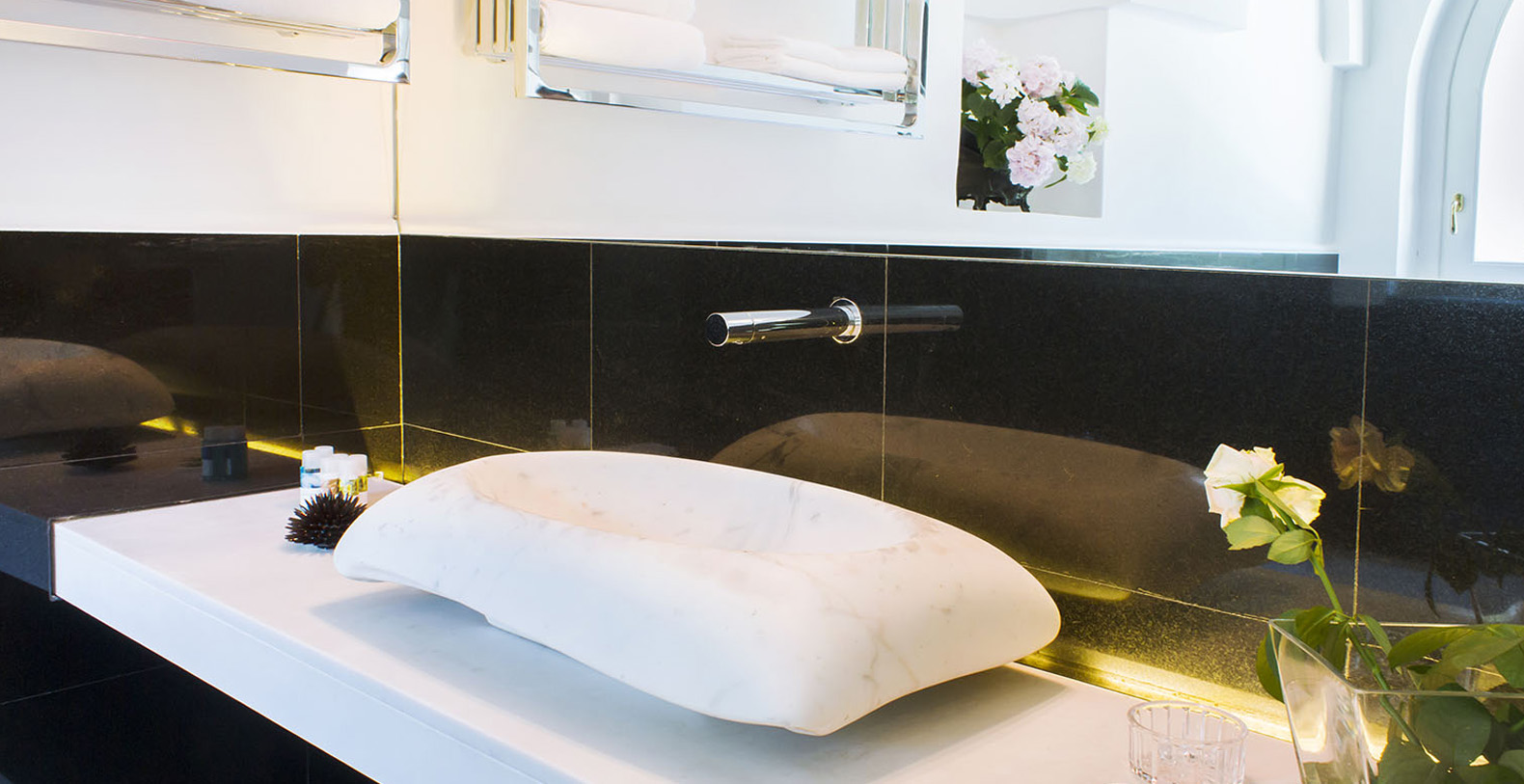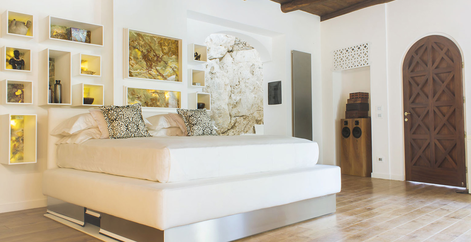 The interiors of the Shah offer two exclusive junior suites with 3 private bathrooms, in rock and marble, and two large, latest generation hot tubs. The use of local stone, comfortable designer beds, vaulted ceilings, oak parquet and lime-based plasters create an elegant atmosphere in a game of alternating black and white.