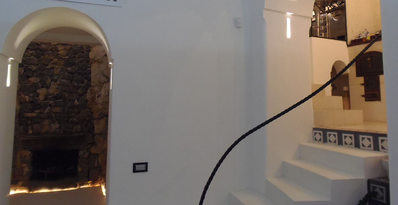 The main entrance of the estate, which is on two levels for 160 meters, opens to a fascinating space that shows the ancient structure where you can have breakfast or lunch or relax in front of the fireplace sipping a drink served to the delicious bouvette