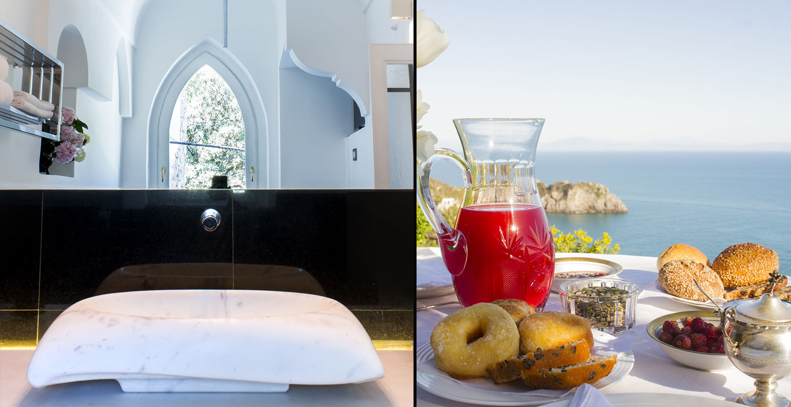 The outdoor lounge is located on the Belvedere, a few meters from the main entrance of the Villa overlooking the sea of the Bay of Capo di Conca, where you can admire the island of Li Galli, Faraglioni, and is furnished with bistro tables marble, chairs, sunbeds and a large parasol.