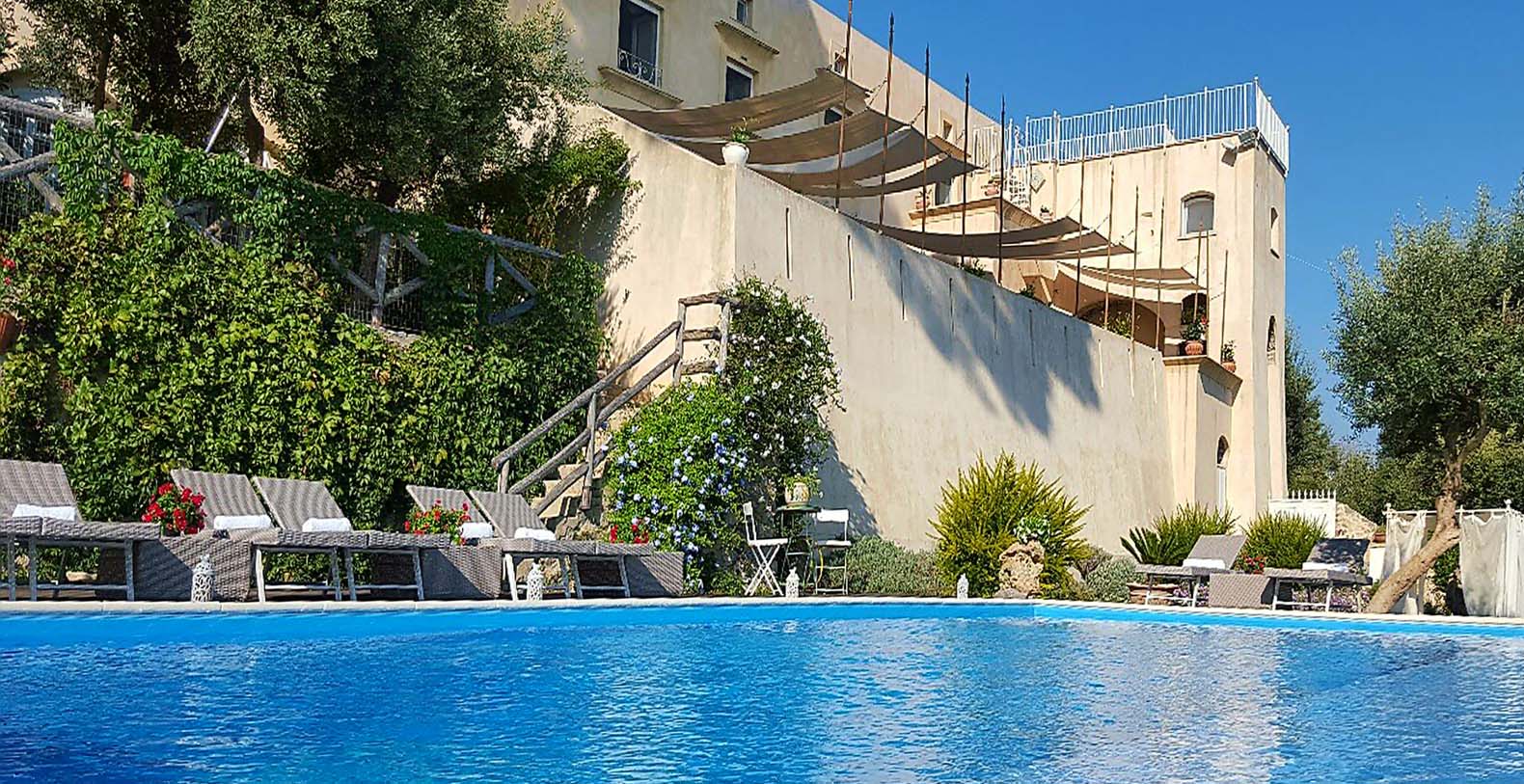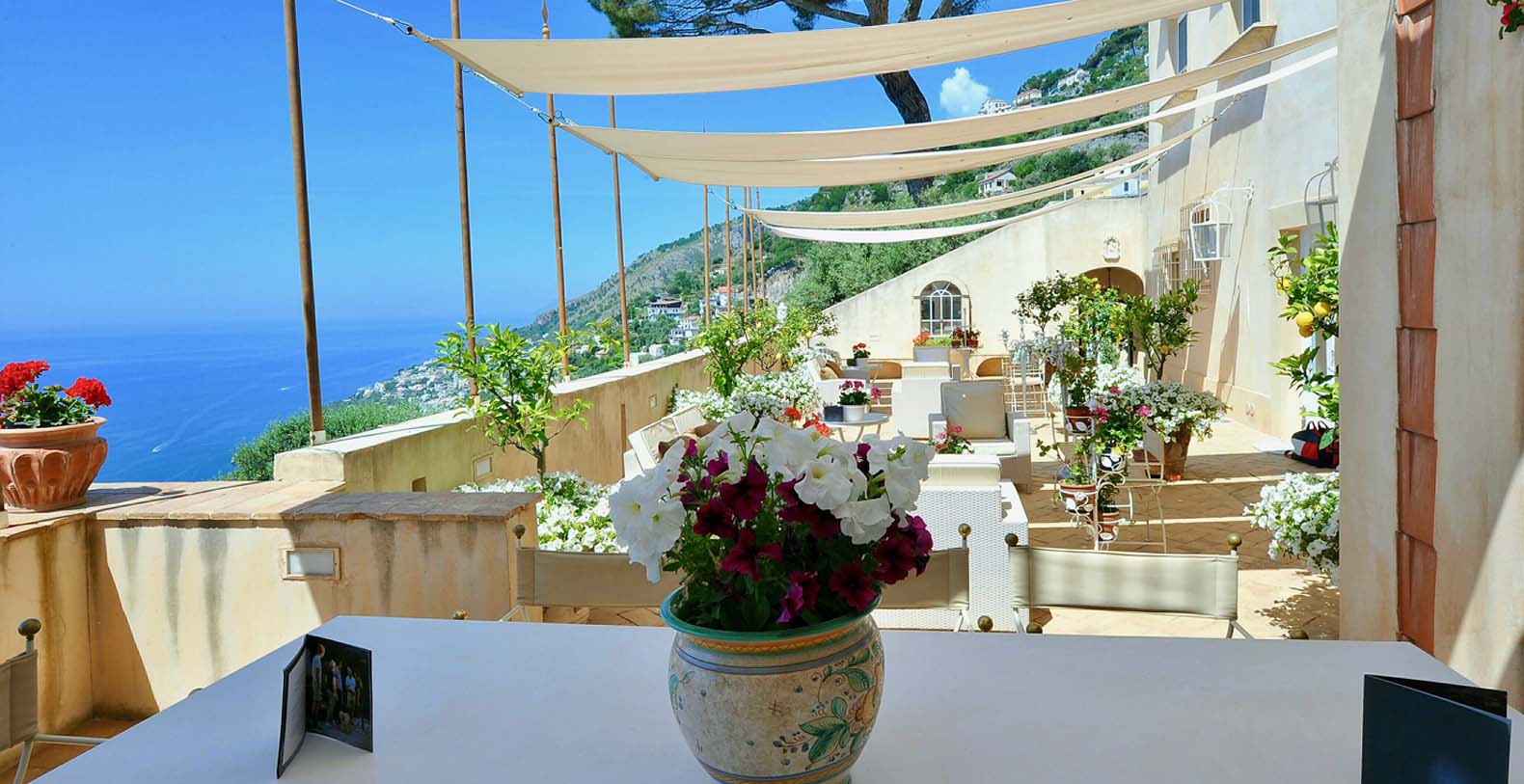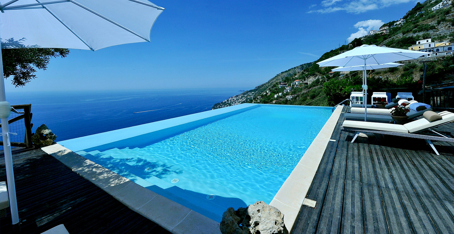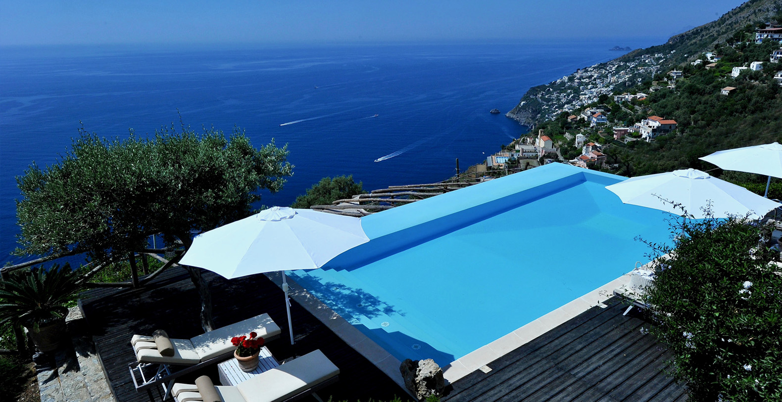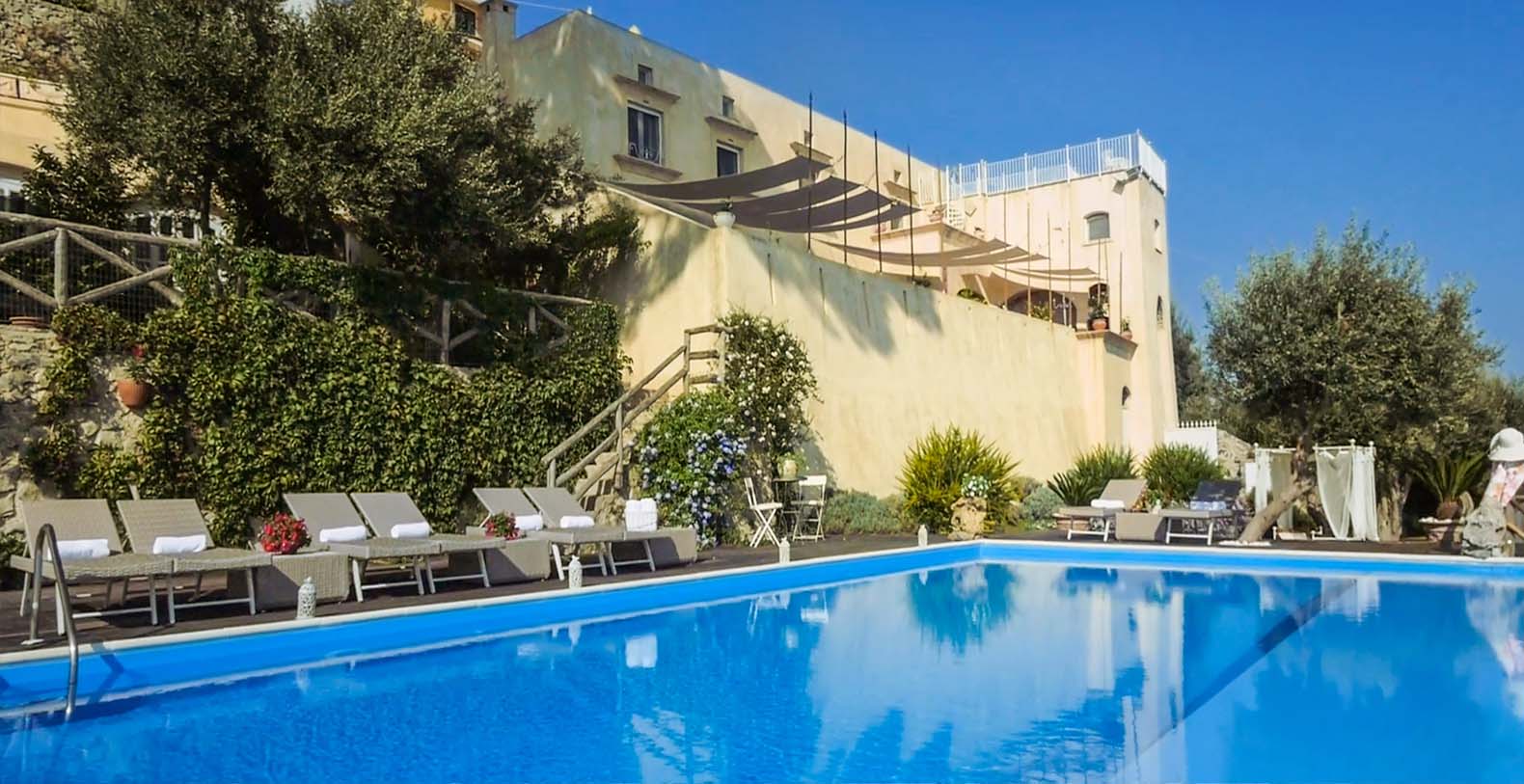 The villa is composed by two areas, the main villa and the annex, called limonaia (lemon house); the first features three double bedrooms with king size beds each with private bathroom, one with a stunning private sun terrace and solarium boasting a breath-taking panoramic view, all of them offering sea view. The limonaia offers a double bedroomed suite for 4 people with private bathroom, making this villa perfect for families with visiting friends. The property overlooks a garden with ancient olive trees and a unique view of the sea, together with a sea-salt infinity swimming pool which is one of the ten bests of the entire Amalfi Coast.