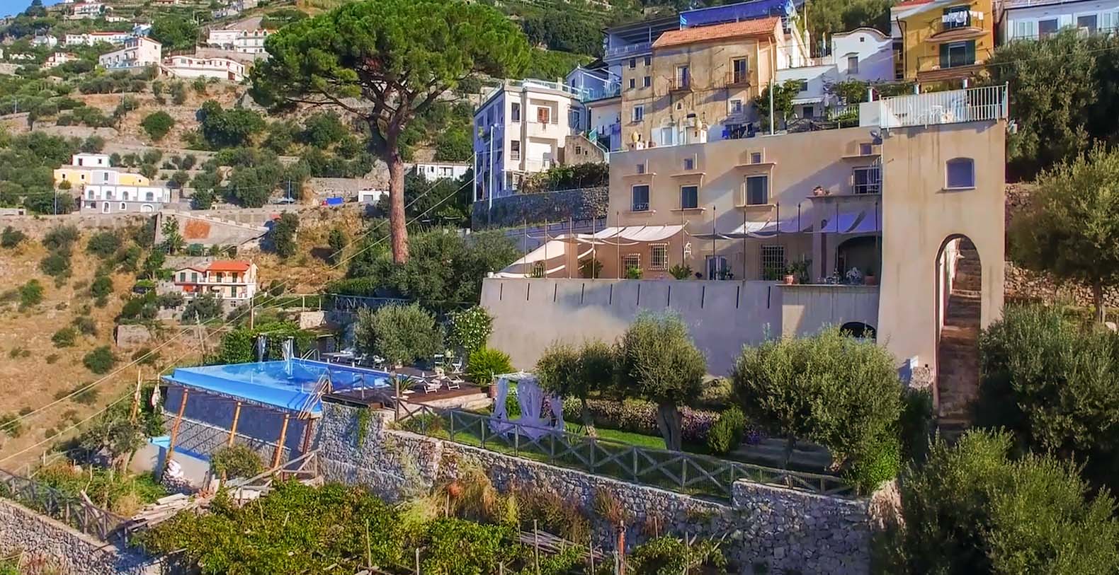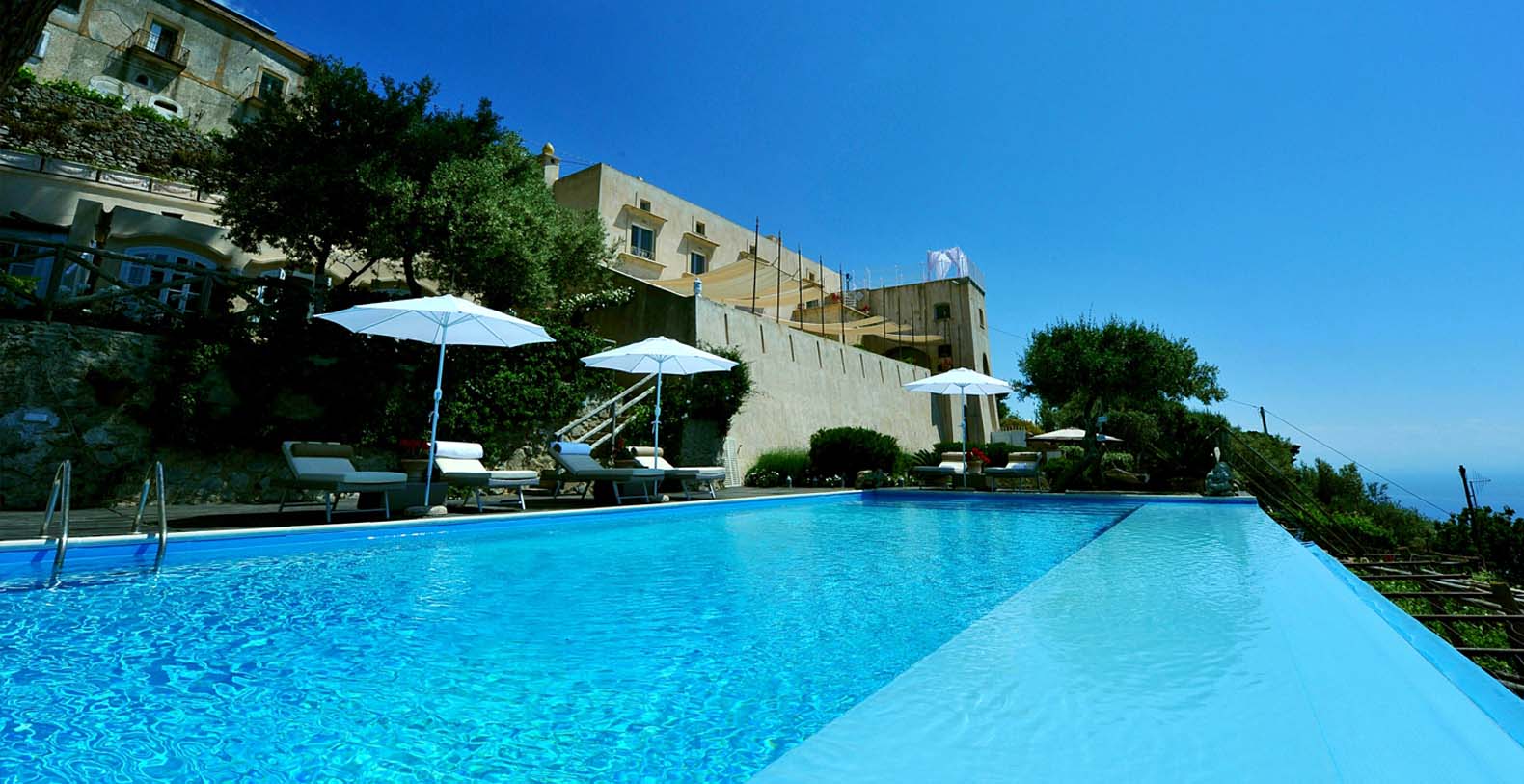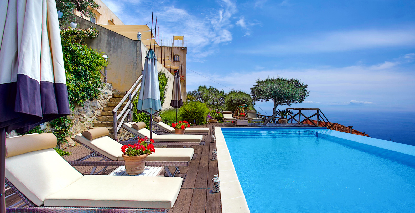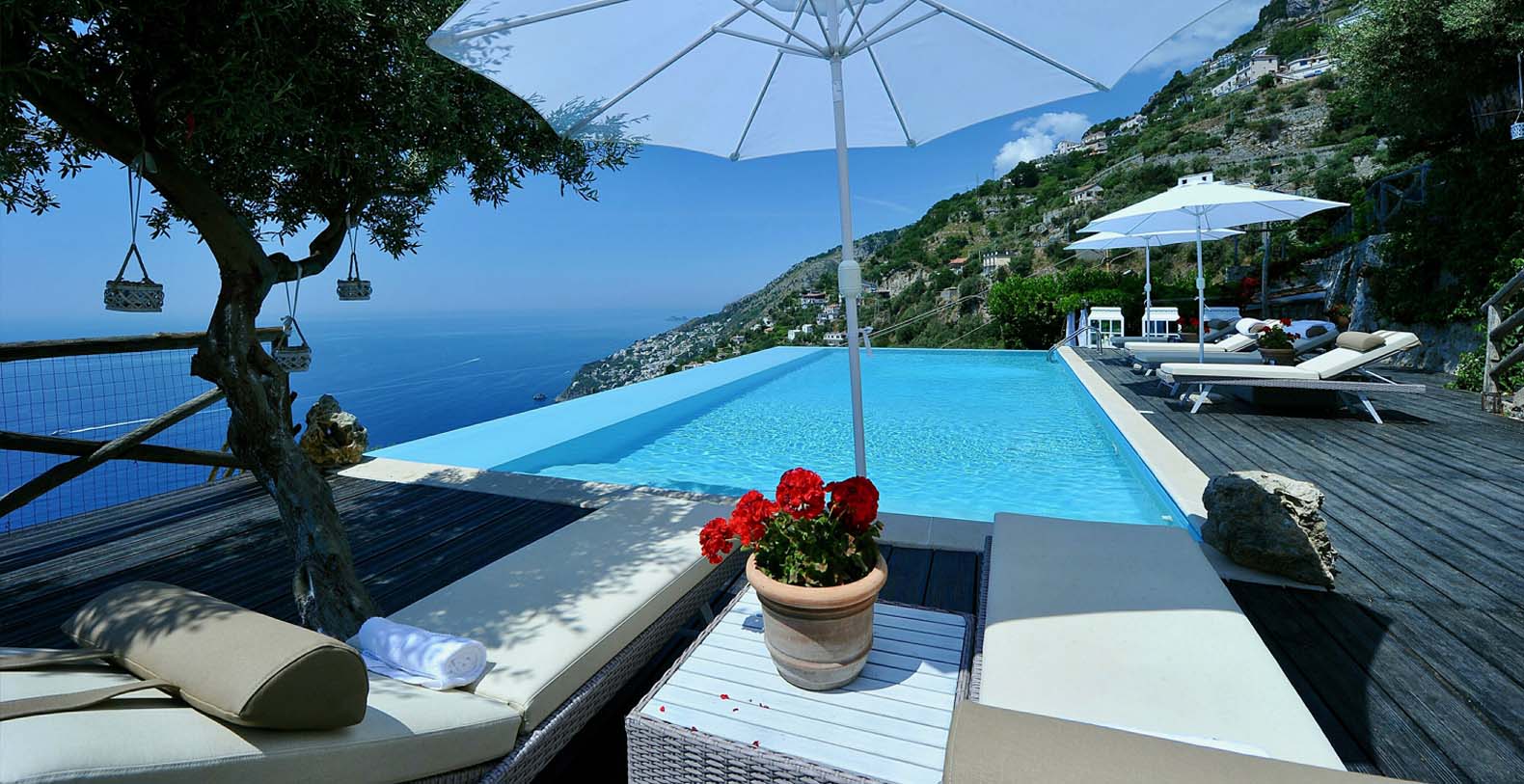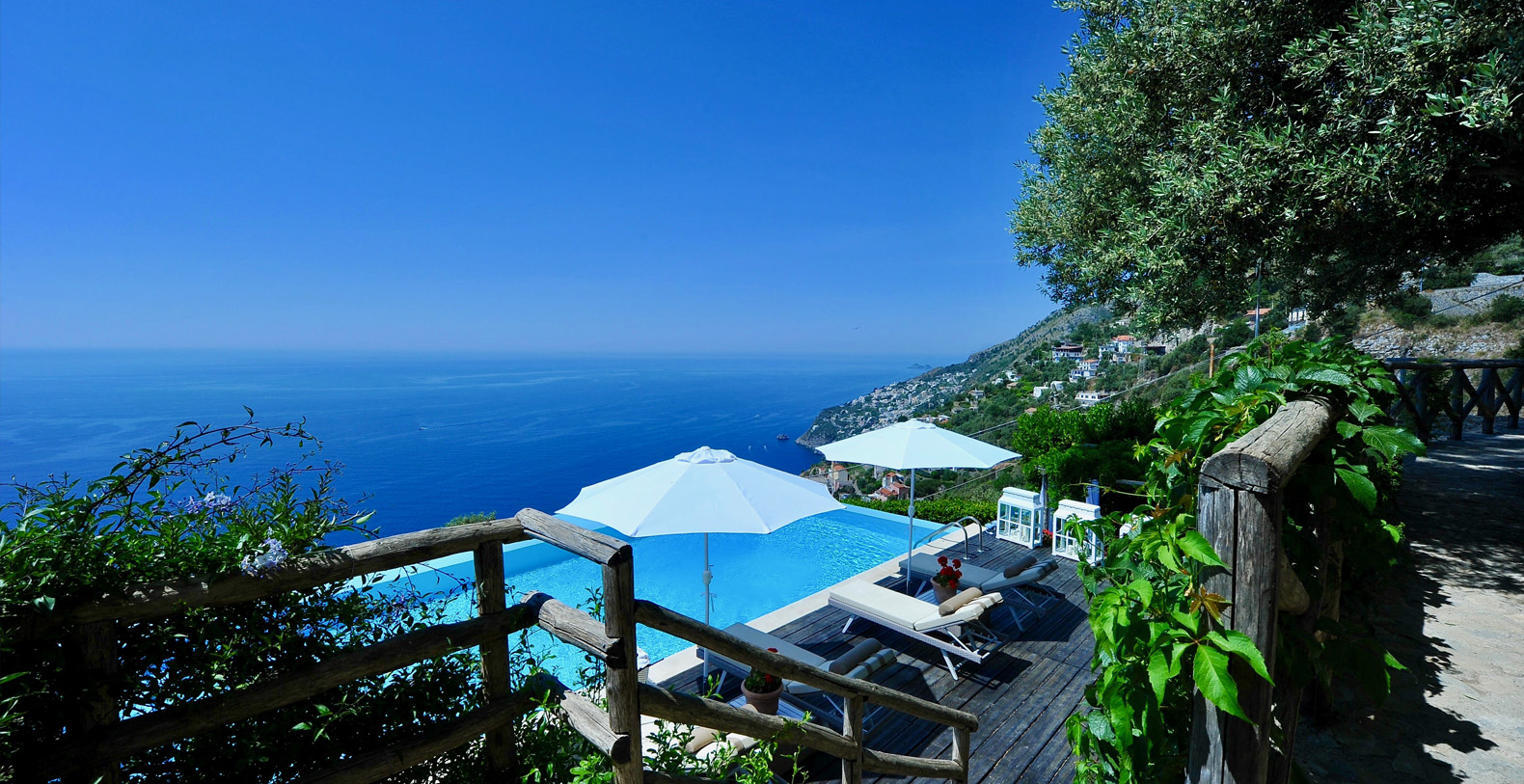 The villa is composed by two areas, the main villa and the annex, called limonaia (lemon house); the first features three double bedrooms with king size beds each with private bathroom, one with a stunning private sun terrace and solarium boasting a breath-taking panoramic view, all of them offering sea view. The limonaia offers a double bedroomed suite for 4 people with private bathroom, making this villa perfect for families with visiting friends. The property overlooks a garden with ancient olive trees and a unique view of the sea, together with a sea-salt infinity swimming pool which is one of the ten bests of the entire Amalfi Coast.