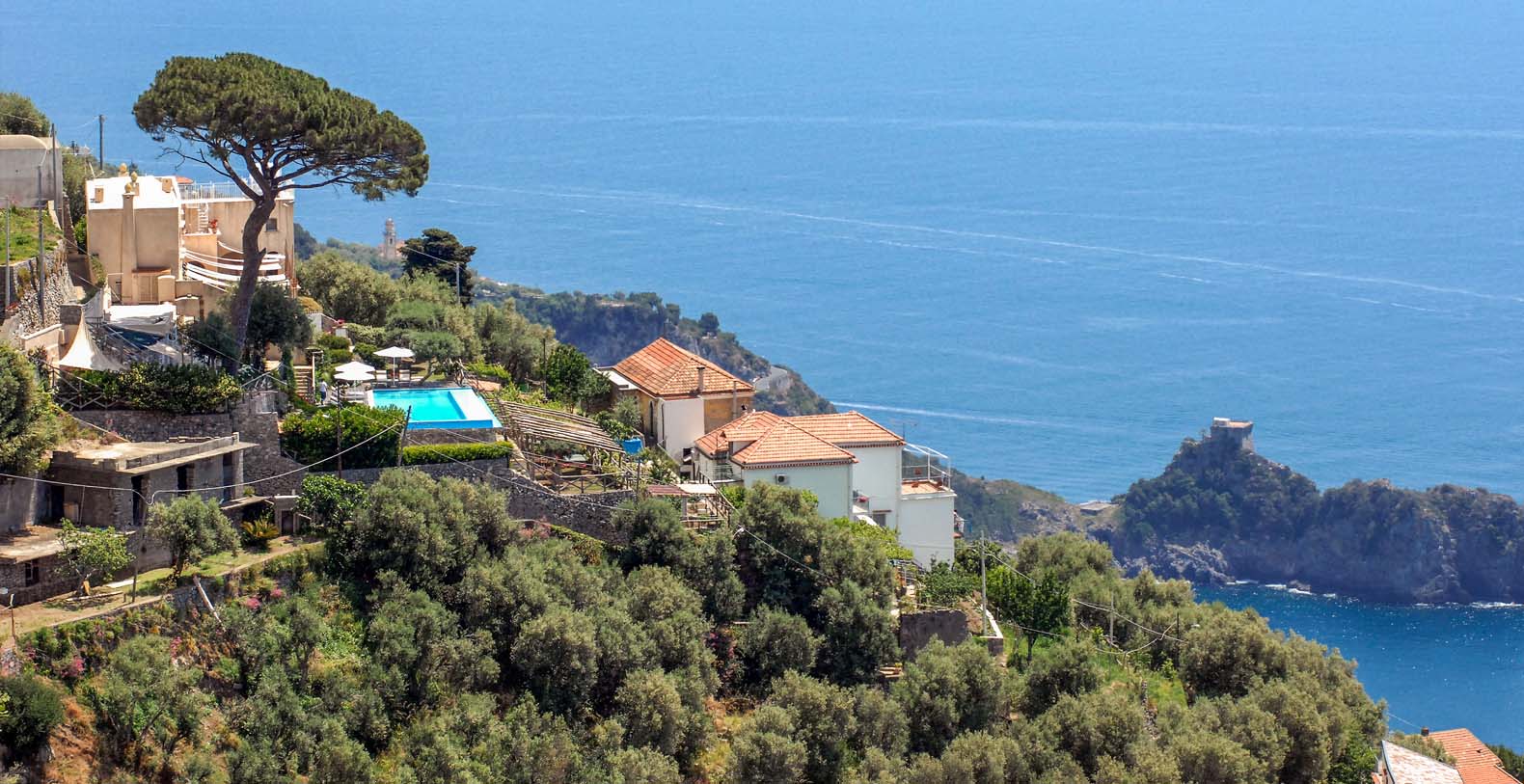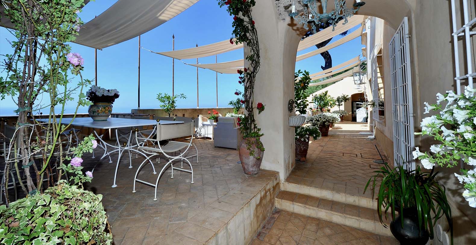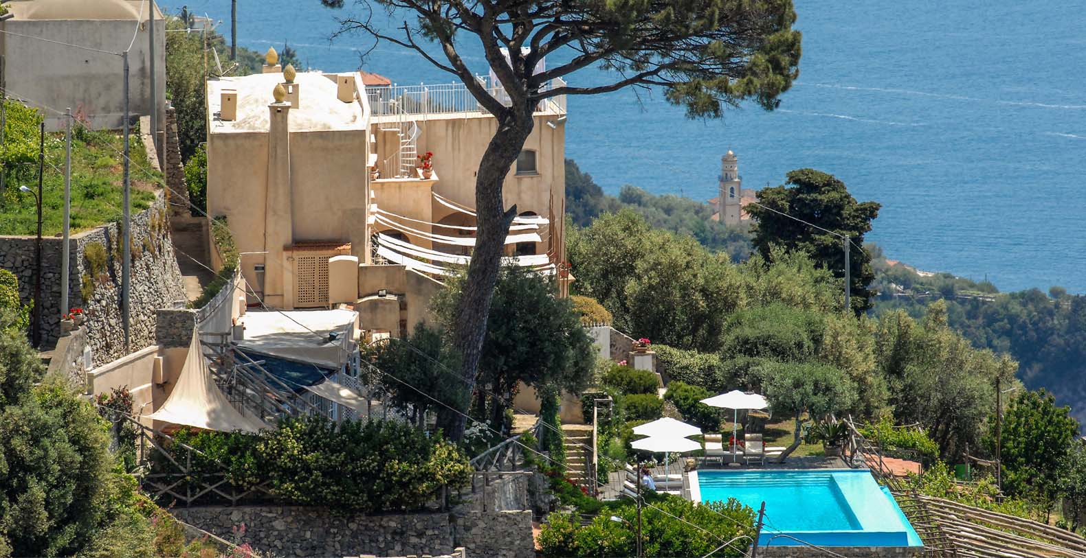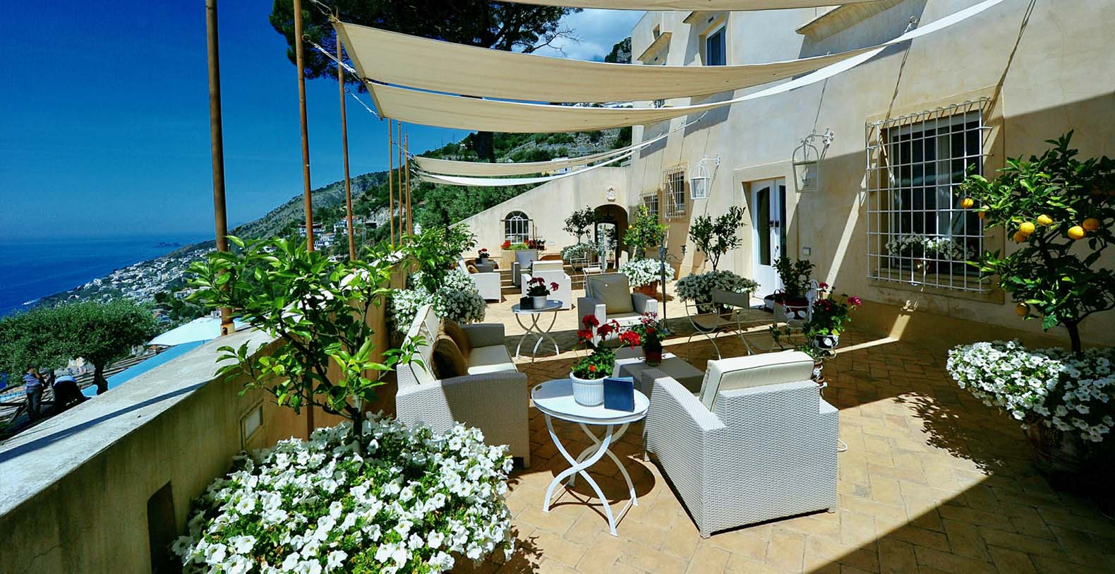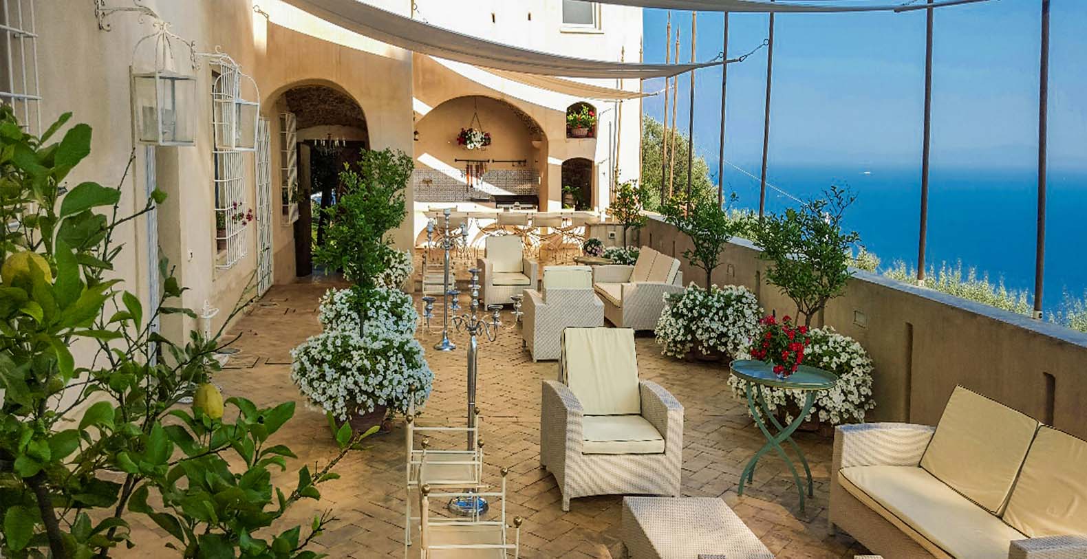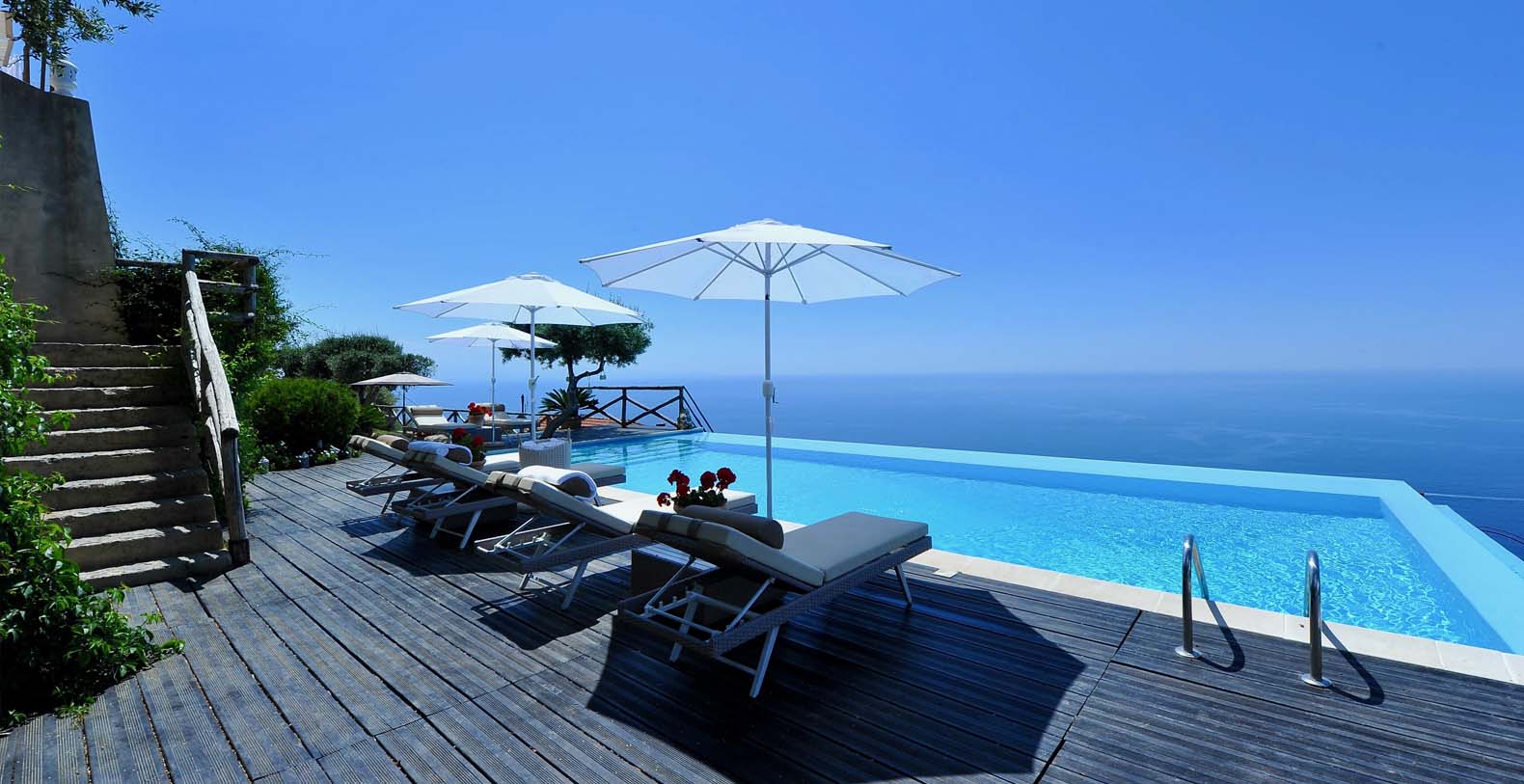 The villa is composed by two areas, the main villa and the annex, called limonaia (lemon house); the first features three double bedrooms with king size beds each with private bathroom, one with a stunning private sun terrace and solarium boasting a breath-taking panoramic view, all of them offering sea view. The limonaia offers a double bedroomed suite for 4 people with private bathroom, making this villa perfect for families with visiting friends. The property overlooks a garden with ancient olive trees and a unique view of the sea, together with a sea-salt infinity swimming pool which is one of the ten bests of the entire Amalfi Coast.