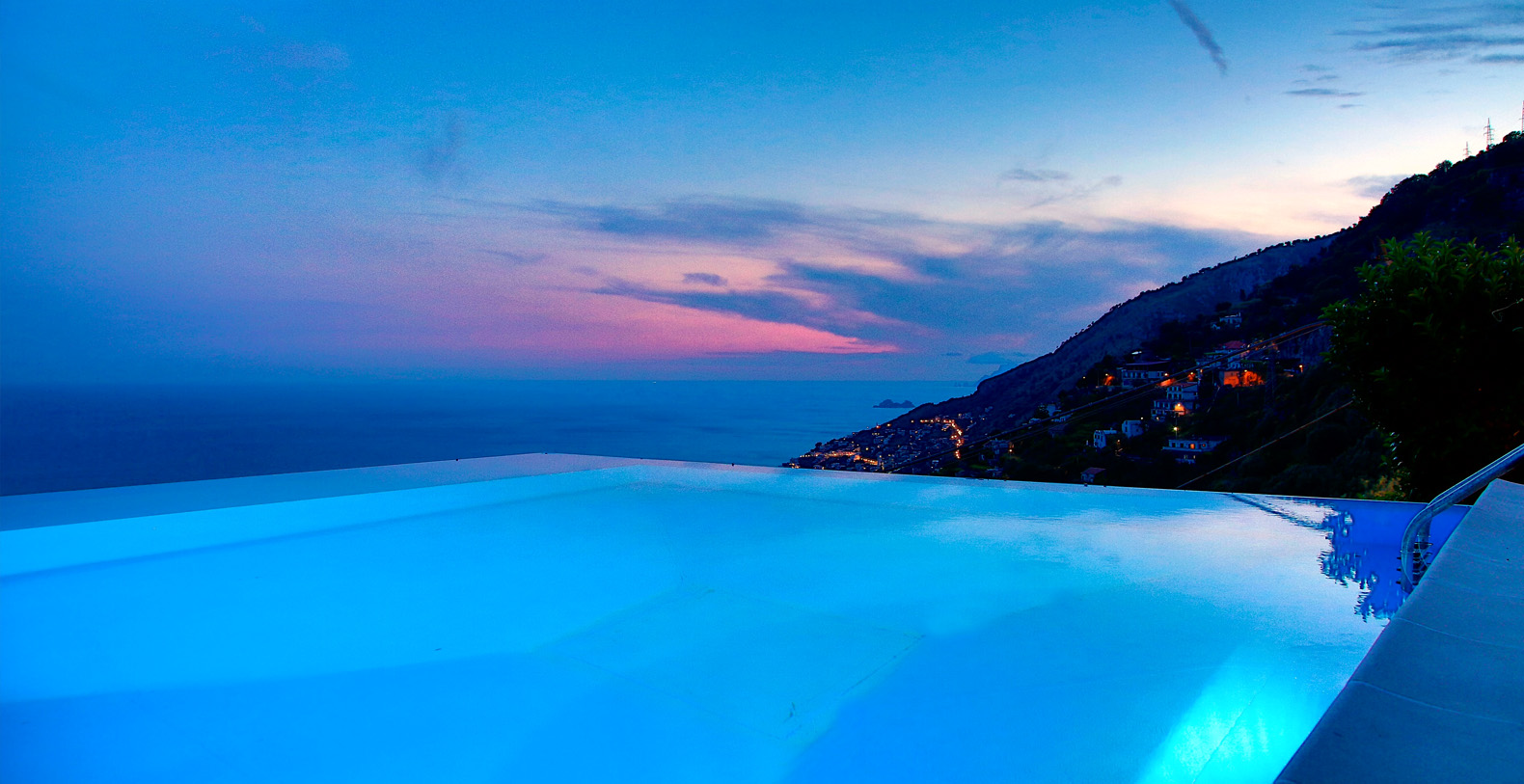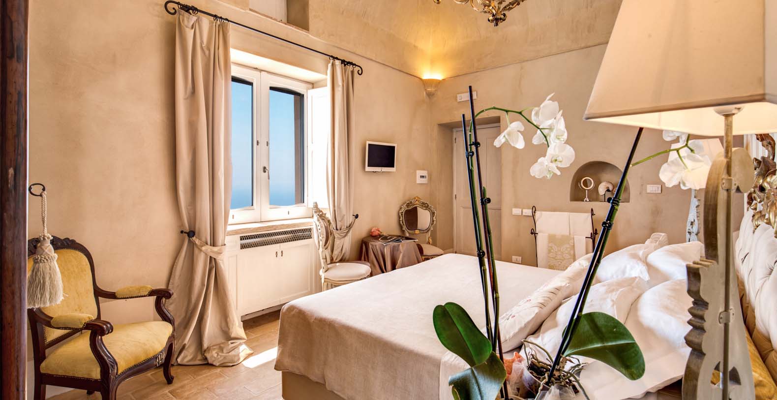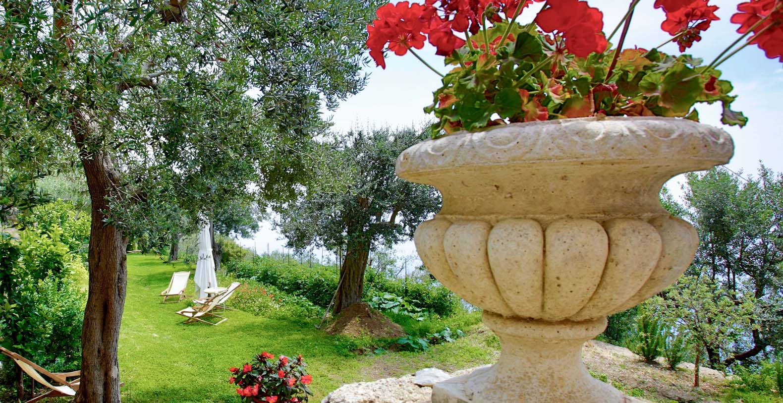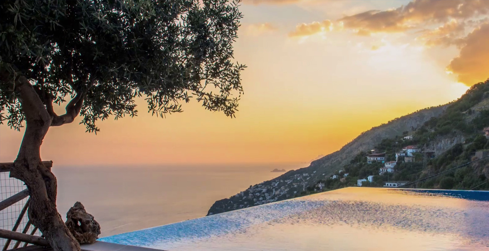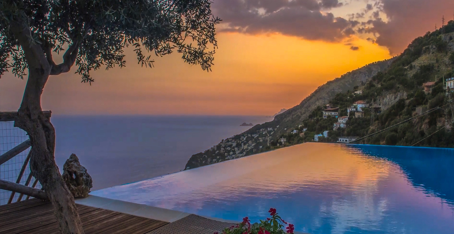 The villa is composed by two areas, the main villa and the annex, called limonaia (lemon house); the first features three double bedrooms with king size beds each with private bathroom, one with a stunning private sun terrace and solarium boasting a breath-taking panoramic view, all of them offering sea view. The limonaia offers a double bedroomed suite for 4 people with private bathroom, making this villa perfect for families with visiting friends. The property overlooks a garden with ancient olive trees and a unique view of the sea, together with a sea-salt infinity swimming pool which is one of the ten bests of the entire Amalfi Coast.