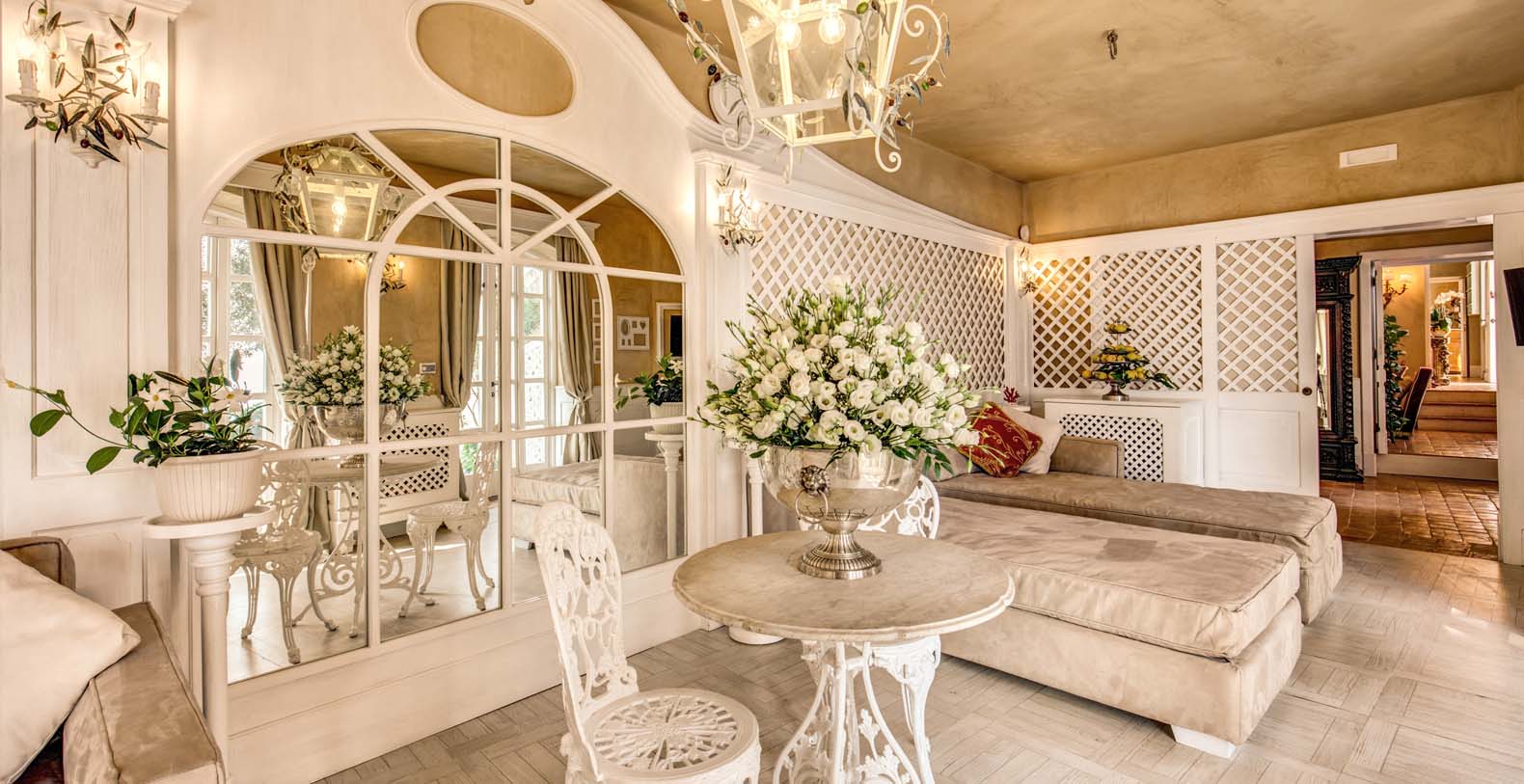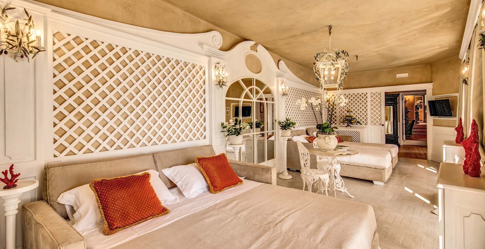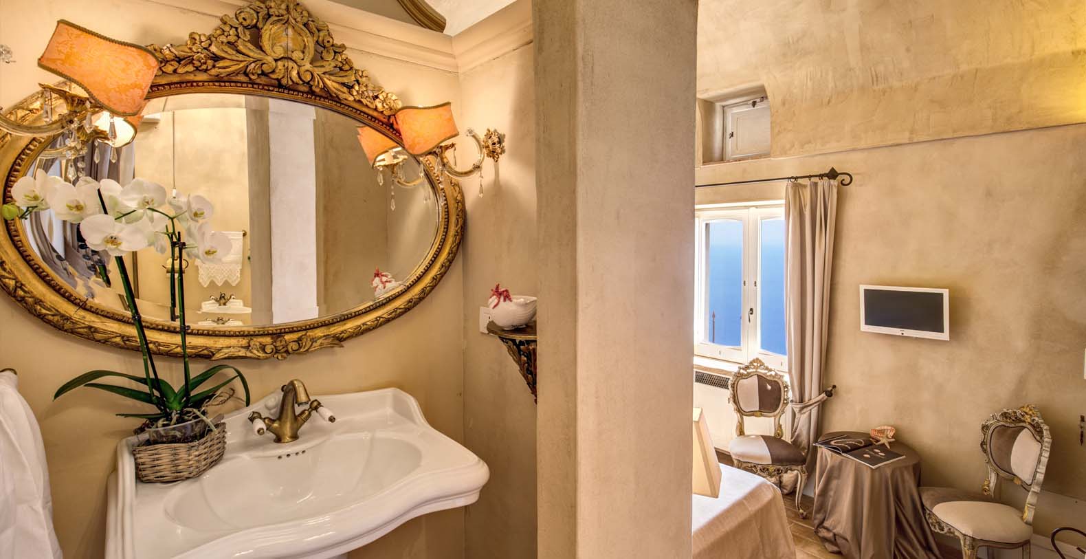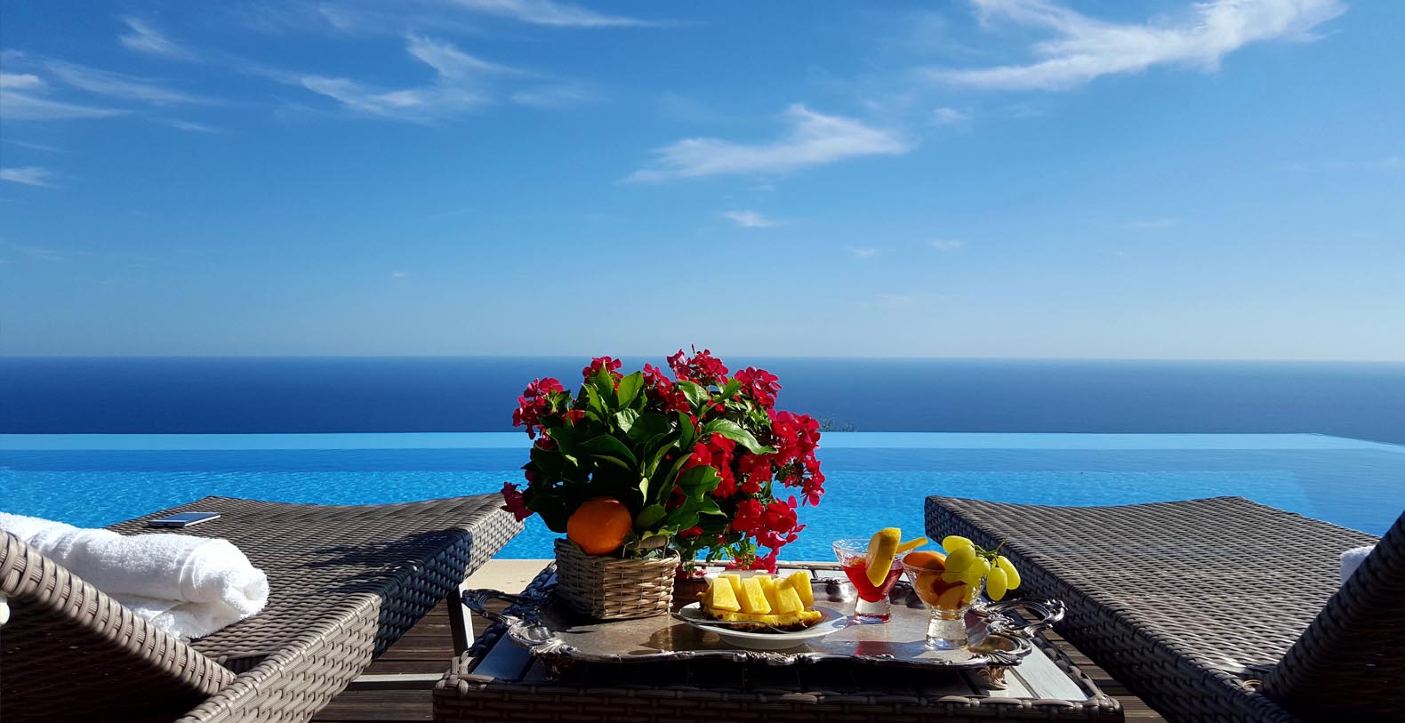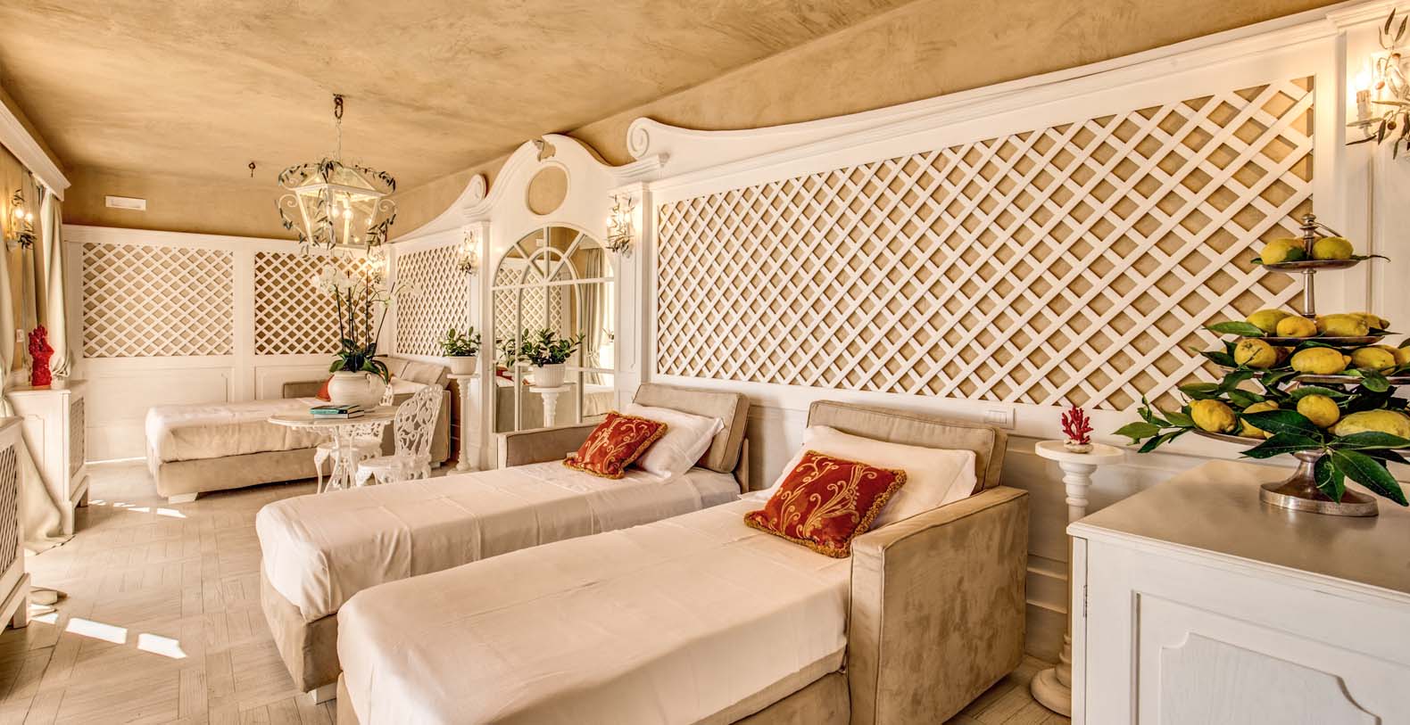 The villa is composed by two areas, the main villa and the annex, called limonaia (lemon house); the first features three double bedrooms with king size beds each with private bathroom, one with a stunning private sun terrace and solarium boasting a breath-taking panoramic view, all of them offering sea view. The limonaia offers a double bedroomed suite for 4 people with private bathroom, making this villa perfect for families with visiting friends. The property overlooks a garden with ancient olive trees and a unique view of the sea, together with a sea-salt infinity swimming pool which is one of the ten bests of the entire Amalfi Coast.