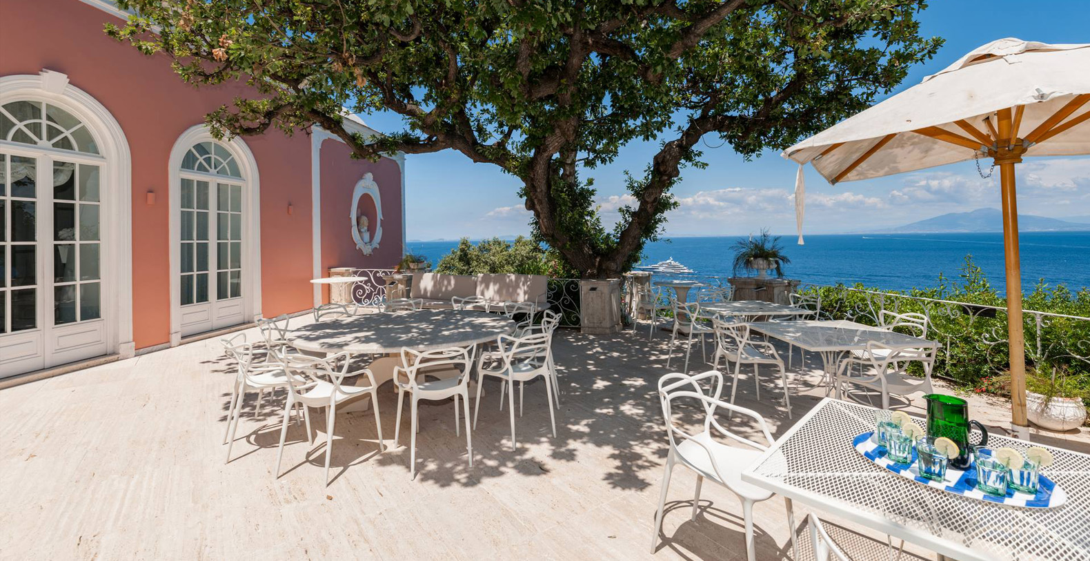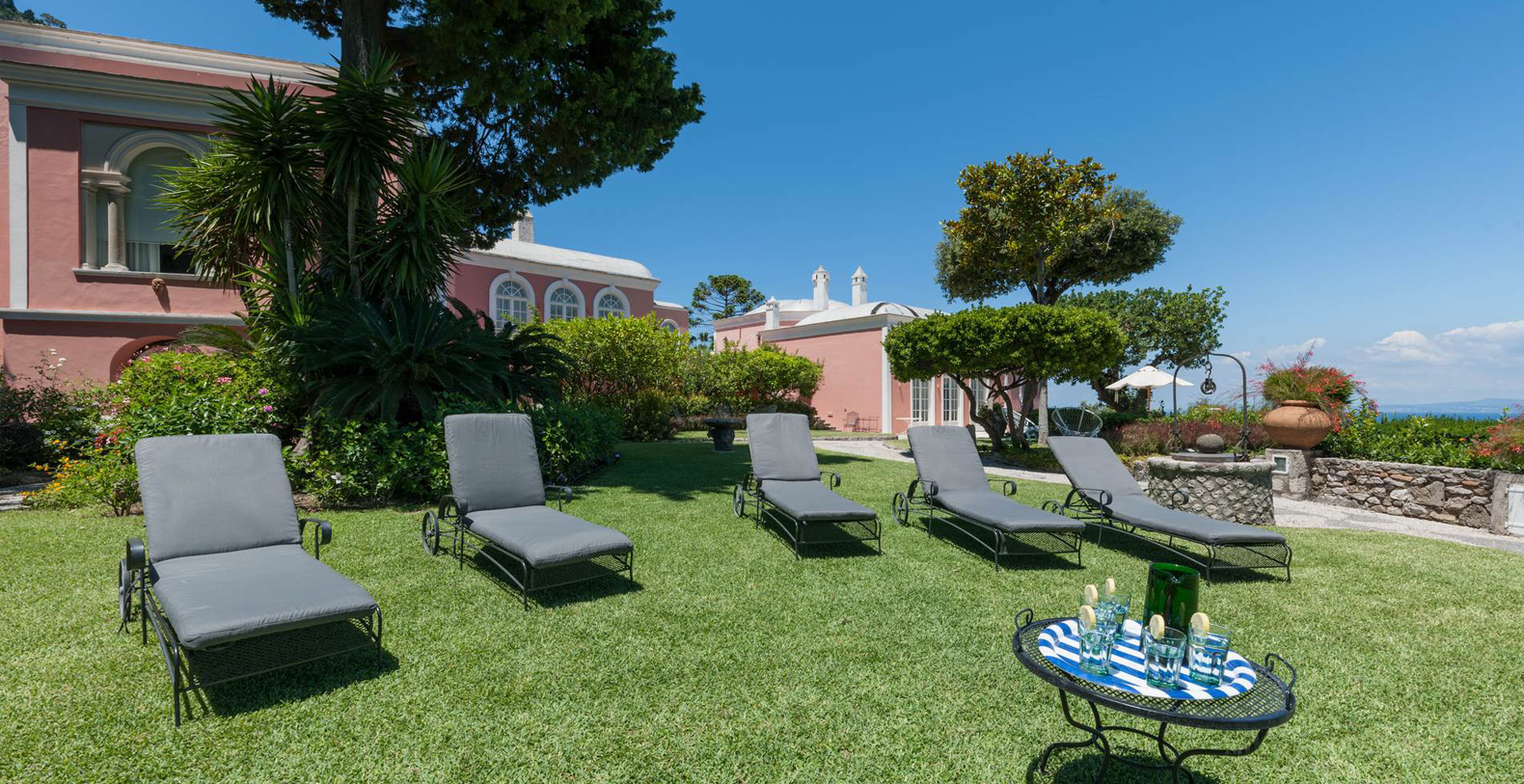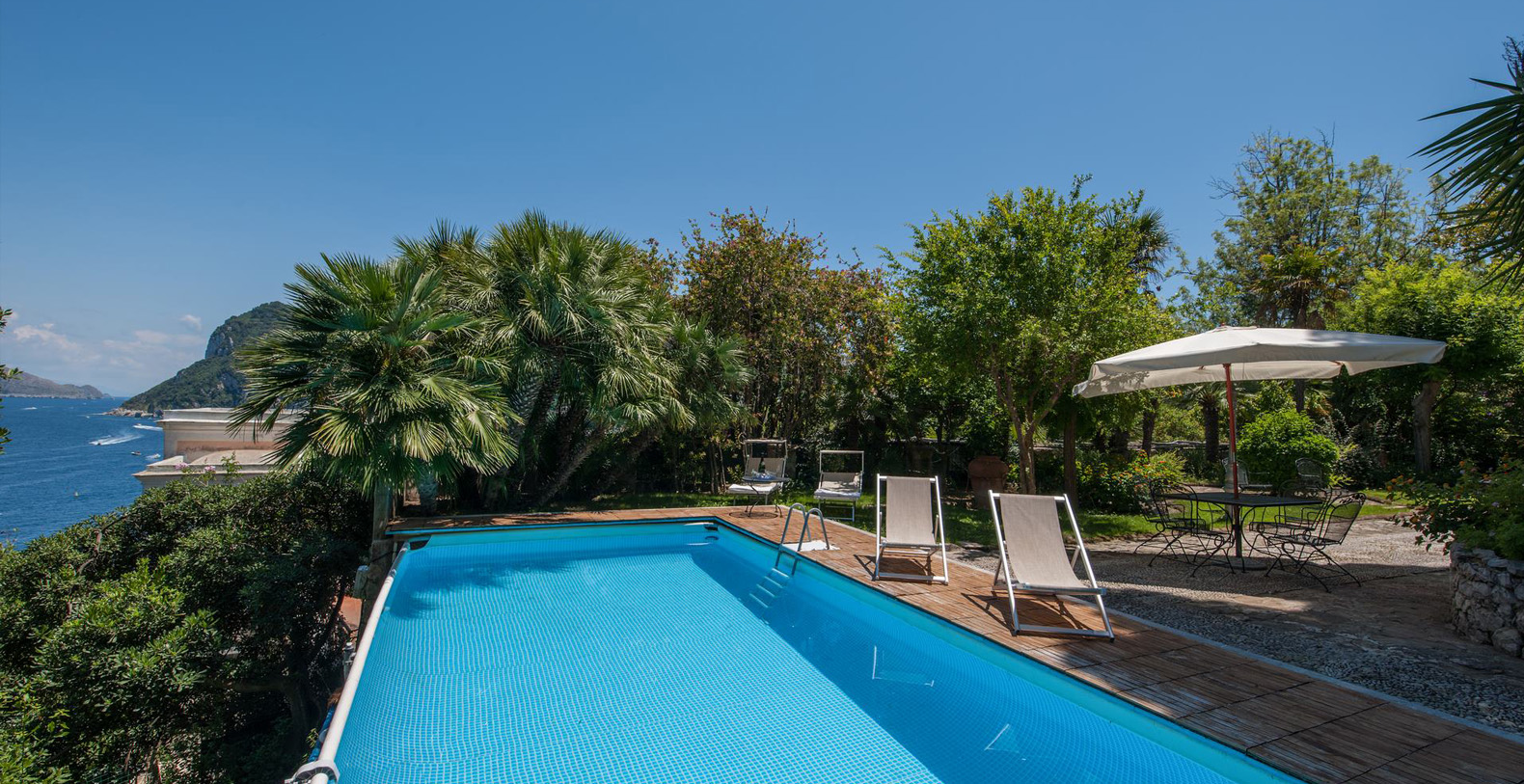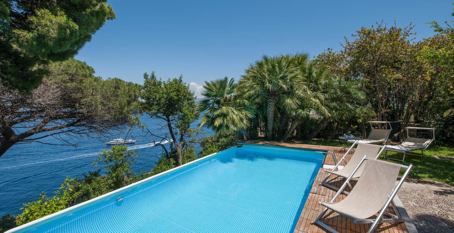 A lovely area in the garden is the large, marble paved terrace facing the sea and offering the best views out onto the bay of Naples. The terrace is furnished with iron cast tables, lounge chairs, and benches where guests can enjoy the silent sounds of the sea below and listen with pleasure to the boats silently passing by the waterfront from the Grotta Azzurra. Here one can truly admire the wonders of nature while enjoying its peace and quiet. A large round table with chairs and a second, rectangular table with chars, as well as several smaller tables with chairs and benches make up super comfortable garden seating areas and more than enough space for outdoor dining for the largest of groups. An easy, panoramic, and comfortable pedestrian path of about 150 steps leads from the garden down to the sea, passing through a pleasant, shaded wooded area filled with olive trees and Mediterranean herbs. The path leads to a private sundeck, platform, and boat dock. The area is furnished with lounge chairs, umbrellas, & beach towels and cold drinks and snacks can be stocked in the refrigerator and kitchenette located at sea level. Staff can serve lunch here as well.