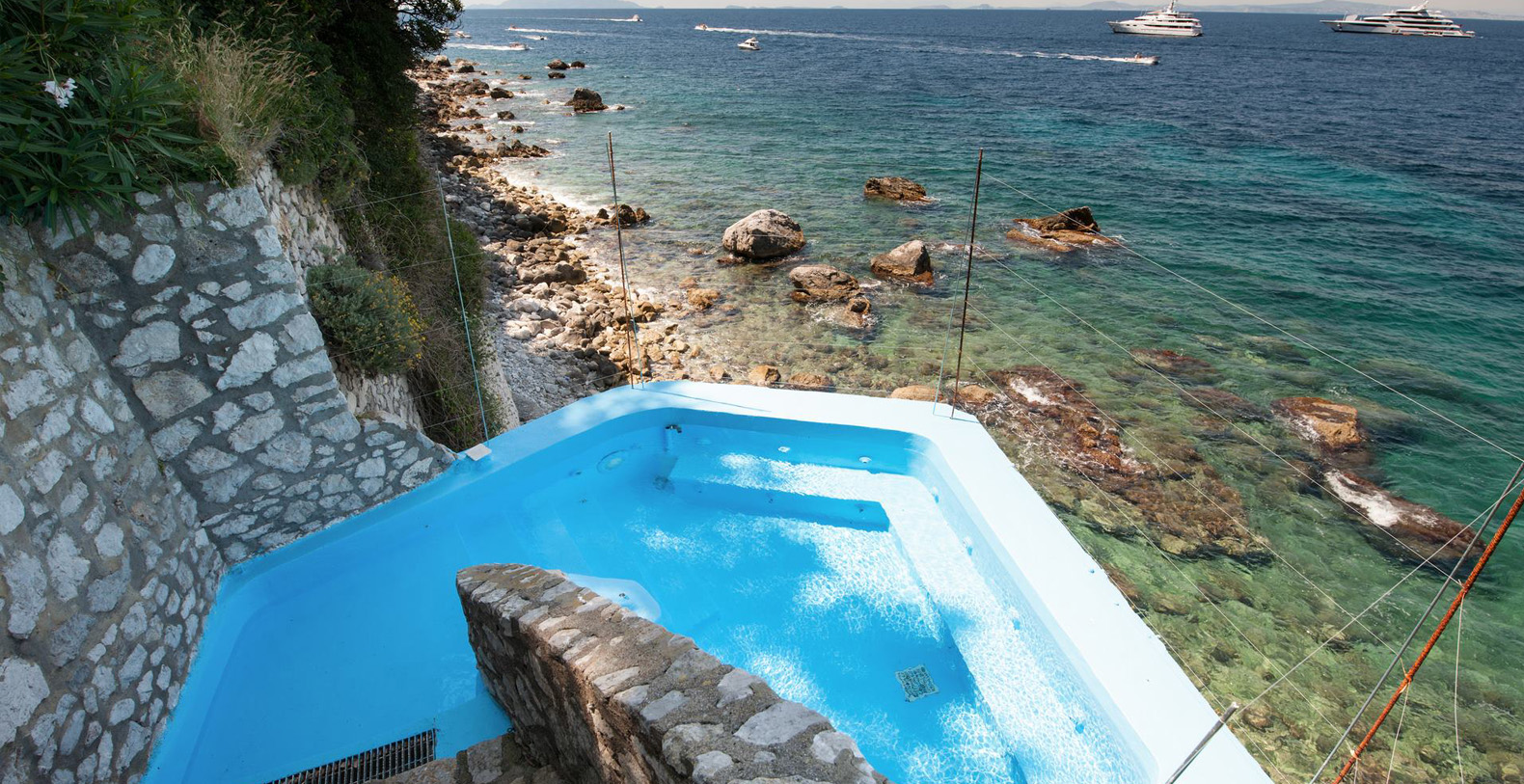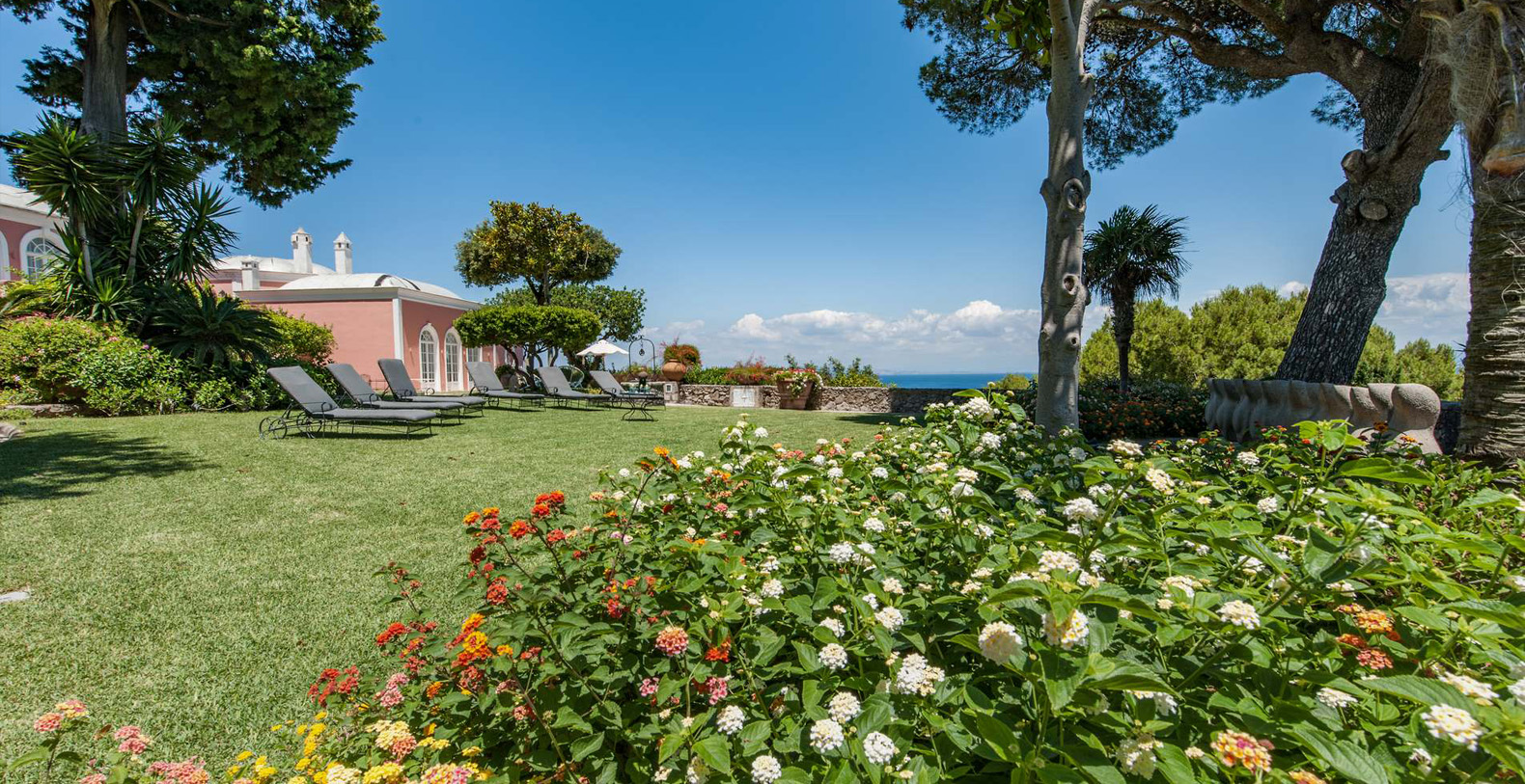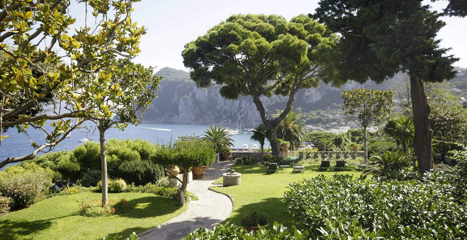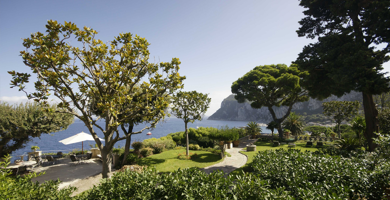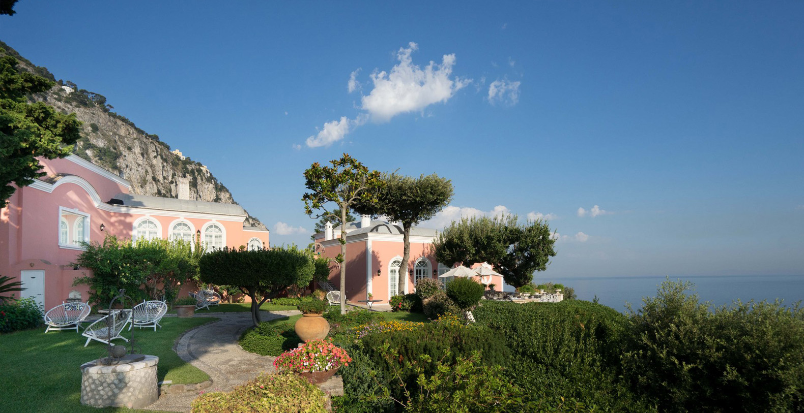 A lovely area in the garden is the large, marble paved terrace facing the sea and offering the best views out onto the bay of Naples. The terrace is furnished with iron cast tables, lounge chairs, and benches where guests can enjoy the silent sounds of the sea below and listen with pleasure to the boats silently passing by the waterfront from the Grotta Azzurra. Here one can truly admire the wonders of nature while enjoying its peace and quiet. A large round table with chairs and a second, rectangular table with chars, as well as several smaller tables with chairs and benches make up super comfortable garden seating areas and more than enough space for outdoor dining for the largest of groups. An easy, panoramic, and comfortable pedestrian path of about 150 steps leads from the garden down to the sea, passing through a pleasant, shaded wooded area filled with olive trees and Mediterranean herbs. The path leads to a private sundeck, platform, and boat dock. The area is furnished with lounge chairs, umbrellas, & beach towels and cold drinks and snacks can be stocked in the refrigerator and kitchenette located at sea level. Staff can serve lunch here as well.