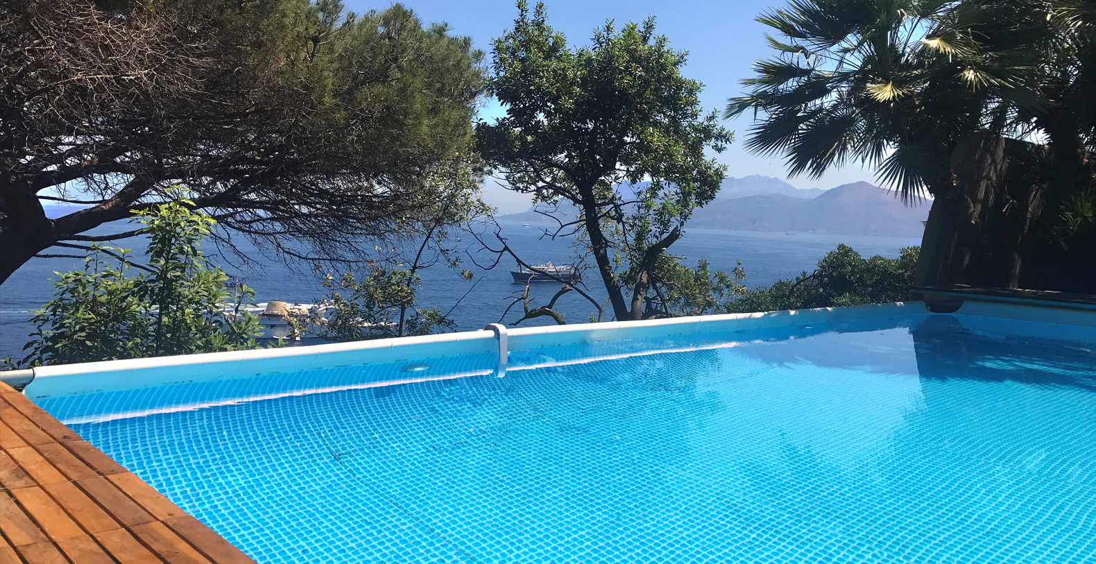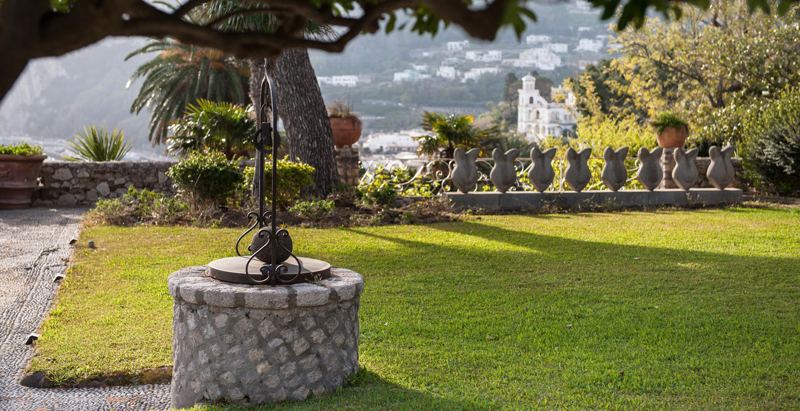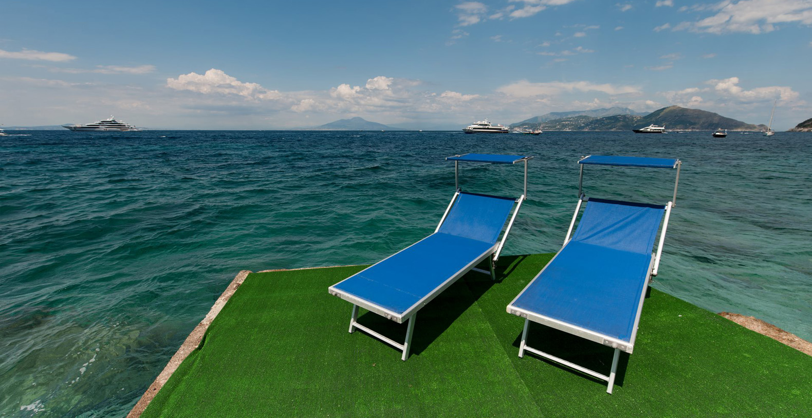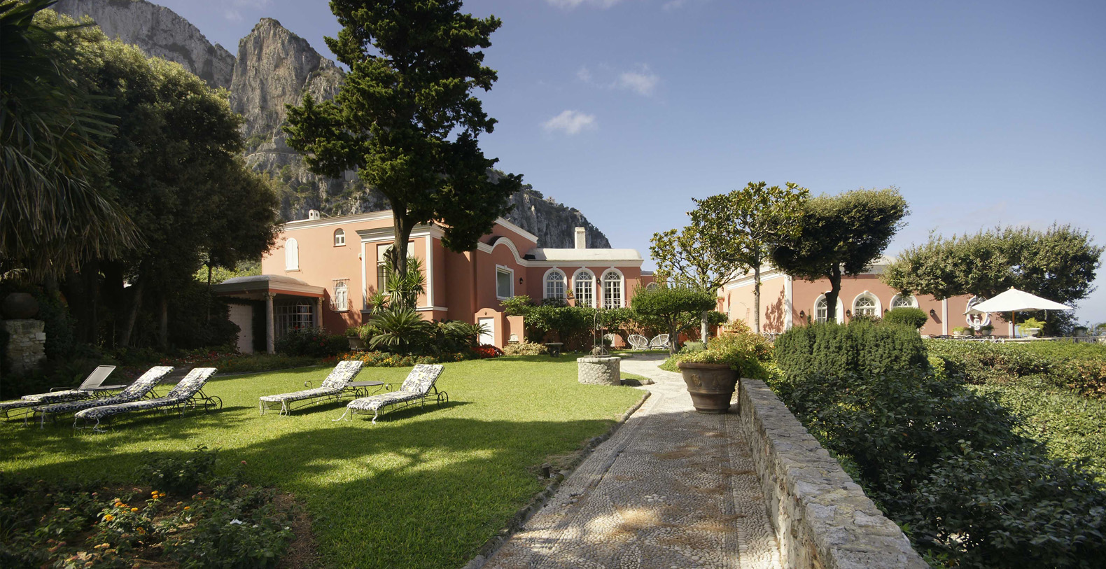 A lovely area in the garden is the large, marble paved terrace facing the sea and offering the best views out onto the bay of Naples. The terrace is furnished with iron cast tables, lounge chairs, and benches where guests can enjoy the silent sounds of the sea below and listen with pleasure to the boats silently passing by the waterfront from the Grotta Azzurra. Here one can truly admire the wonders of nature while enjoying its peace and quiet. A large round table with chairs and a second, rectangular table with chars, as well as several smaller tables with chairs and benches make up super comfortable garden seating areas and more than enough space for outdoor dining for the largest of groups. An easy, panoramic, and comfortable pedestrian path of about 150 steps leads from the garden down to the sea, passing through a pleasant, shaded wooded area filled with olive trees and Mediterranean herbs. The path leads to a private sundeck, platform, and boat dock. The area is furnished with lounge chairs, umbrellas, & beach towels and cold drinks and snacks can be stocked in the refrigerator and kitchenette located at sea level. Staff can serve lunch here as well.